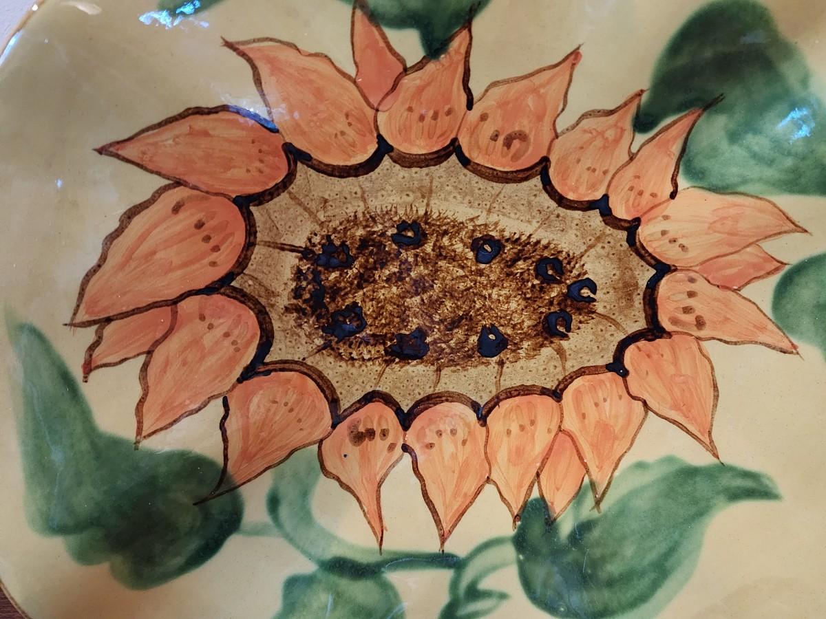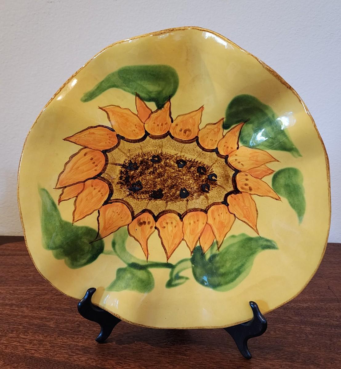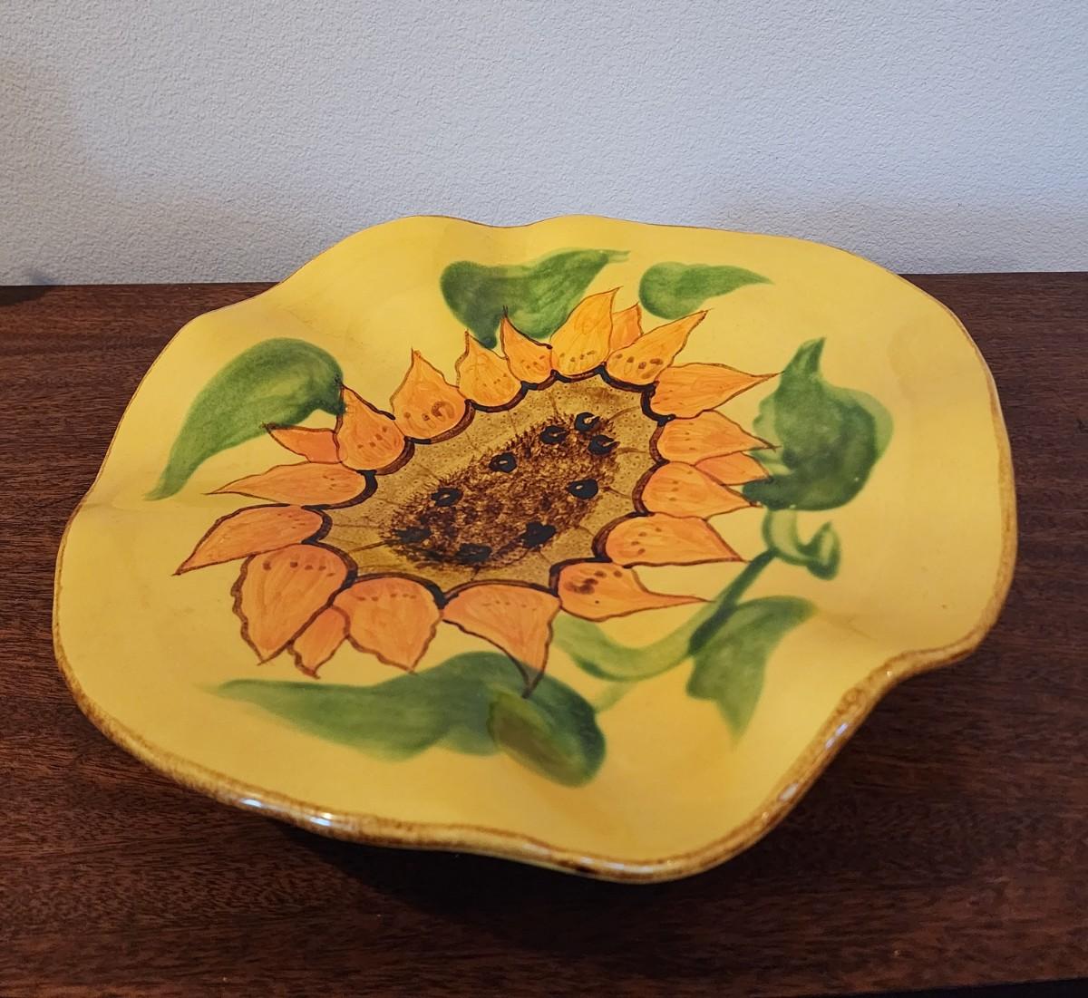 Beautiful hand painted freeform sunflower platter. Dishwasher safe. Excellent condition.