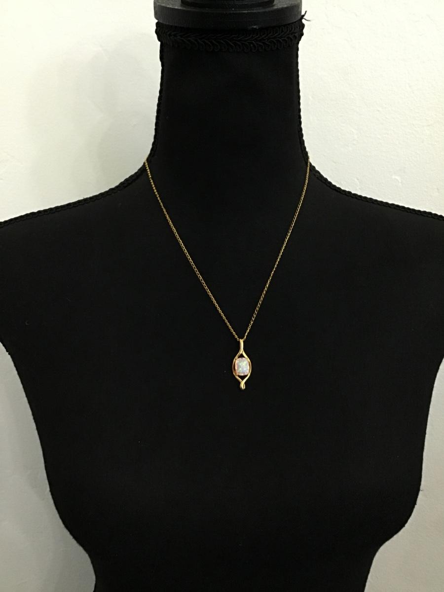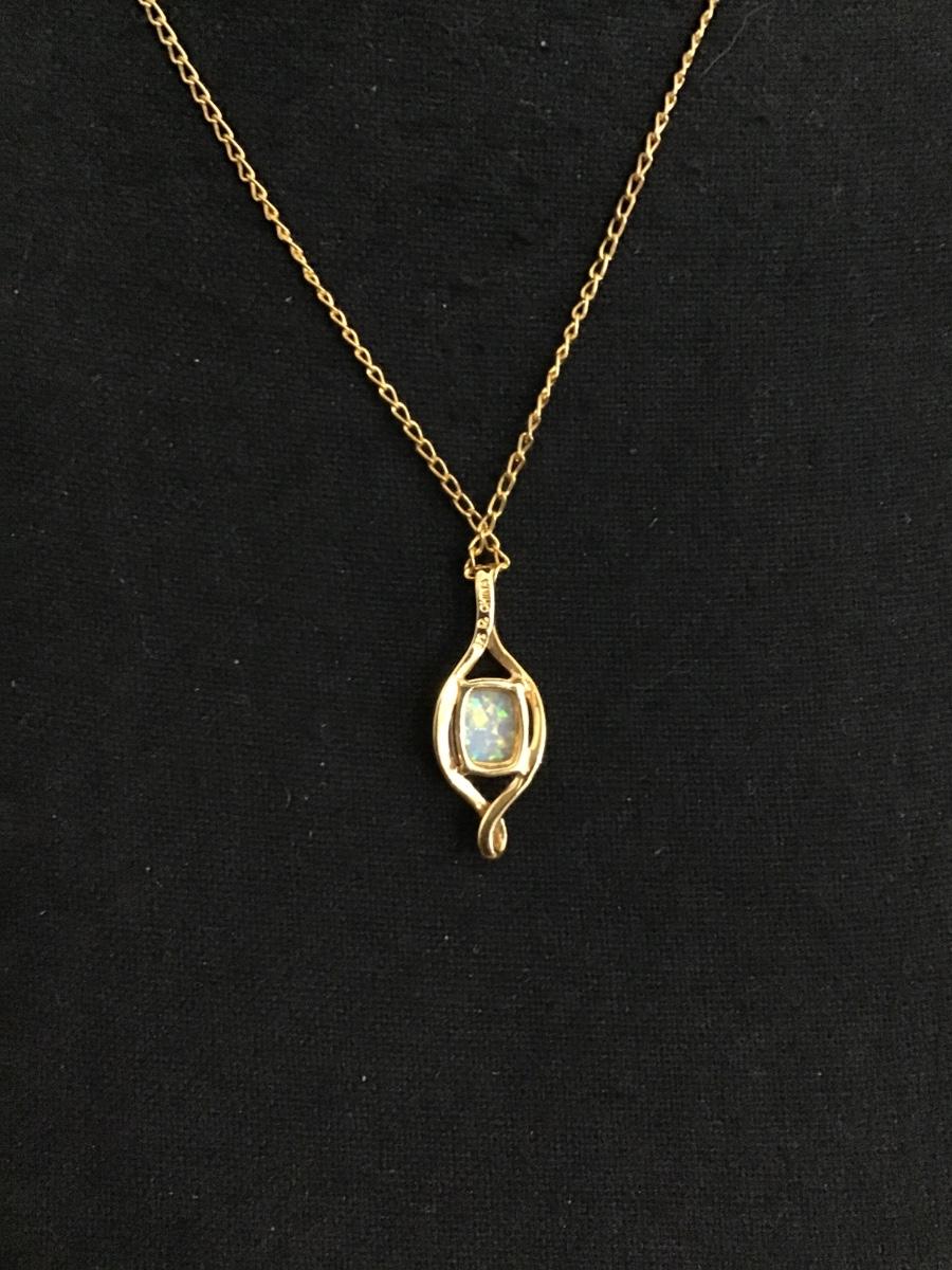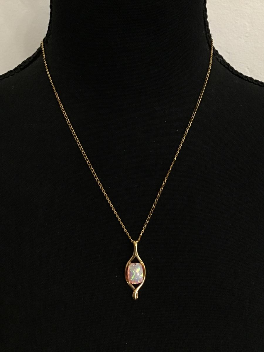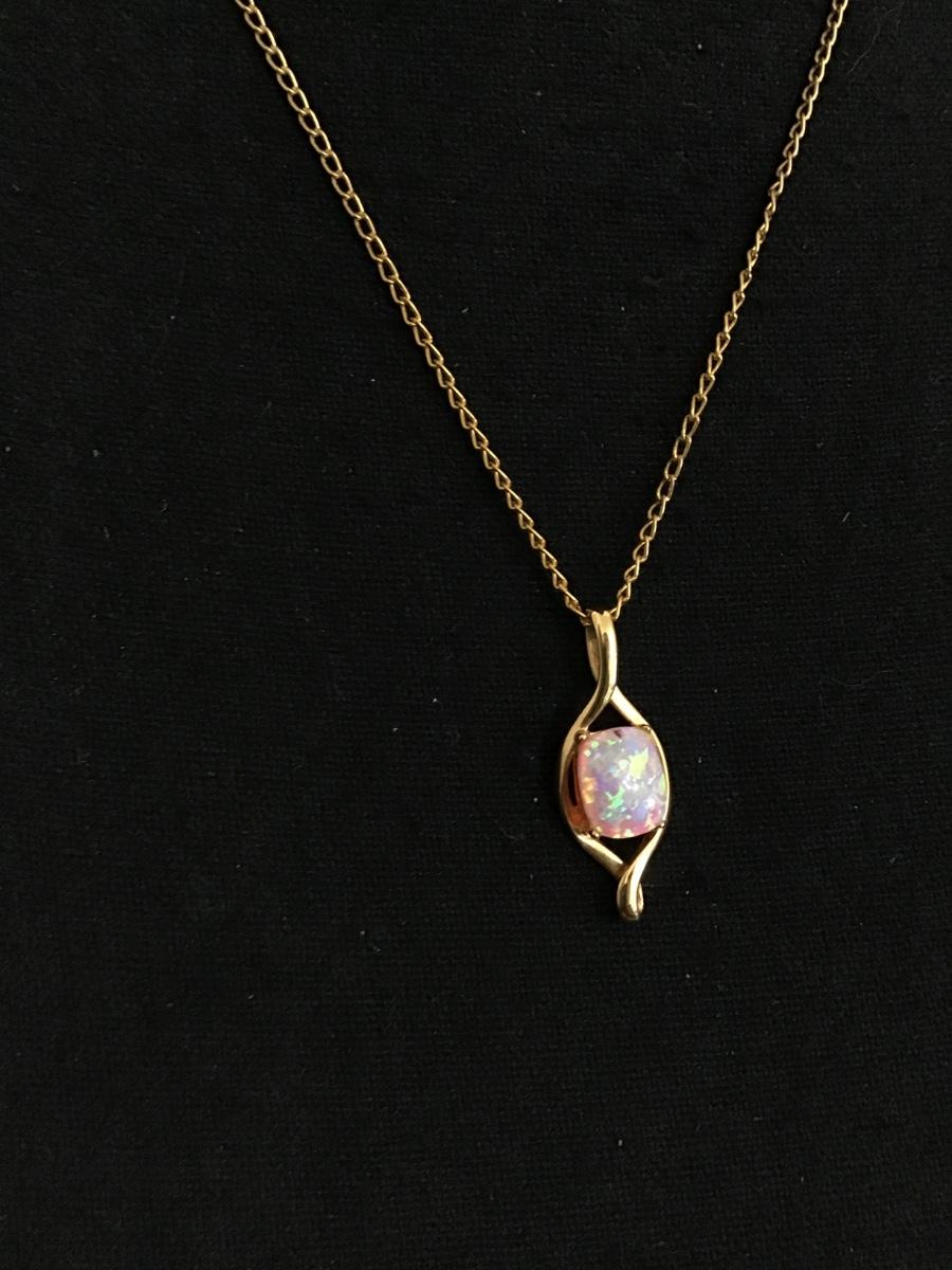 Beautiful 925 Silver China, opal, pink pendant, and gold tone chain necklace