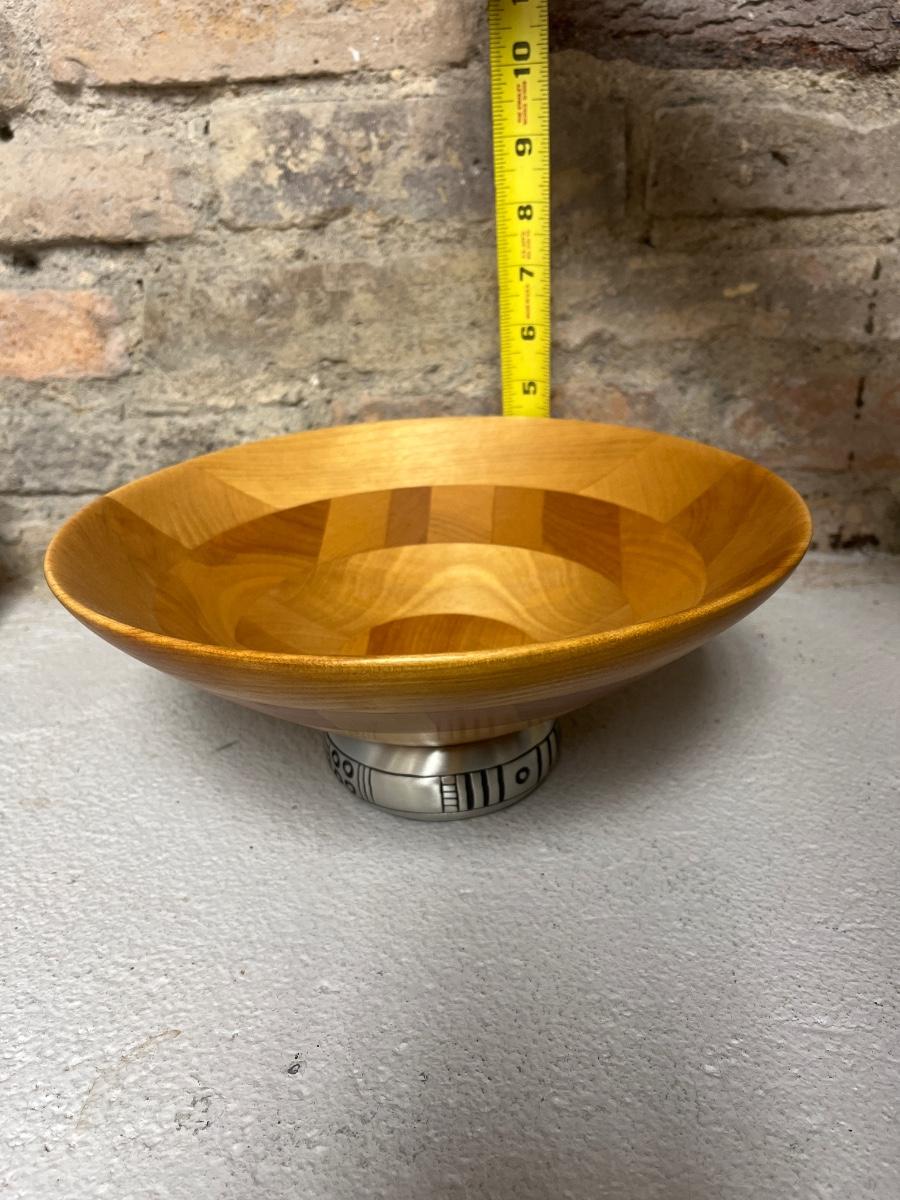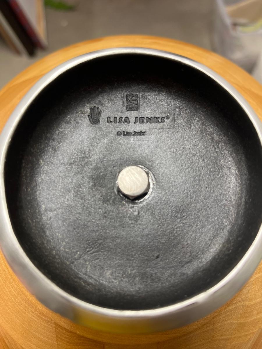 Lisa Jenks pewter and wood bowl with box, Charlotte van der Waals folding vase is approx 10”, and Alessi baby bathroom set