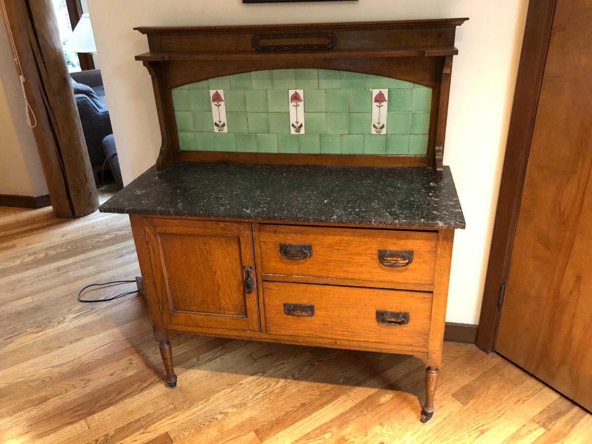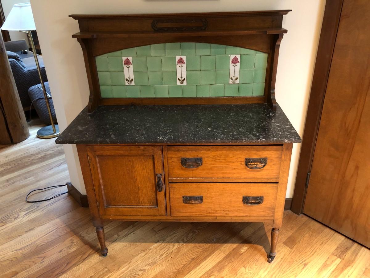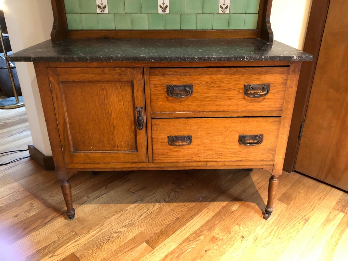 Beautiful Antique Oak Buffet Sideboard Table with Marble Top and Tile Back with Wheel Legs. Tile is a beautiful pale green. Black marble top. In very good condition.