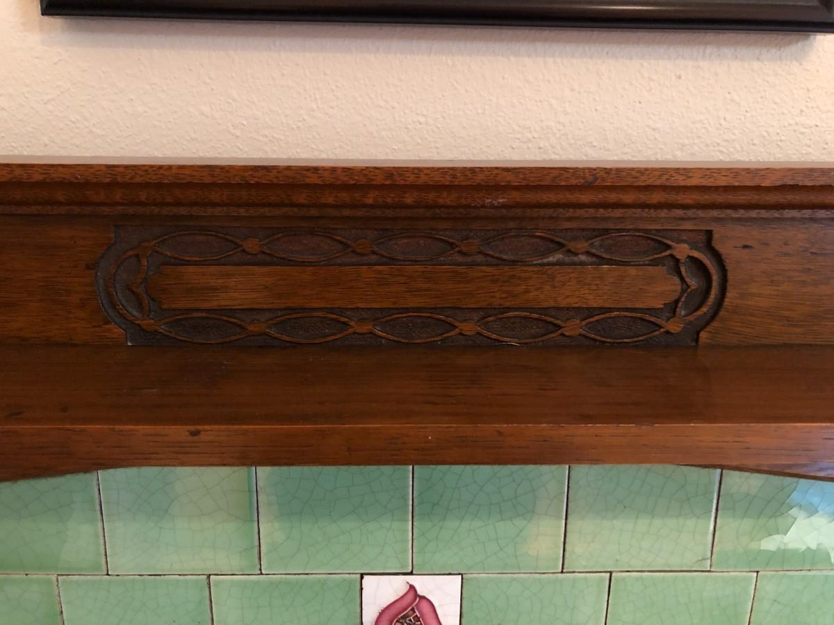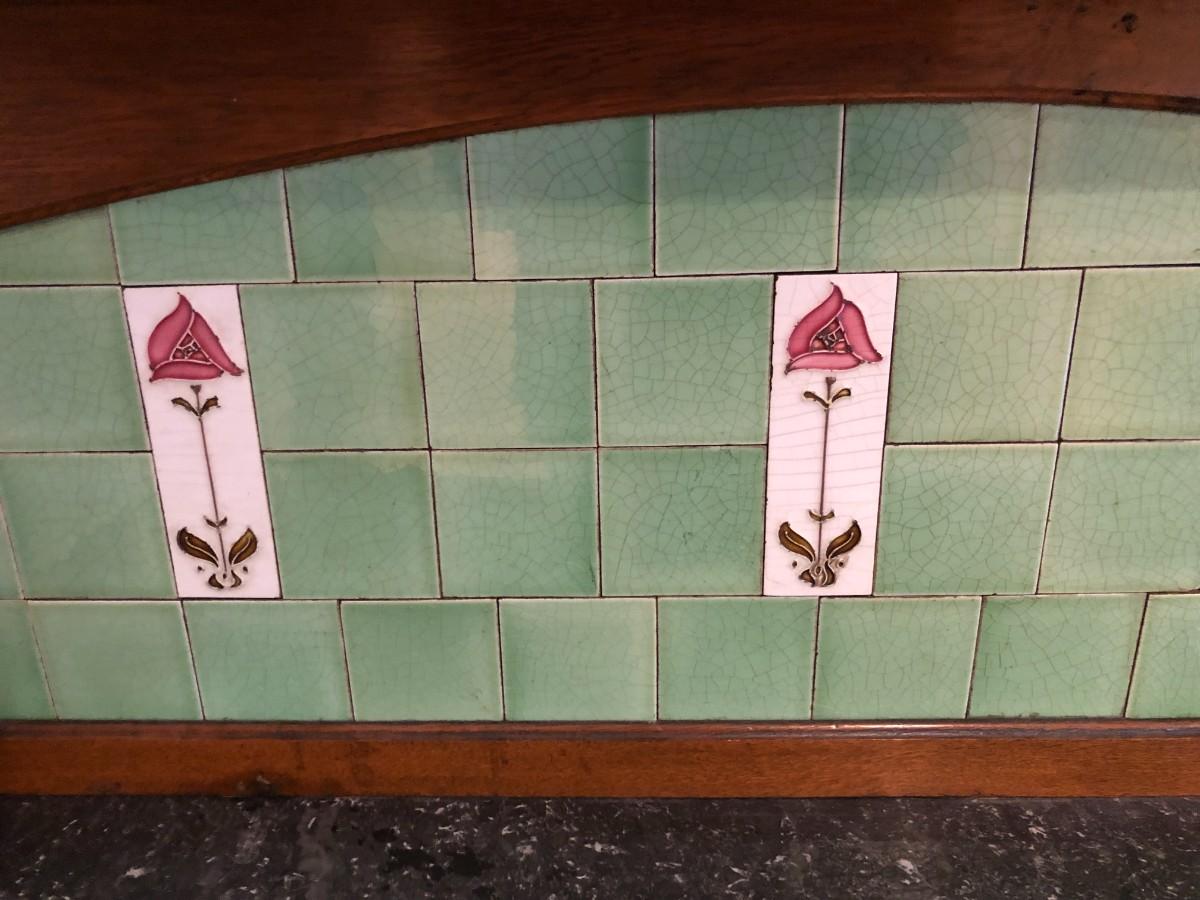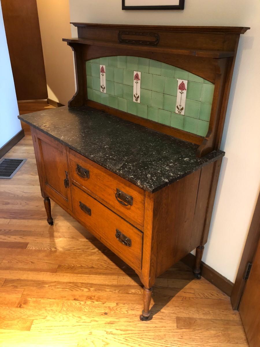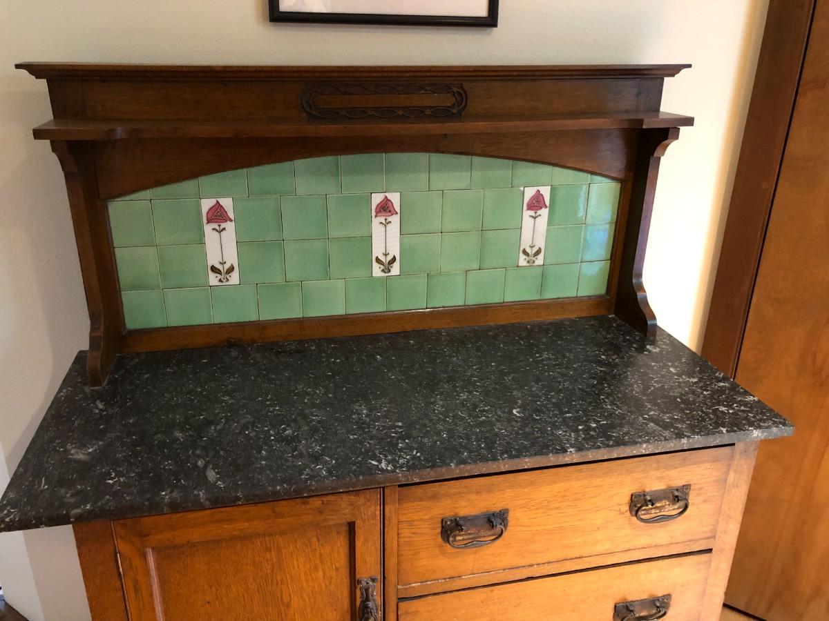 Beautiful Antique Oak Buffet Sideboard Table with Marble Top and Tile Back with Wheel Legs. Tile is a beautiful pale green. Black marble top. In very good condition.