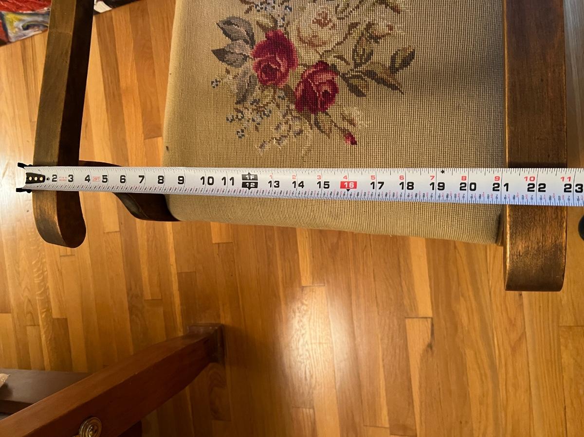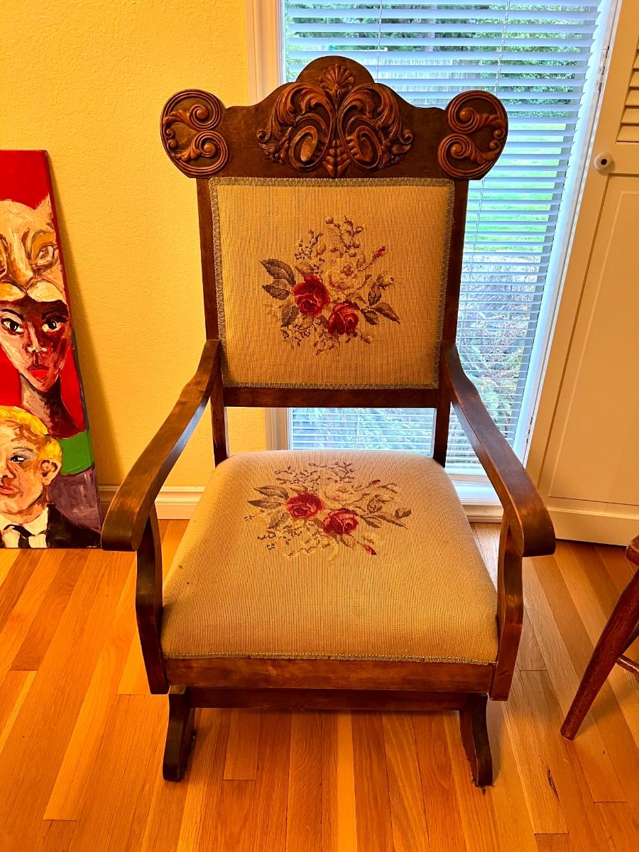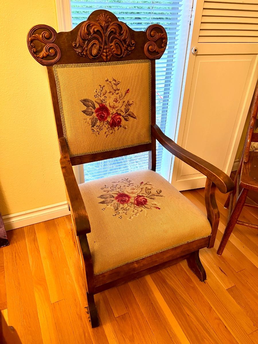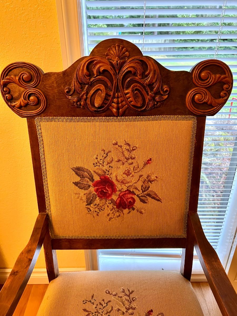 Beautiful Antique Carved Wood and Embroidered Armchair. Embroidery features red roses on tan fabric. In good condition, as shown.