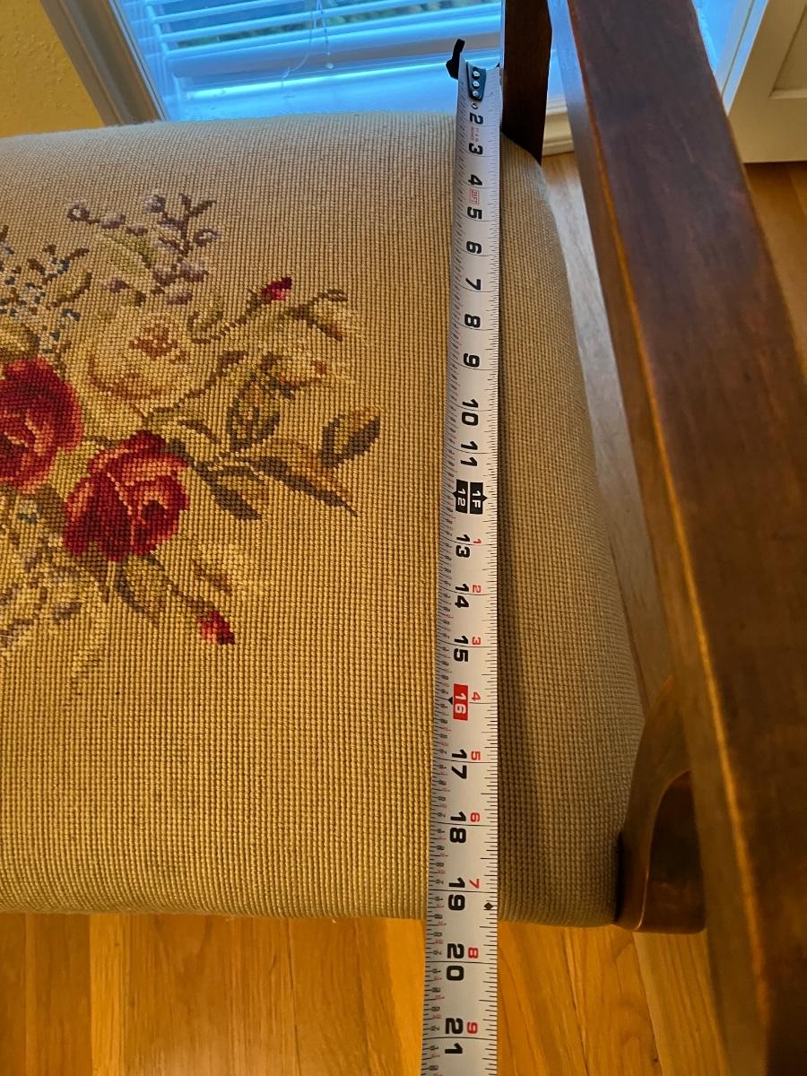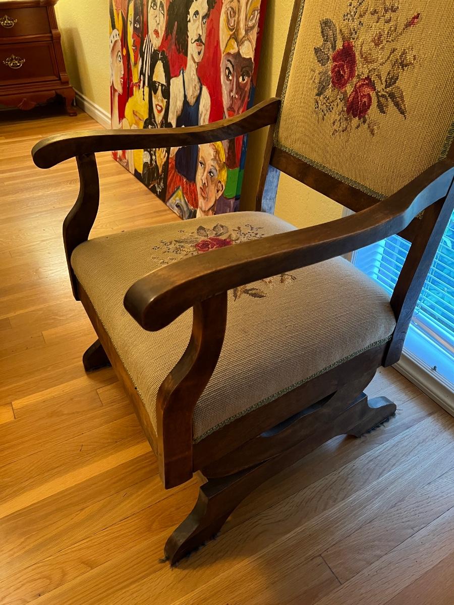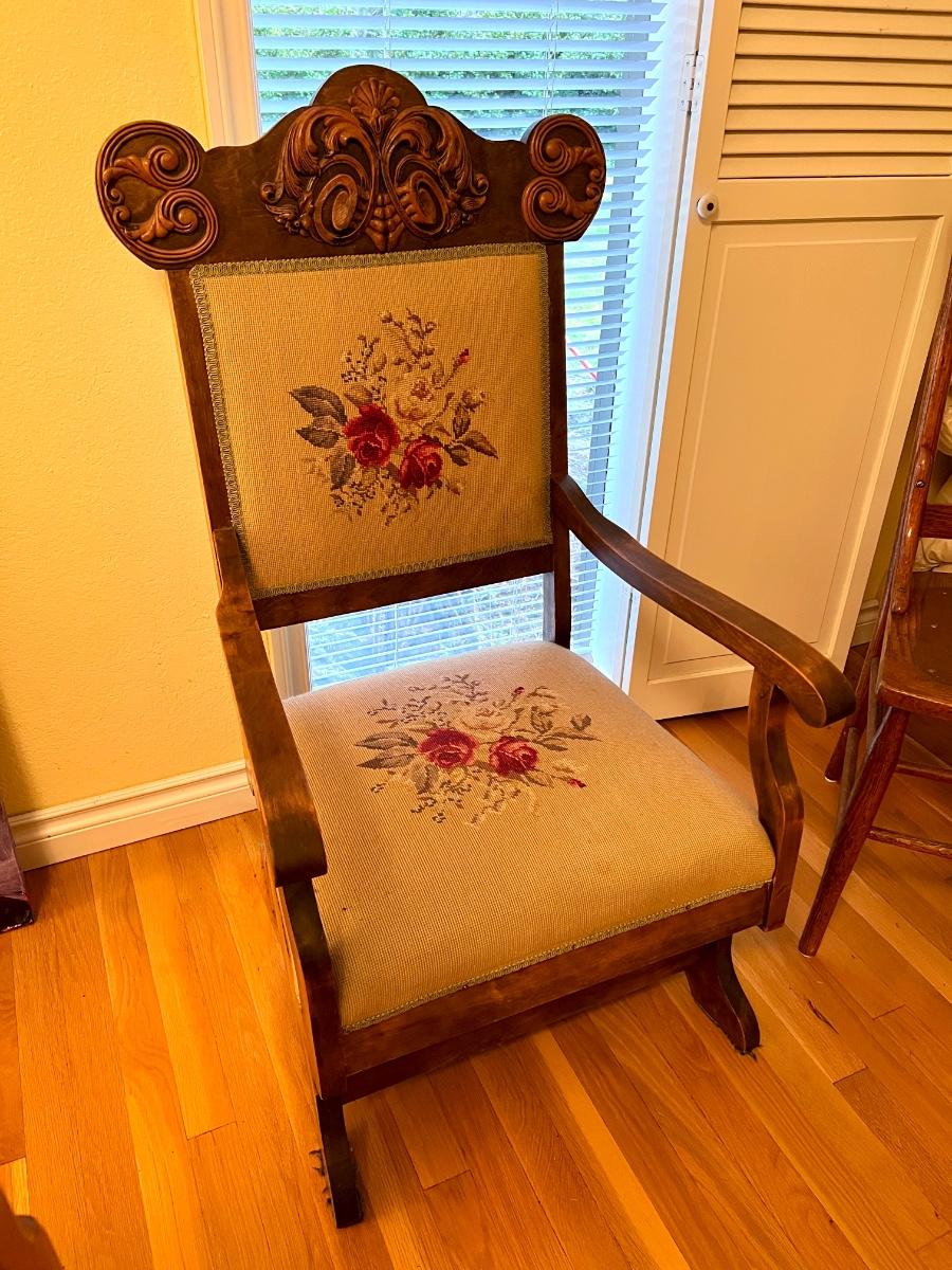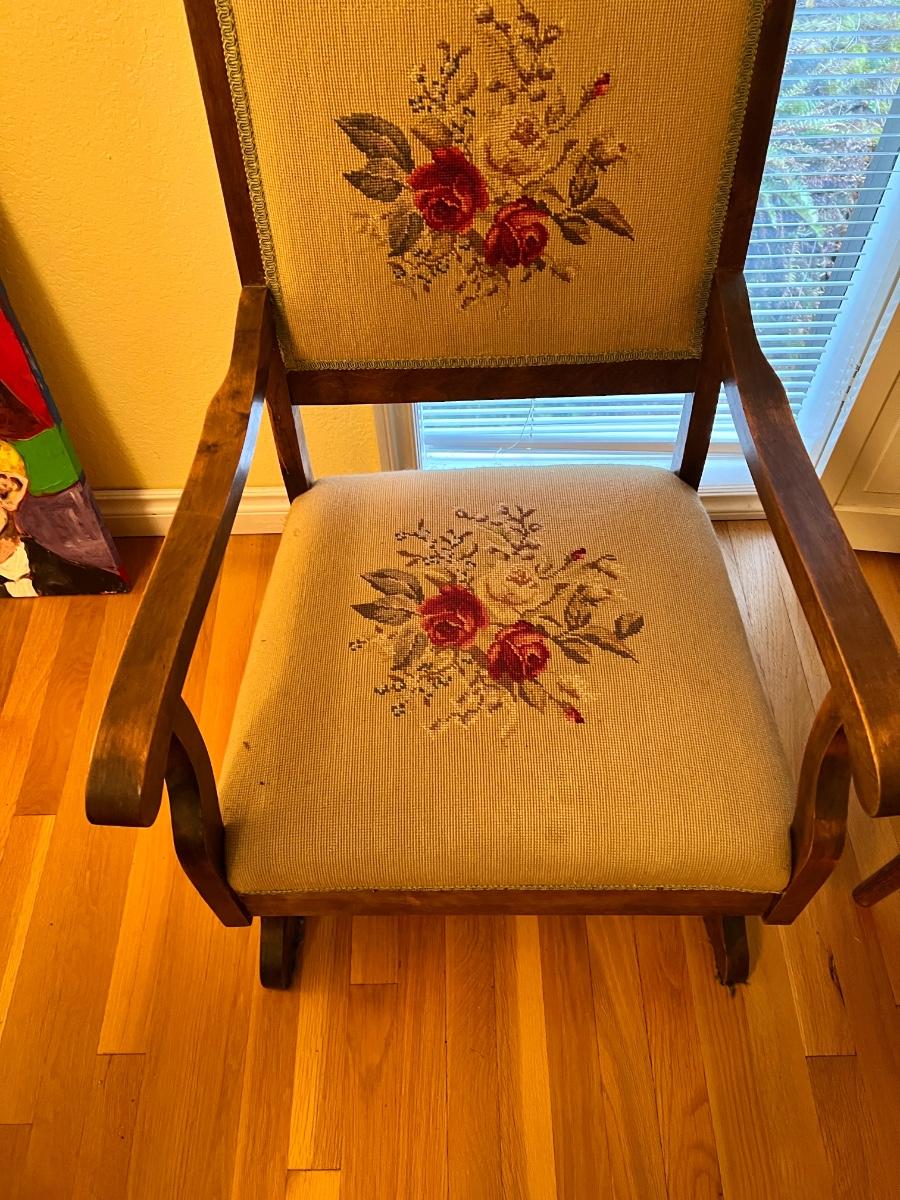 Beautiful Antique Carved Wood and Embroidered Armchair. Embroidery features red roses on tan fabric. In good condition, as shown.