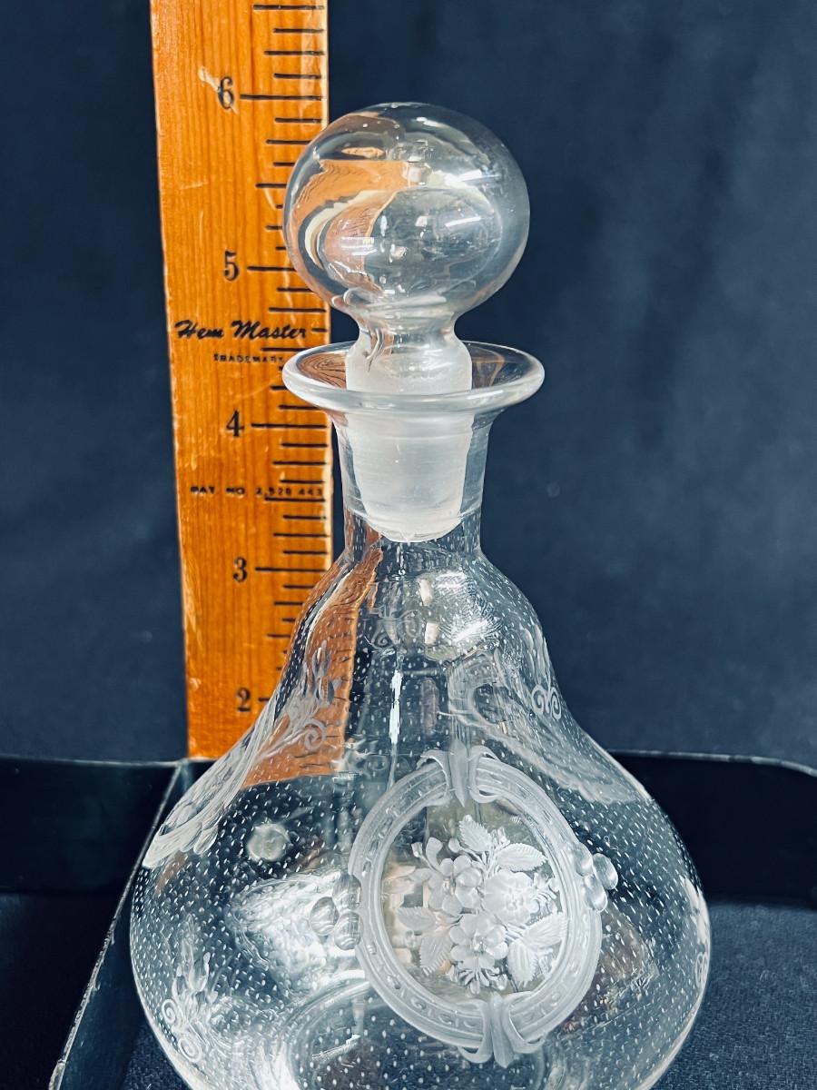 Beautiful Antique Etched Cut Glass Perfume Bottle Blown Stopper