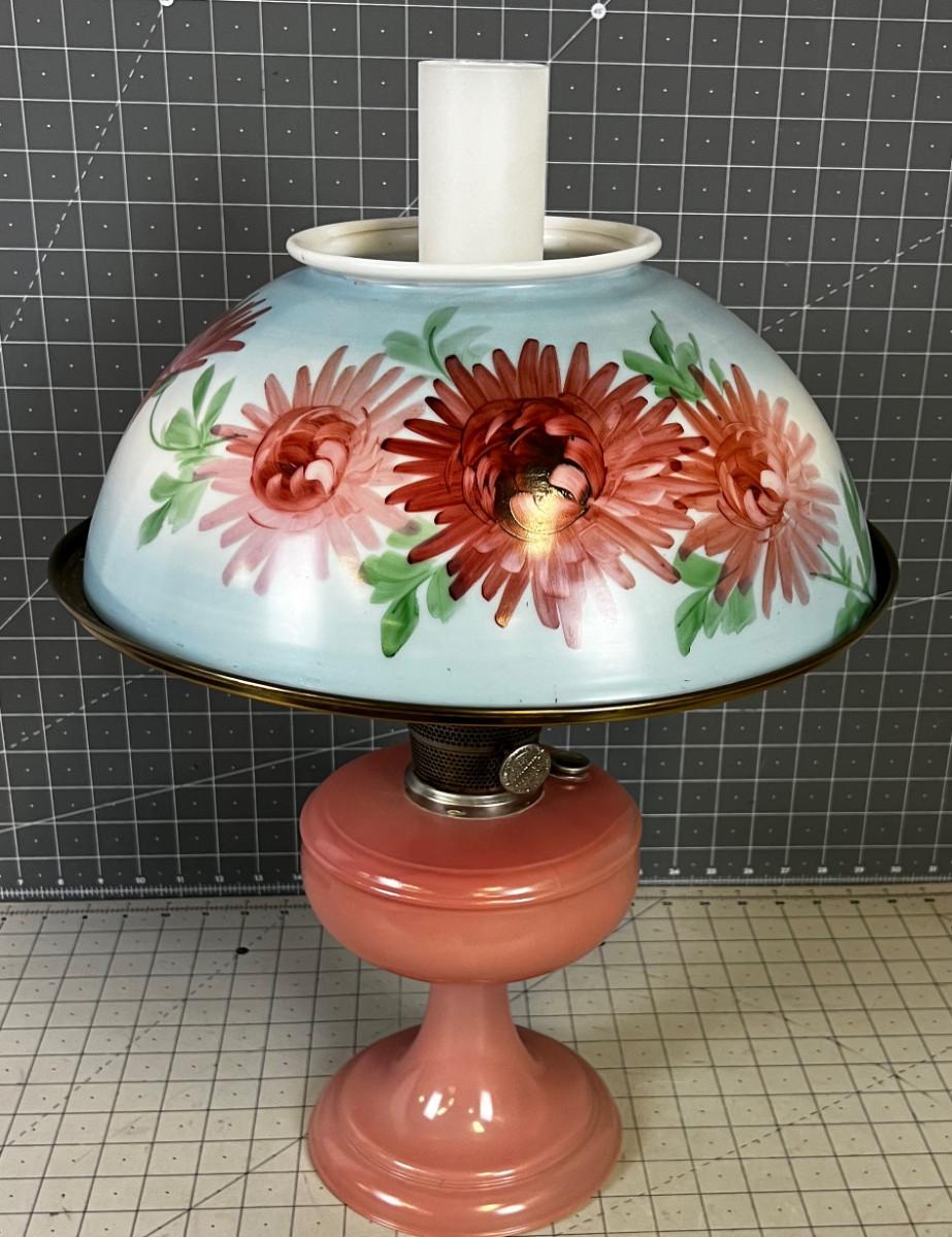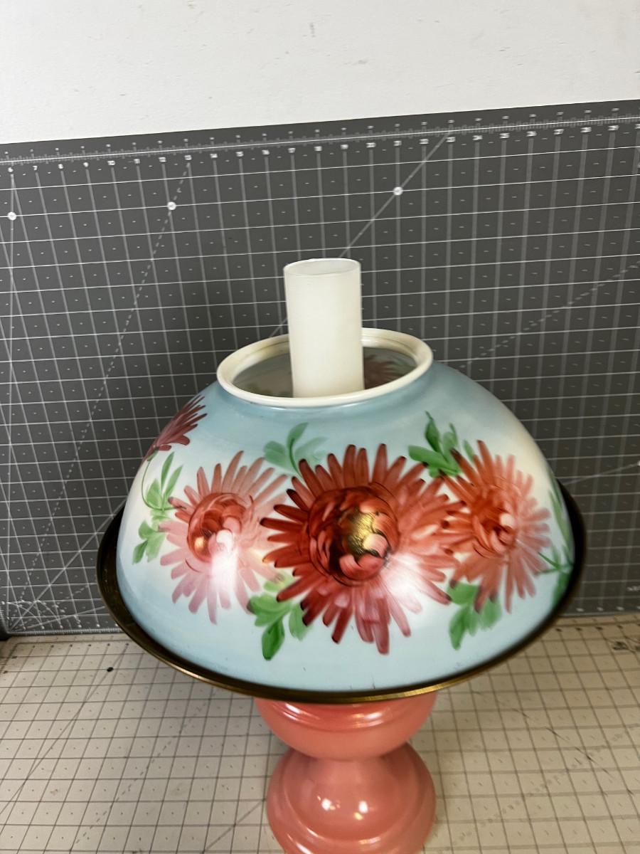 Appears to be in Working Condition. Hand Painted Shade. Mauve and Light Blue Glass in Good Condition. The Real Deal - Pretty!