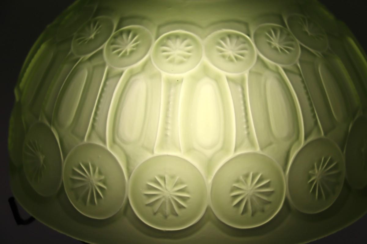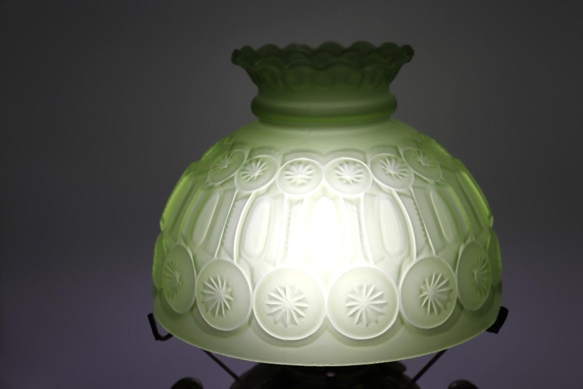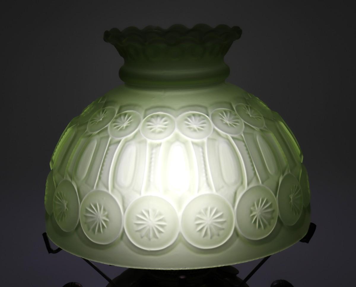 Beautiful Antique Green Glass Kerosene Shade. 10 inch base. From the estate of an antique store owner and lamp enthusiast. Condition as shown.