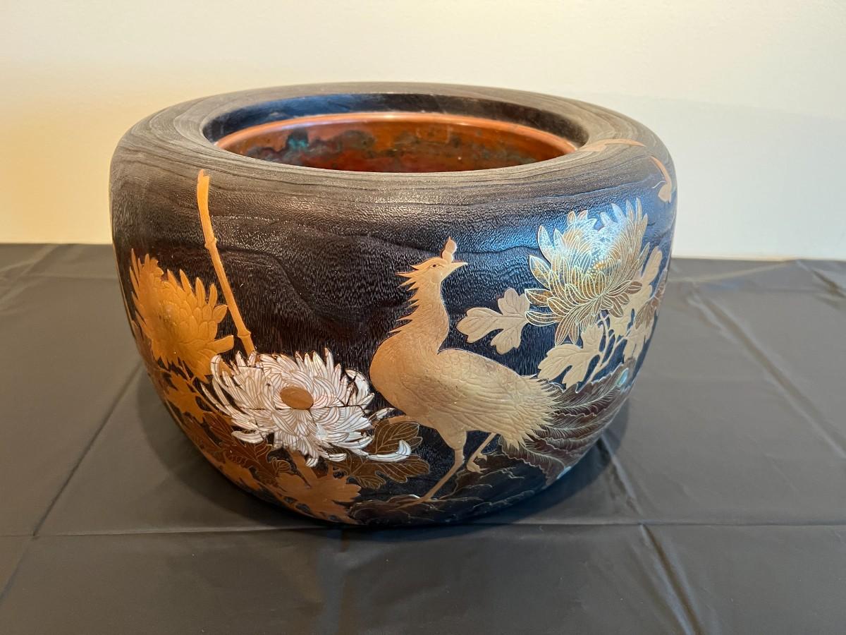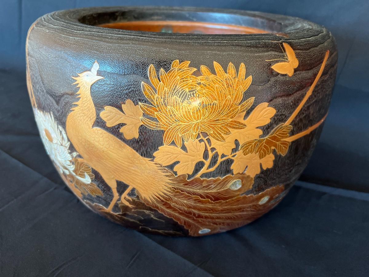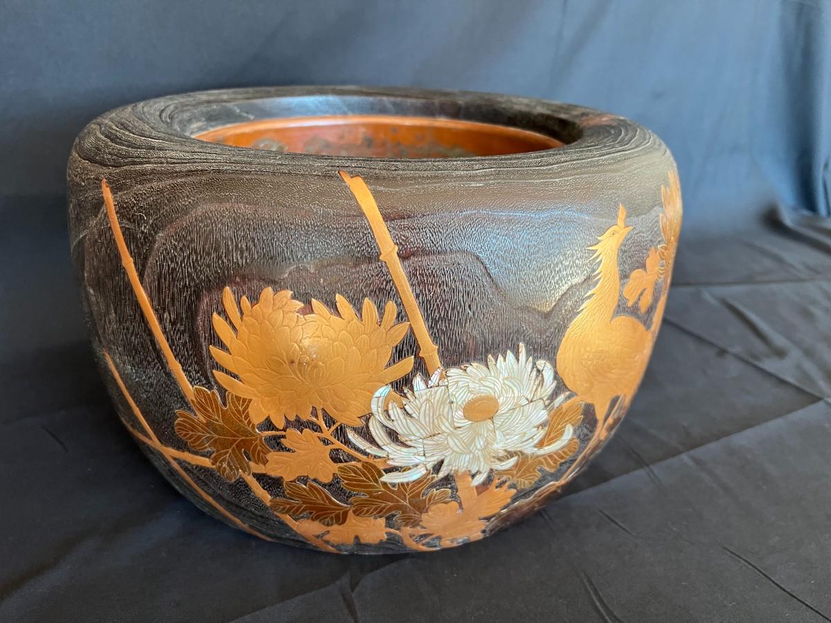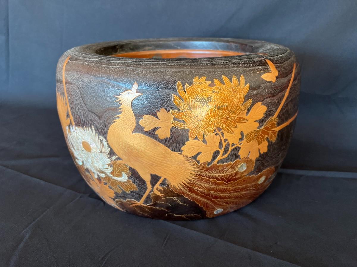 Beautiful antique Japanese Hibachi brazier with wonderful Makie details, and a copper basin. Lacquer and mother-of-pearl inlay design of peacocks and large chrysanthemum flowers, including miniature chrysanthemums known as kokiku. The gold and nashi lacquer is beautiful against the bold grain of the kiri (paulowniia) wood. Provenance from the estate indicates that this piece was acquired in 2003 from the Honeychurch Antiques gallery in Seattle, WA. Condition as shown, exterior is beautiful and copper inside shows signs of erosion.