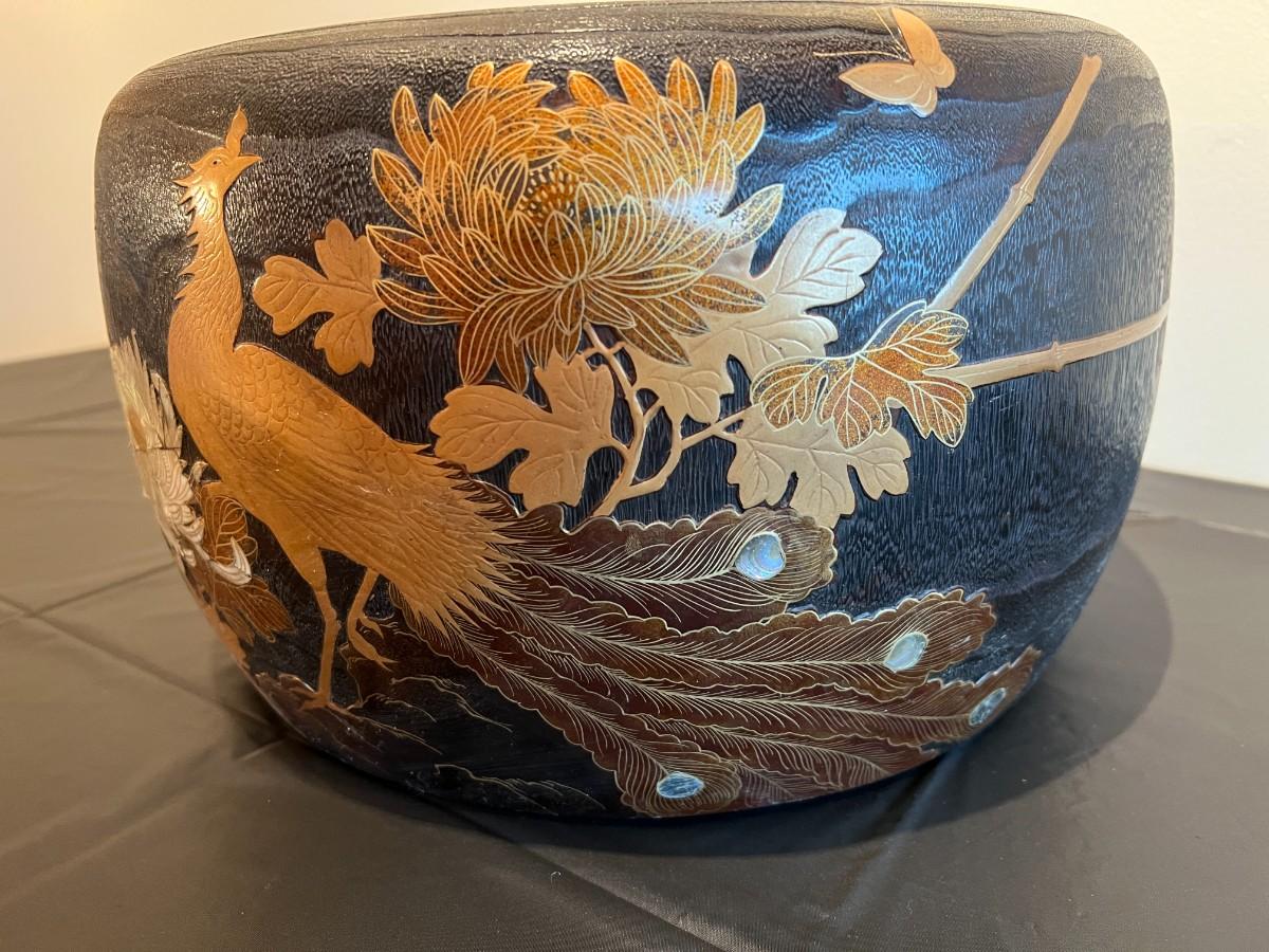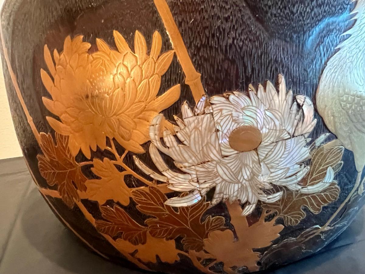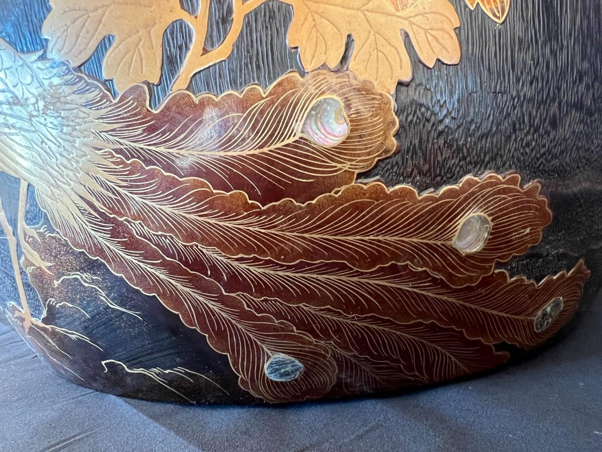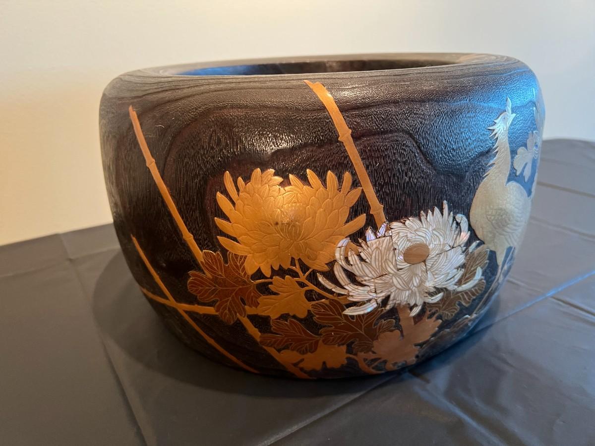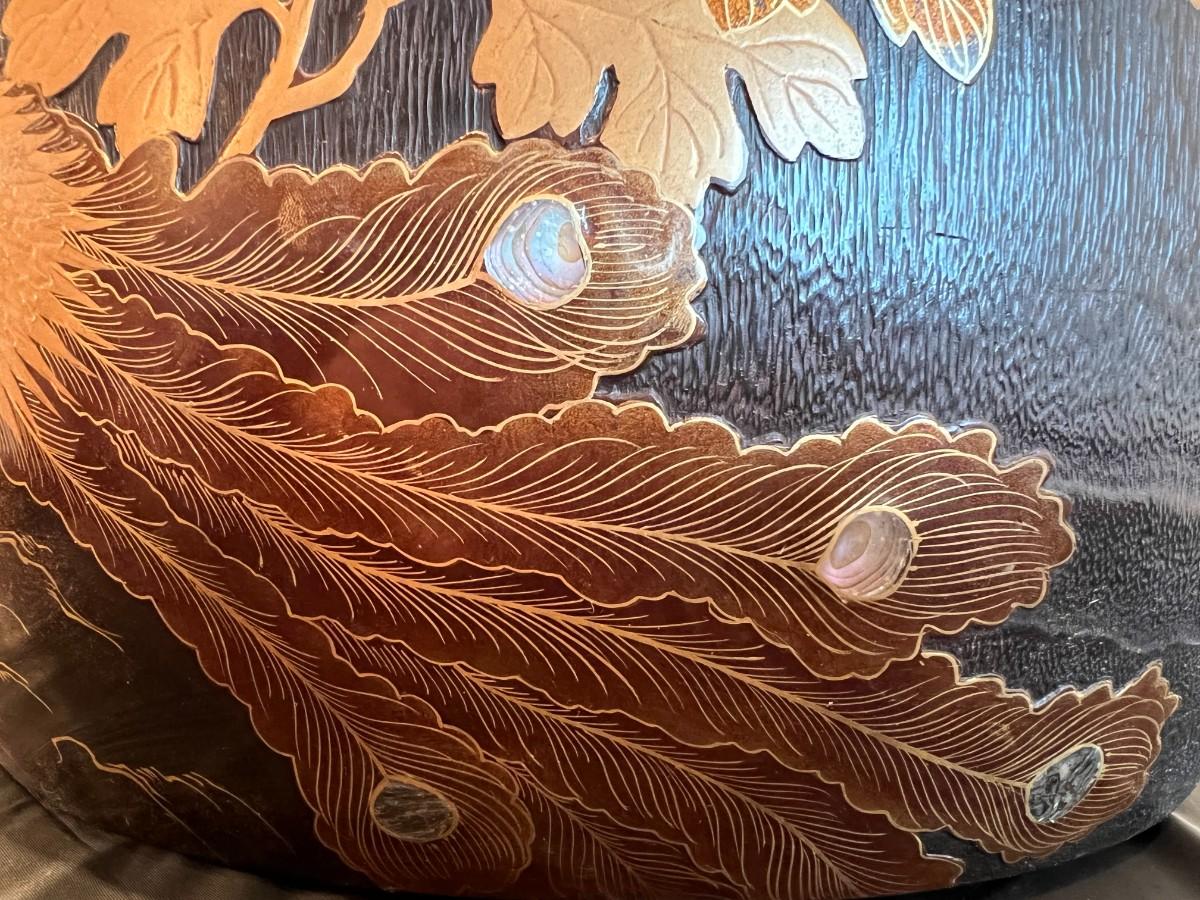 Beautiful antique Japanese Hibachi brazier with wonderful Makie details, and a copper basin. Lacquer and mother-of-pearl inlay design of peacocks and large chrysanthemum flowers, including miniature chrysanthemums known as kokiku. The gold and nashi lacquer is beautiful against the bold grain of the kiri (paulowniia) wood. Provenance from the estate indicates that this piece was acquired in 2003 from the Honeychurch Antiques gallery in Seattle, WA. Condition as shown, exterior is beautiful and copper inside shows signs of erosion.