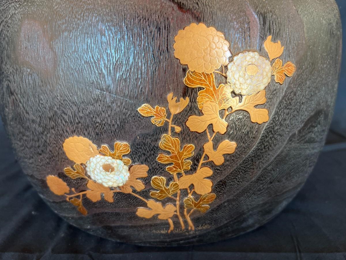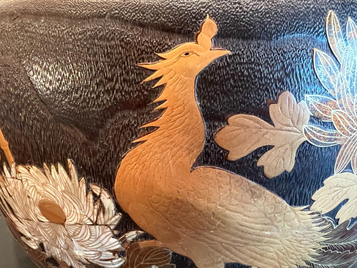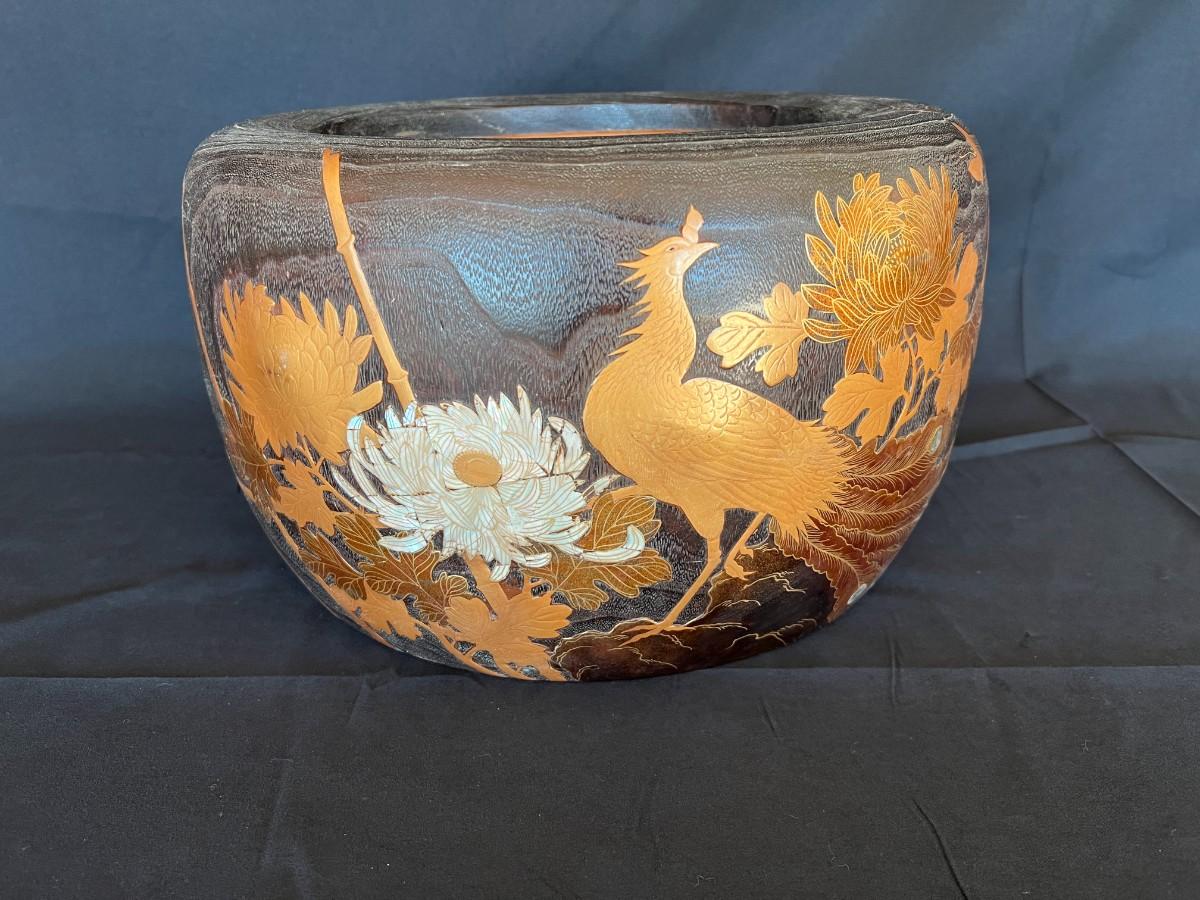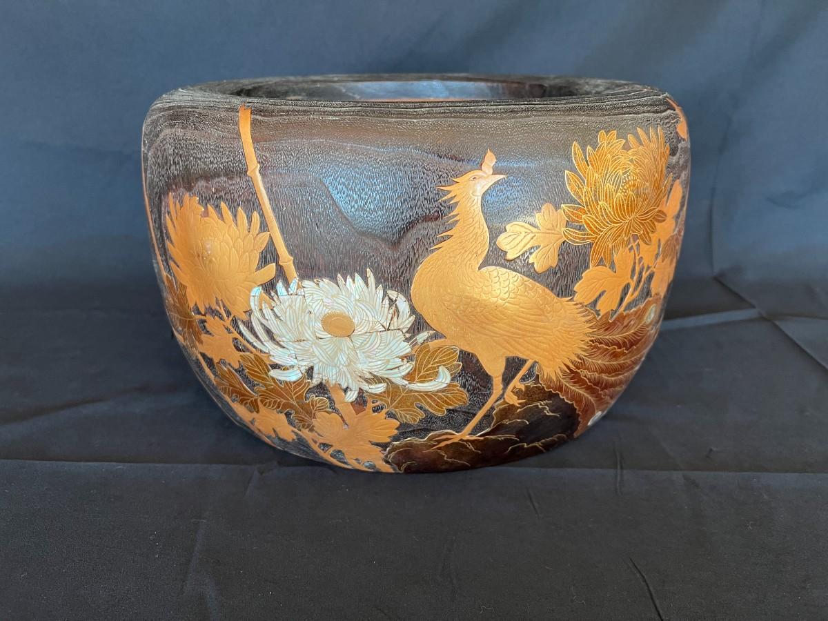 Beautiful antique Japanese Hibachi brazier with wonderful Makie details, and a copper basin. Lacquer and mother-of-pearl inlay design of peacocks and large chrysanthemum flowers, including miniature chrysanthemums known as kokiku. The gold and nashi lacquer is beautiful against the bold grain of the kiri (paulowniia) wood. Provenance from the estate indicates that this piece was acquired in 2003 from the Honeychurch Antiques gallery in Seattle, WA. Condition as shown, exterior is beautiful and copper inside shows signs of erosion.