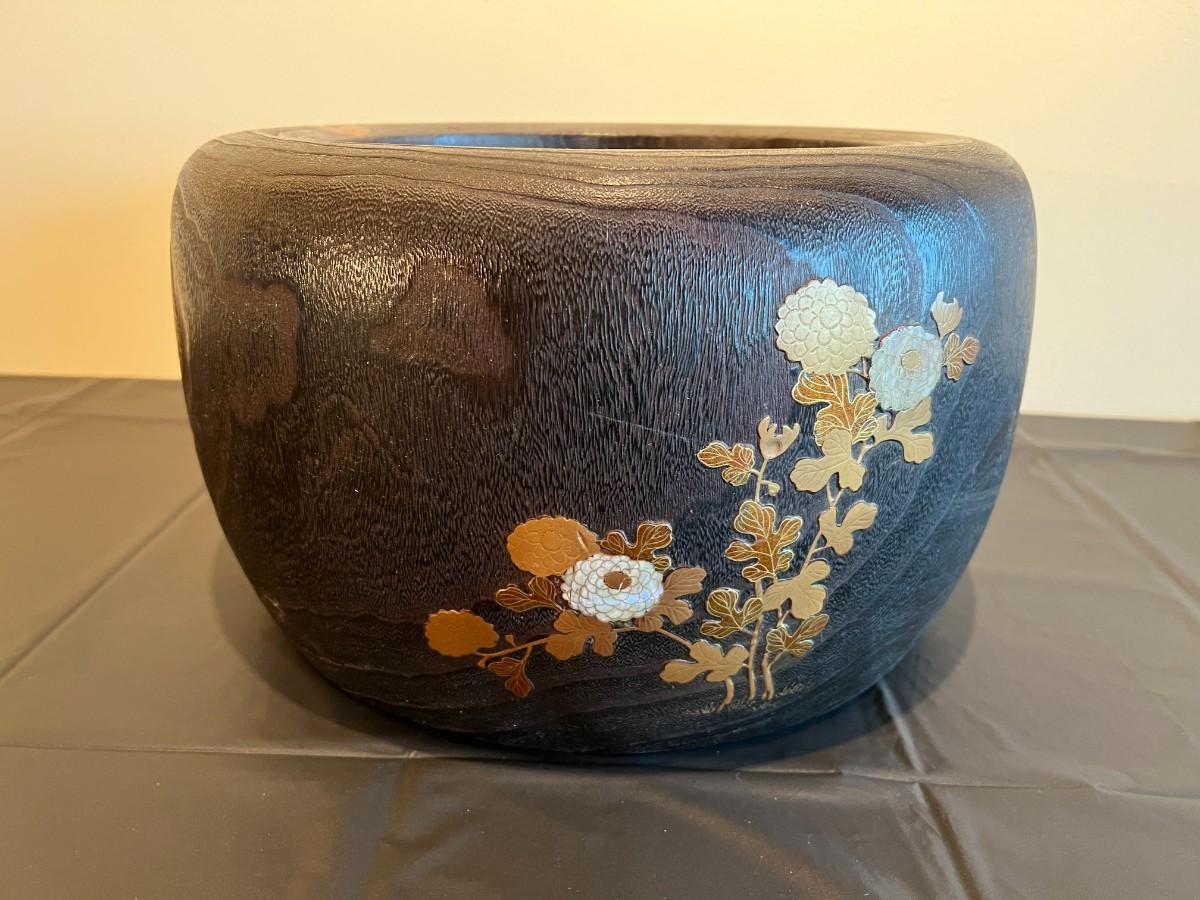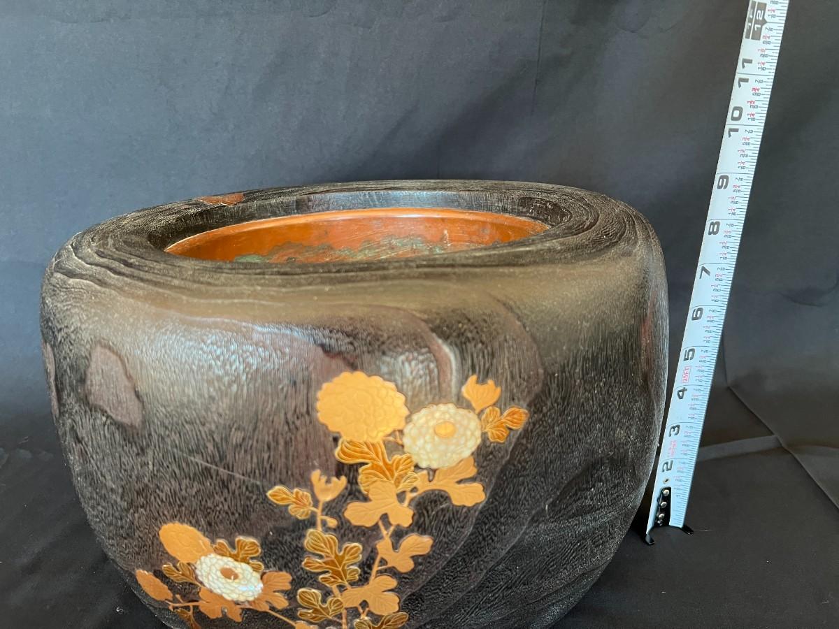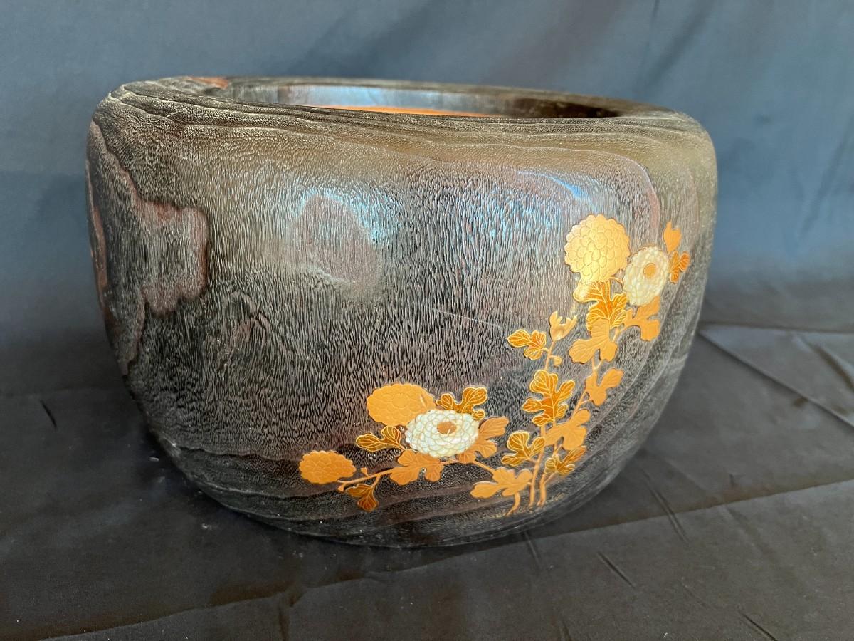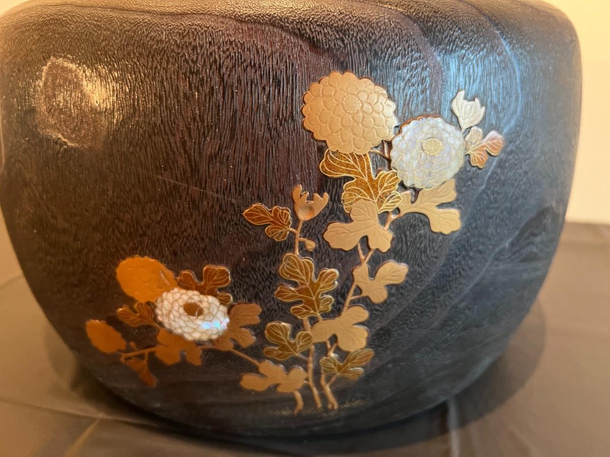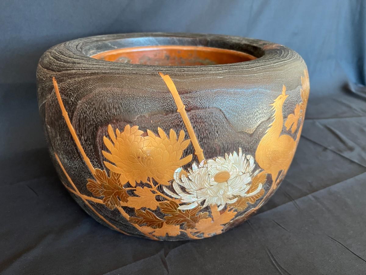 Beautiful Antique Kiri Wood Hibachi with Makie and Copper Metal Insert