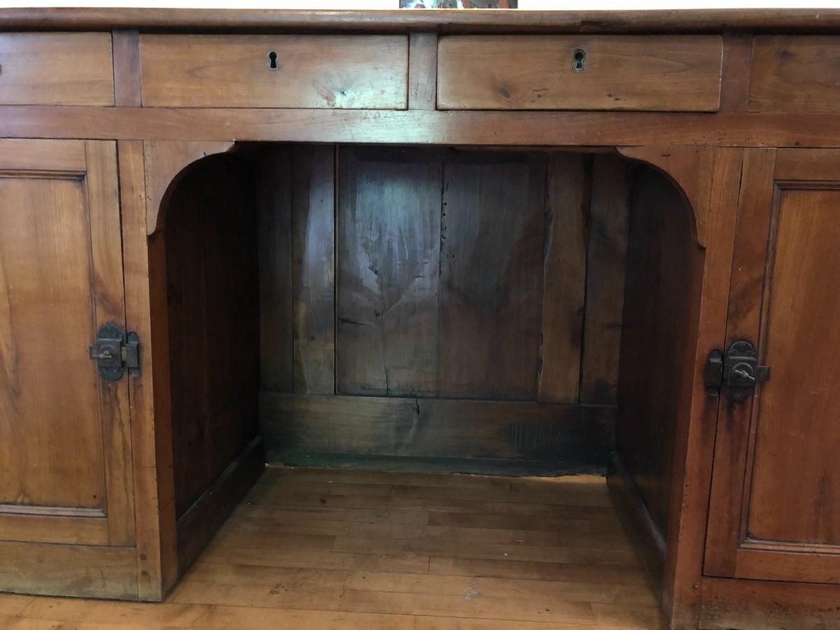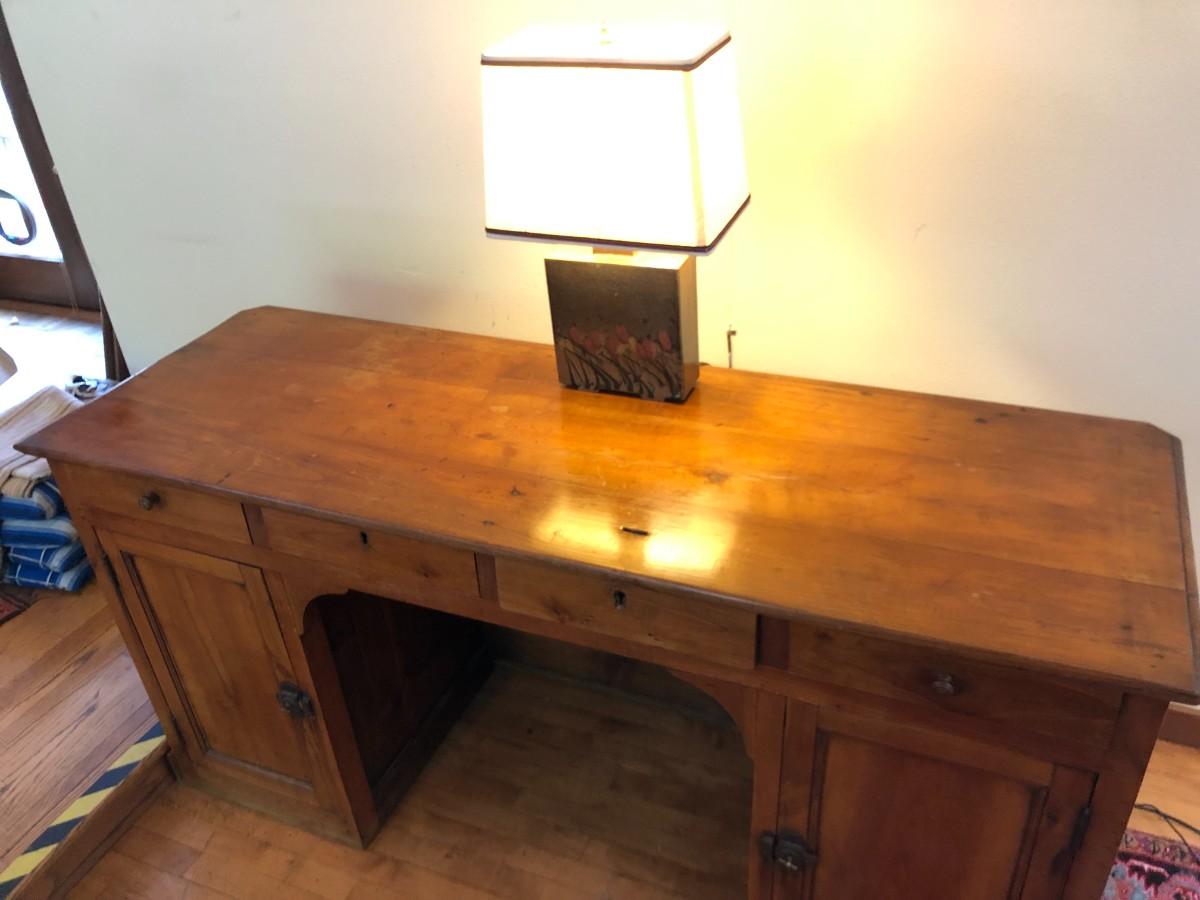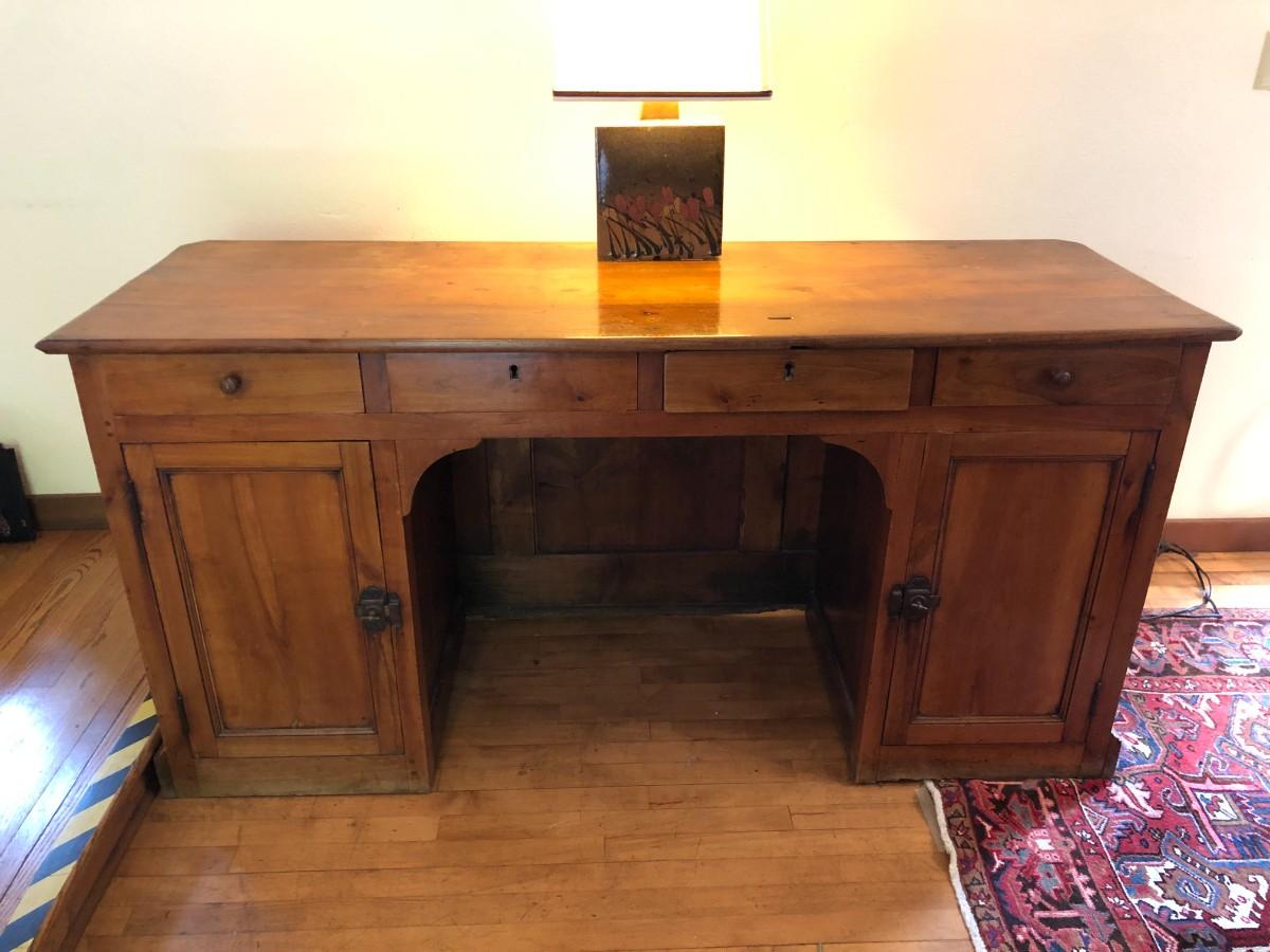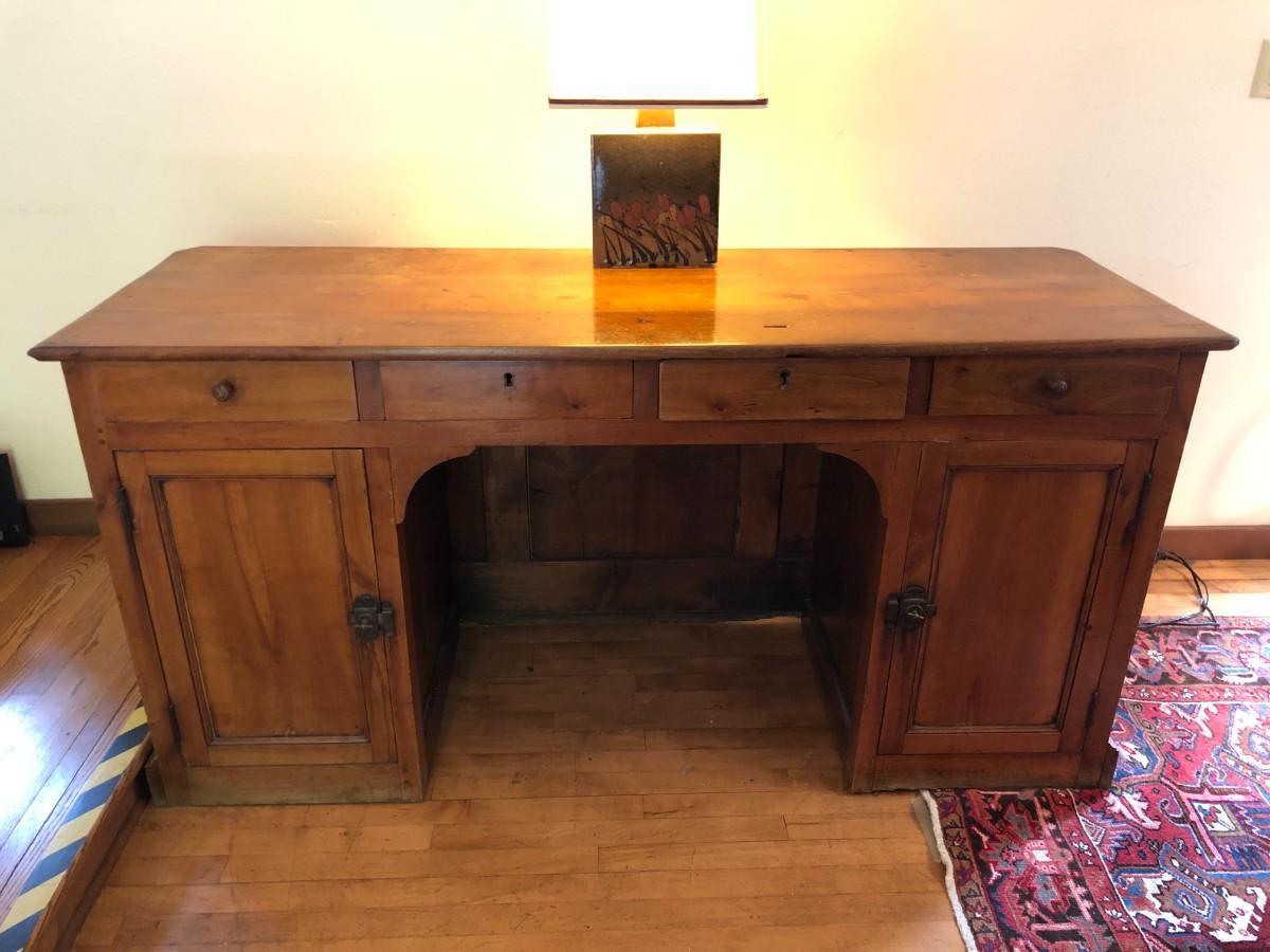 Beautiful antique oak desk with two cabinets and four drawers (including two lock drawers, one with a coin slot? on top). Owner was naval architect, so could be something from his background perhaps. All paneled - front and sides. In very good condition, with a little old water damage on the bottom.