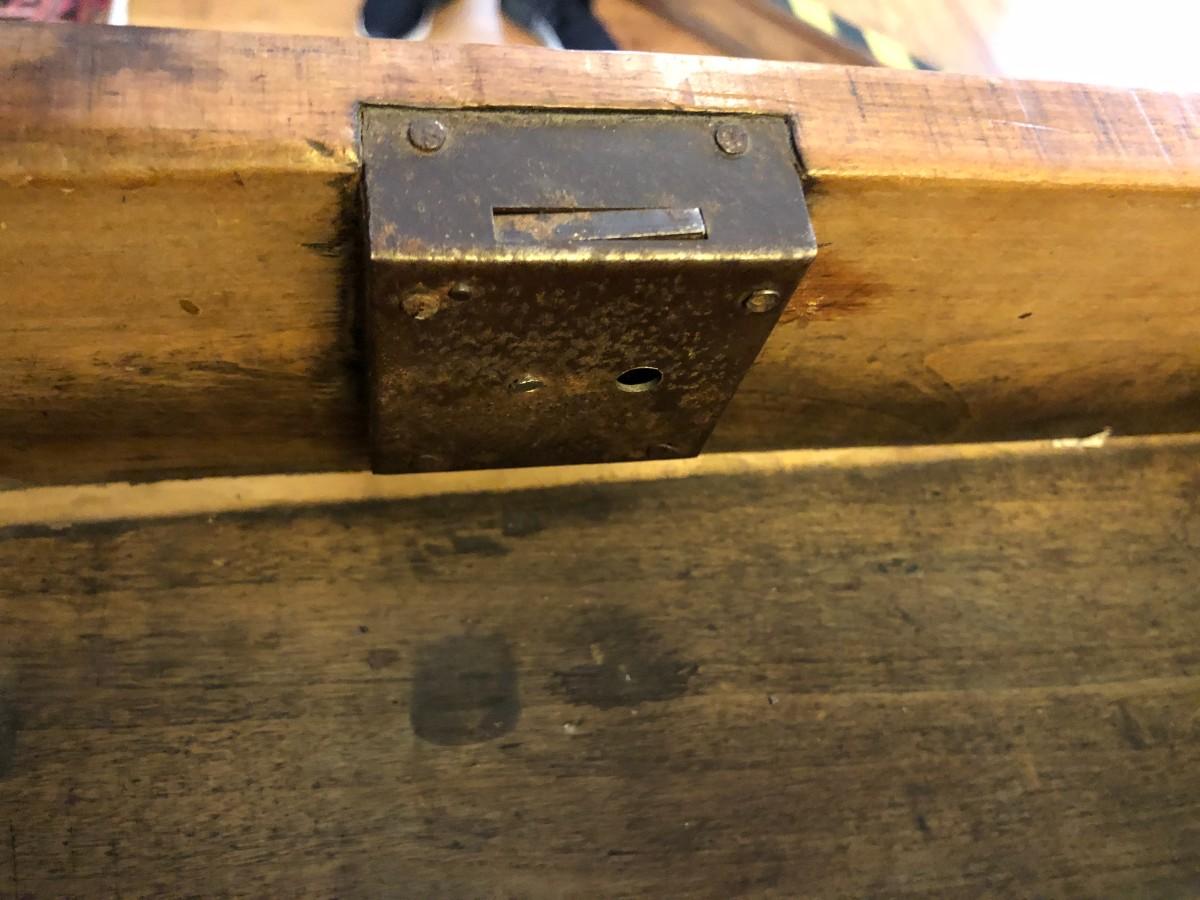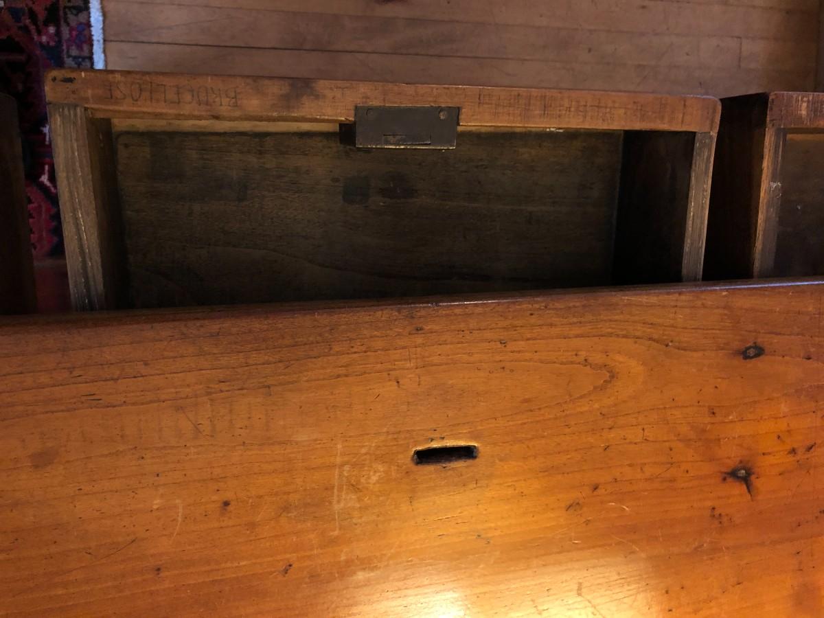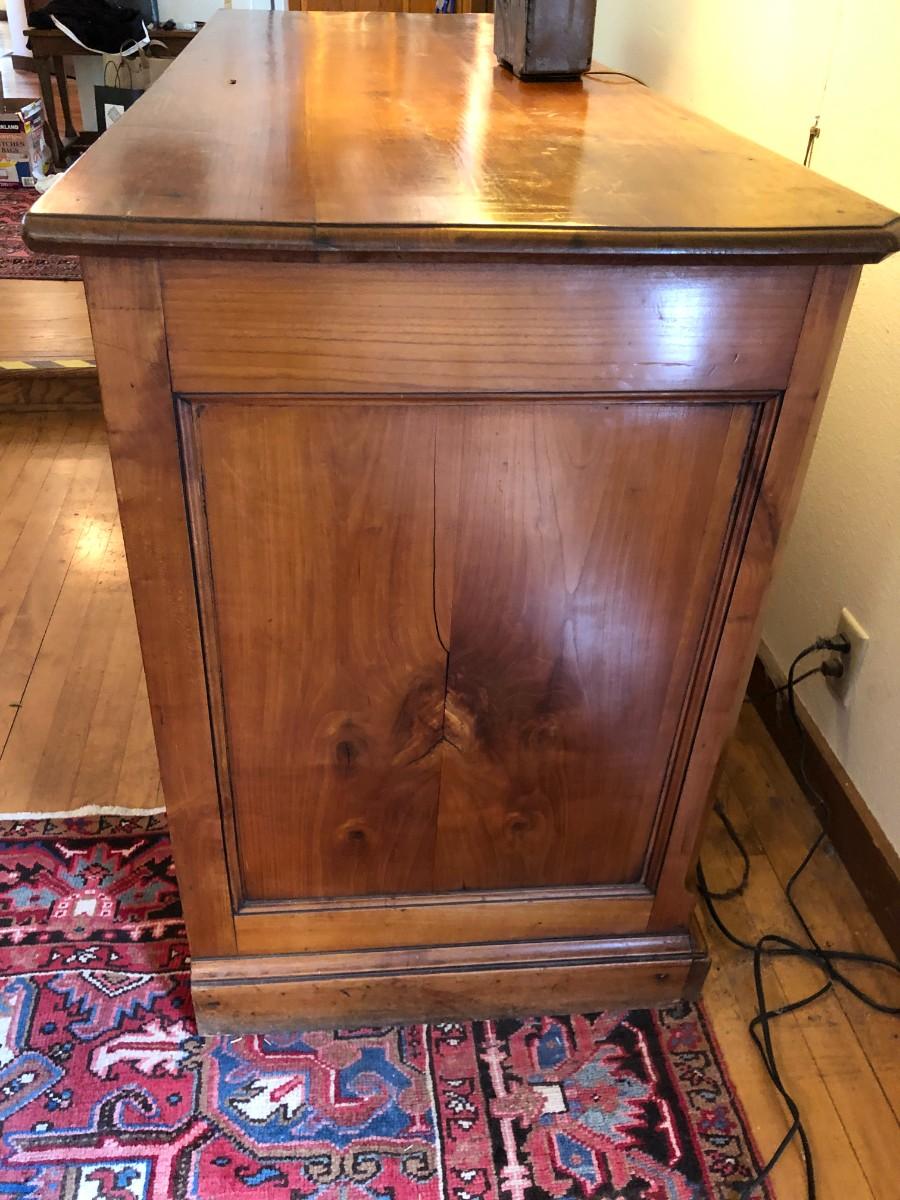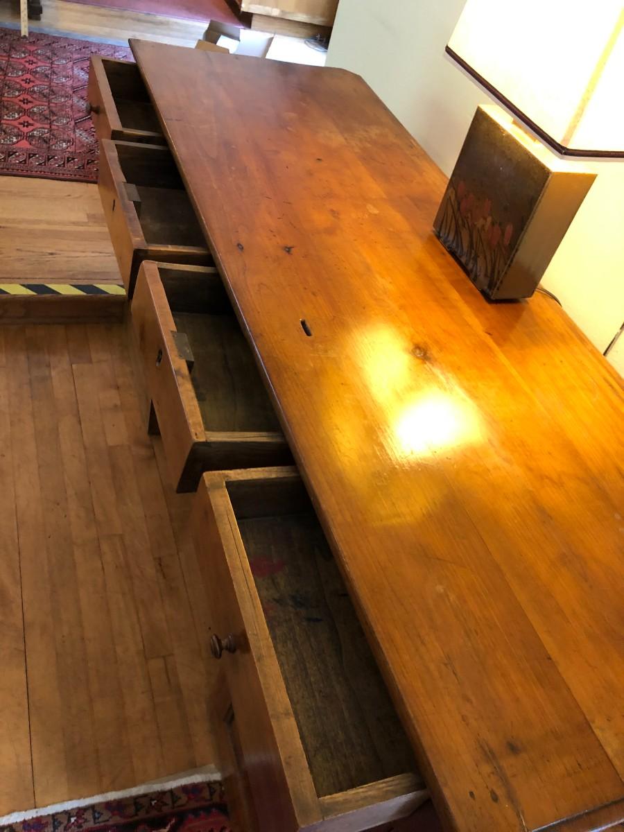 Beautiful antique oak desk with two cabinets and four drawers (including two lock drawers, one with a coin slot? on top). Owner was naval architect, so could be something from his background perhaps. All paneled - front and sides. In very good condition, with a little old water damage on the bottom.