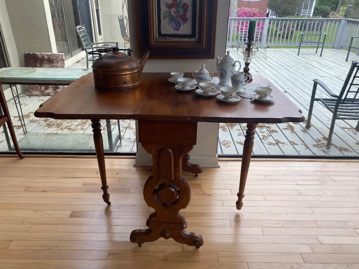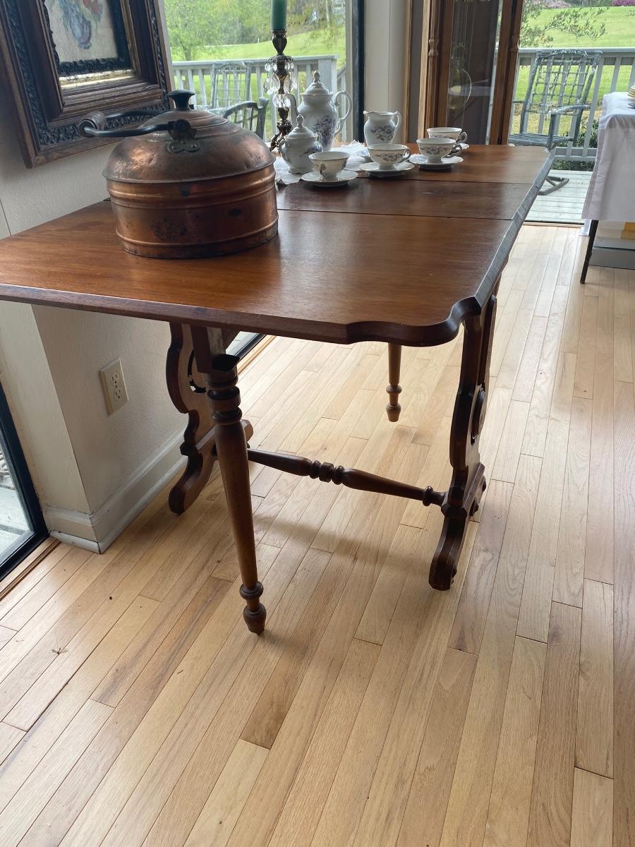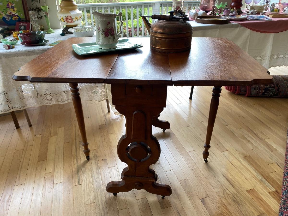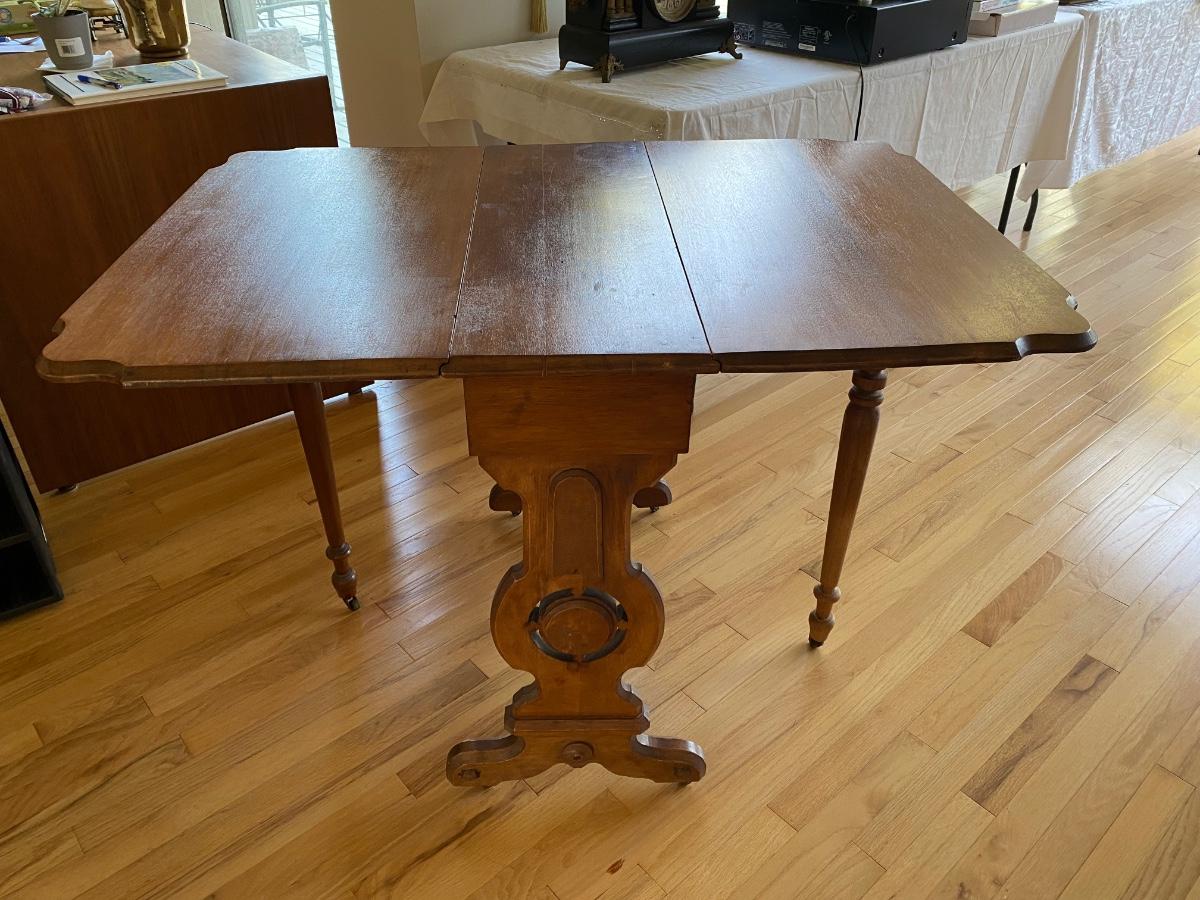 Beautiful antique walnut dropleaf, gateleg table, 1860s. Open approx 43w x 30d x 29-1/2h. Approx 15”w when closed