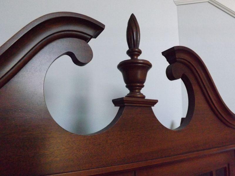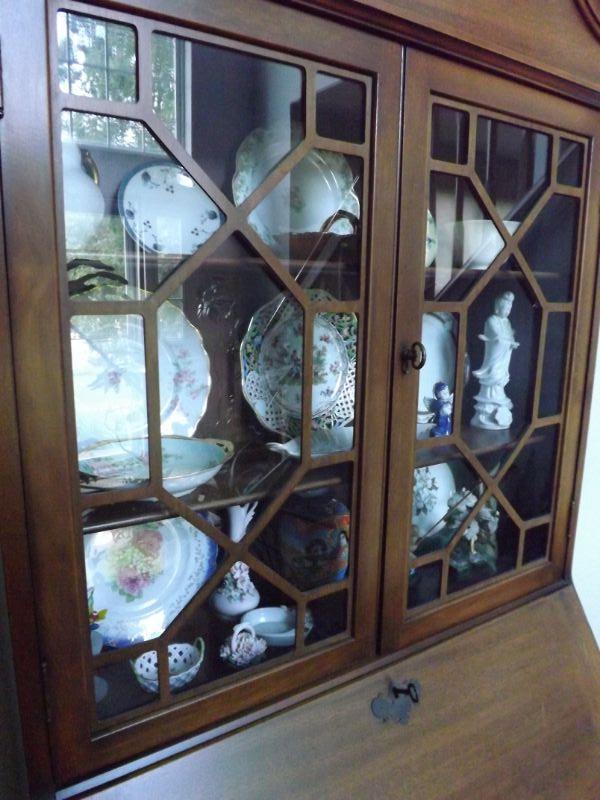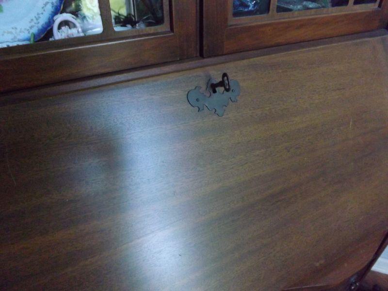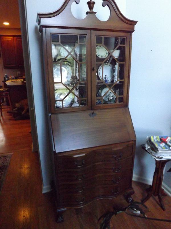Beautiful antique secretary desk with 4 drawers and china cabinet above. Items in cabinet are not included. **Please read Terms and Conditions before placing a bid. Pick up is Sunday, September 1, 2019 from 10am to 4pm in Williamstown. All sales are final. All sales are as is, where is. Please review all photos. Any props included in photos are not included in listing. All measurements are approximate. Comes from home with cats.