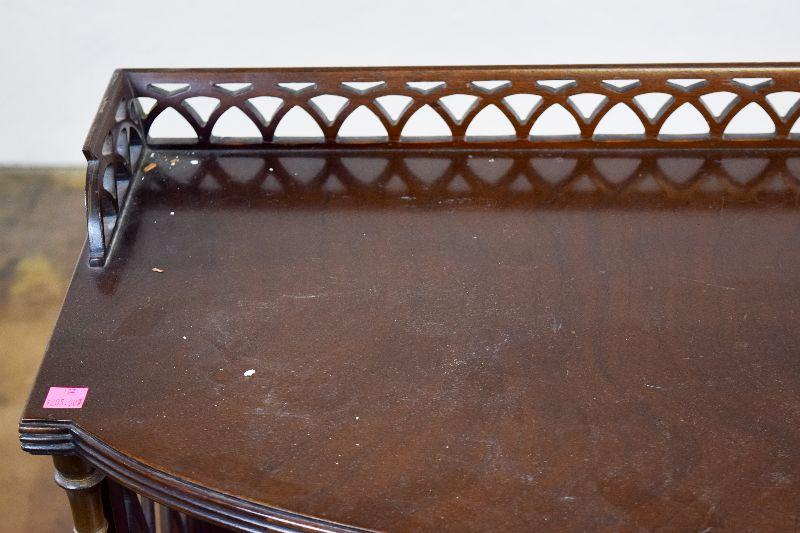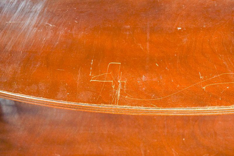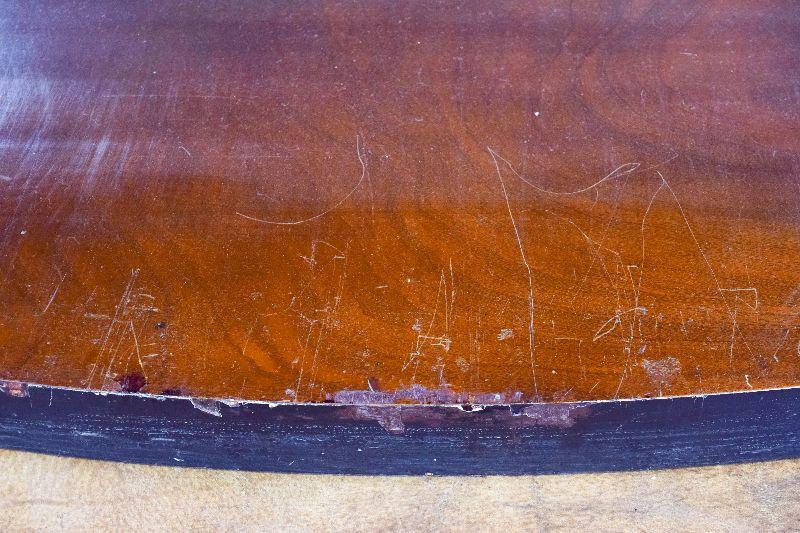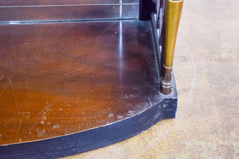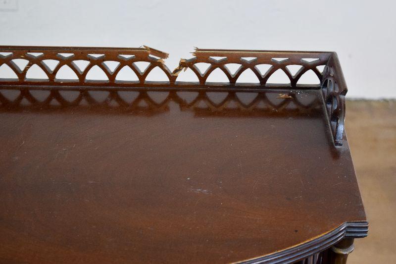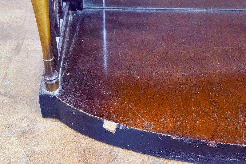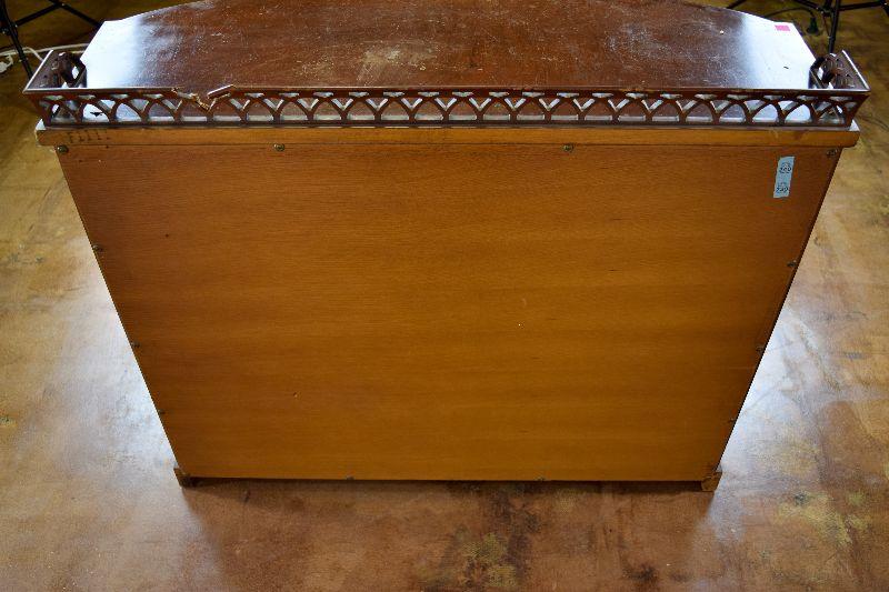 The item is in fairly rough shape, with a spot missing from the decorative back ledge. There are other nicks and marks on the piece, as well as general scratching on the piece. The item measures approximately 40" wide X 16" deep X 32" tall.