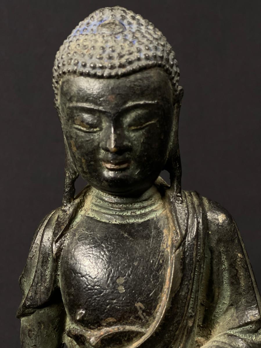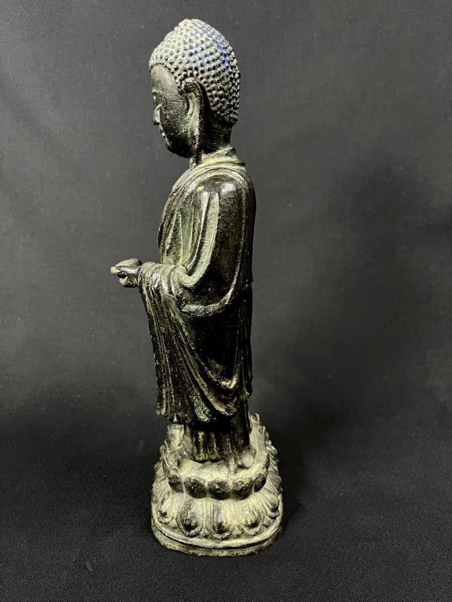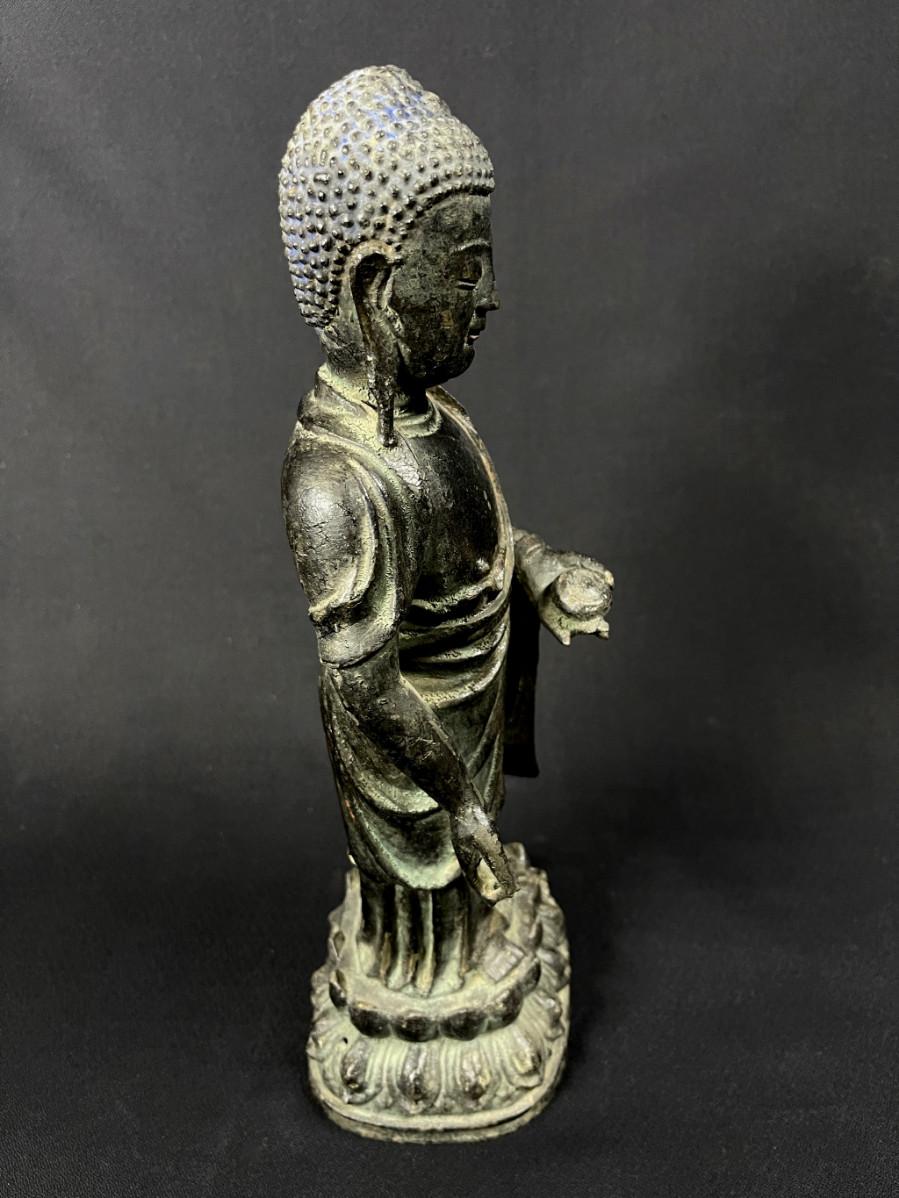 DESCRIPTION: This antique bronze Buddha is posed standing on a lotus base and holding an offering in his proper left hand. This crudeness with which the piece is cast, and the aged surface truly create a special and individual charm that has mellowed gracefully with time.