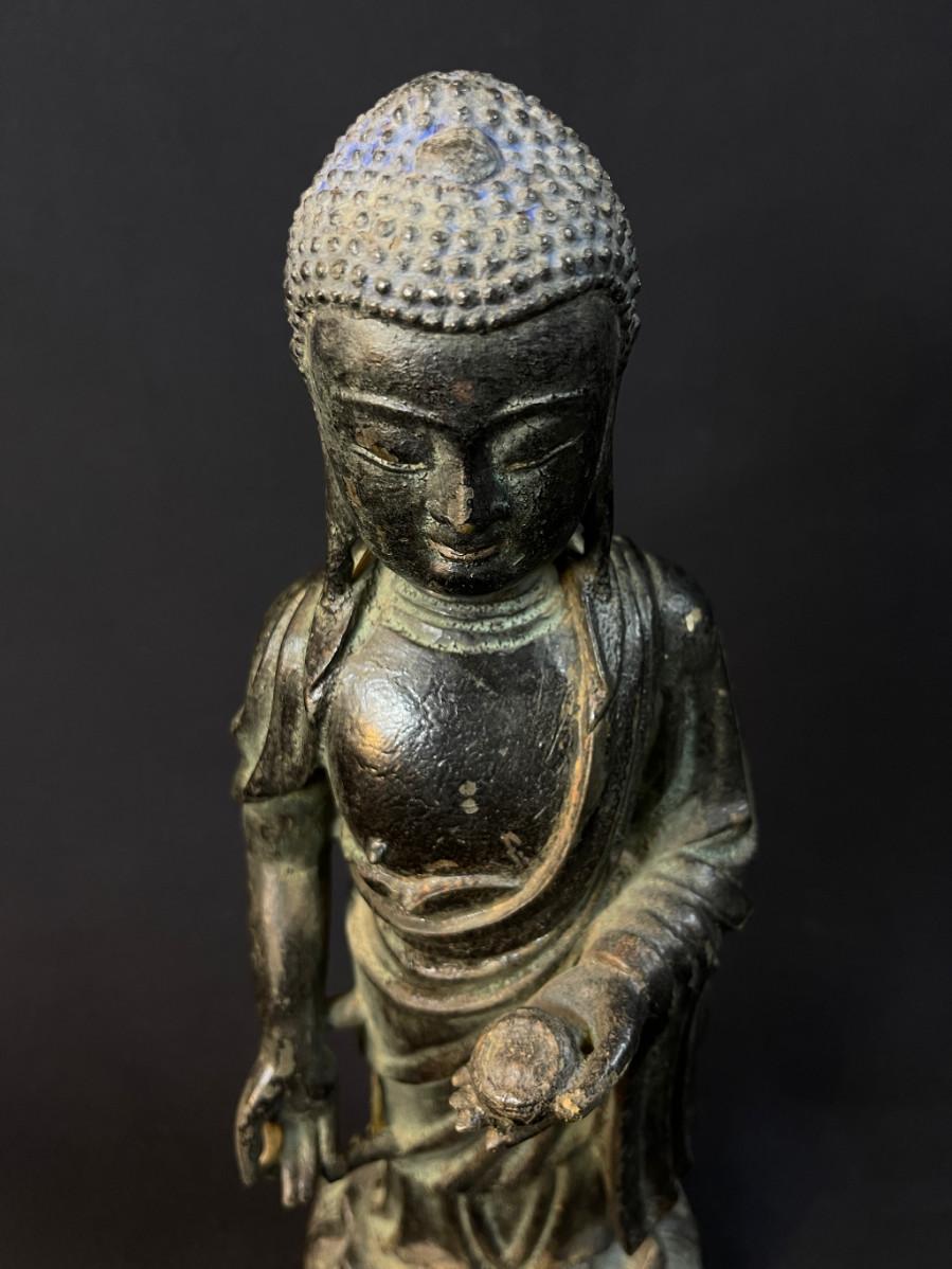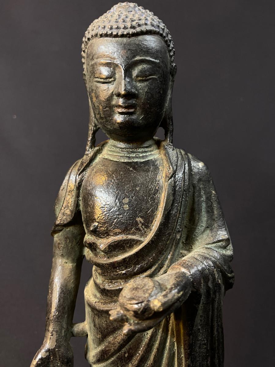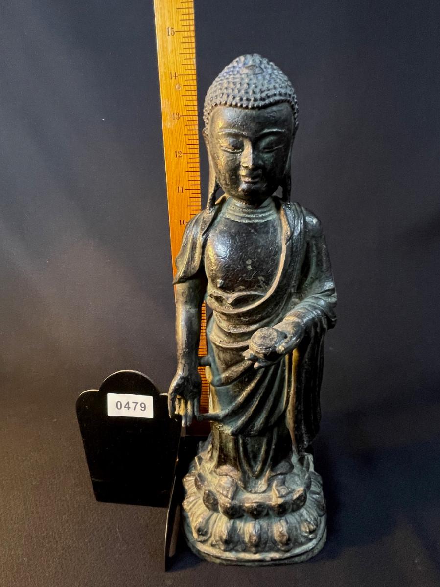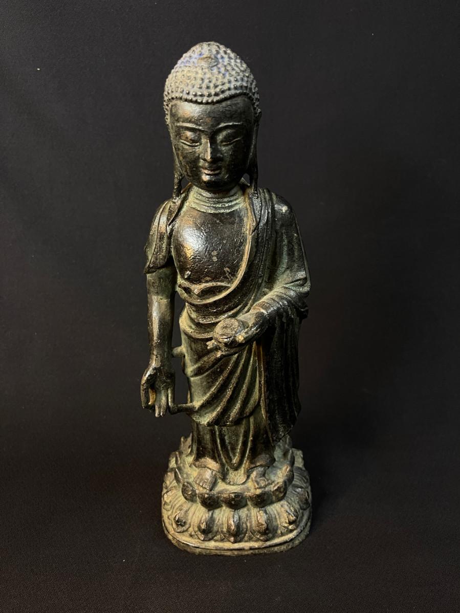 Beautiful Antique Standing Bronze Temple Buddha holding an offering