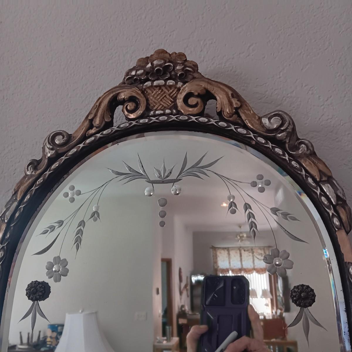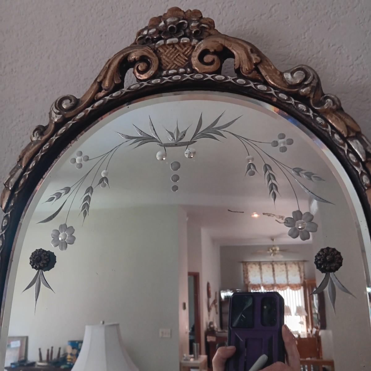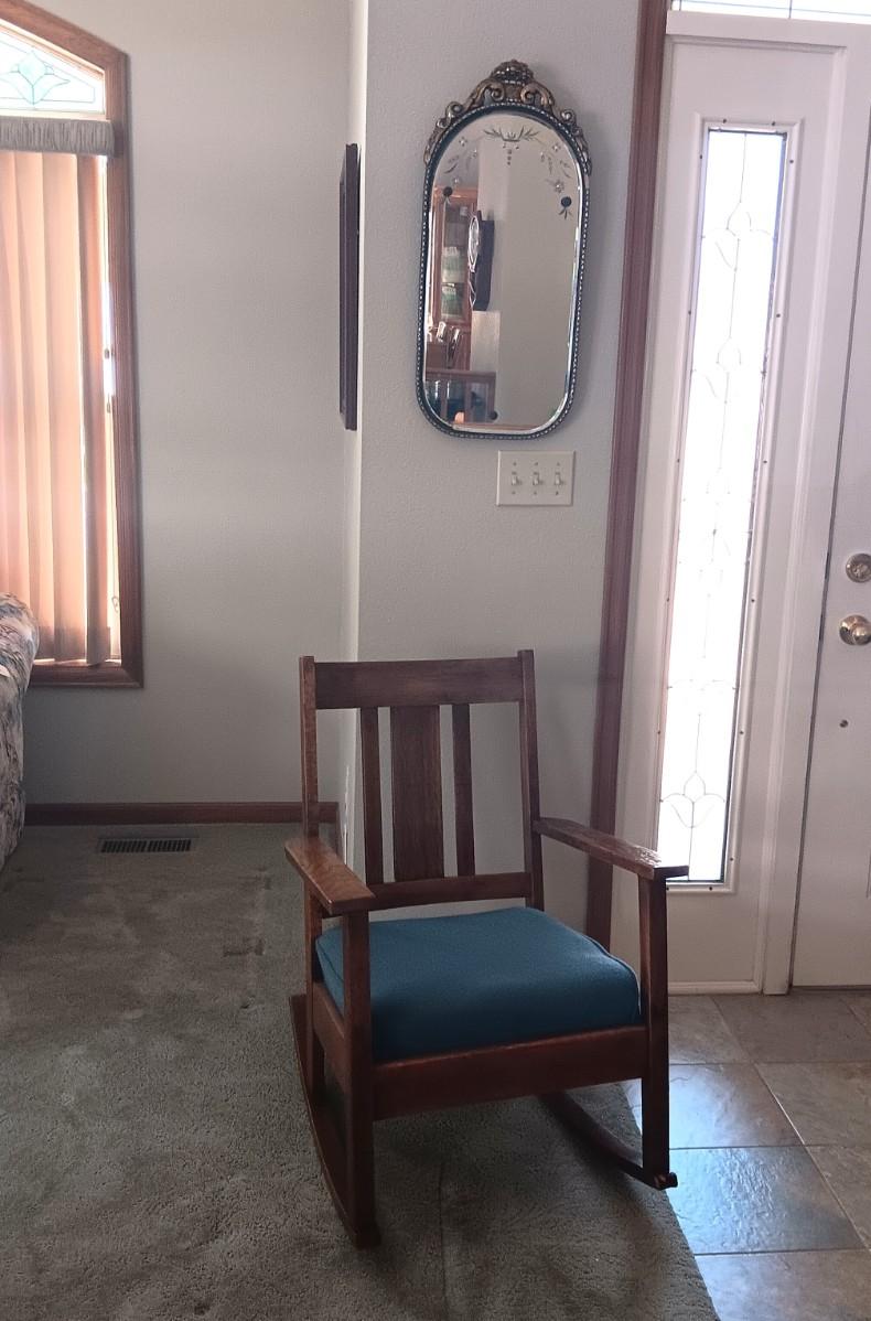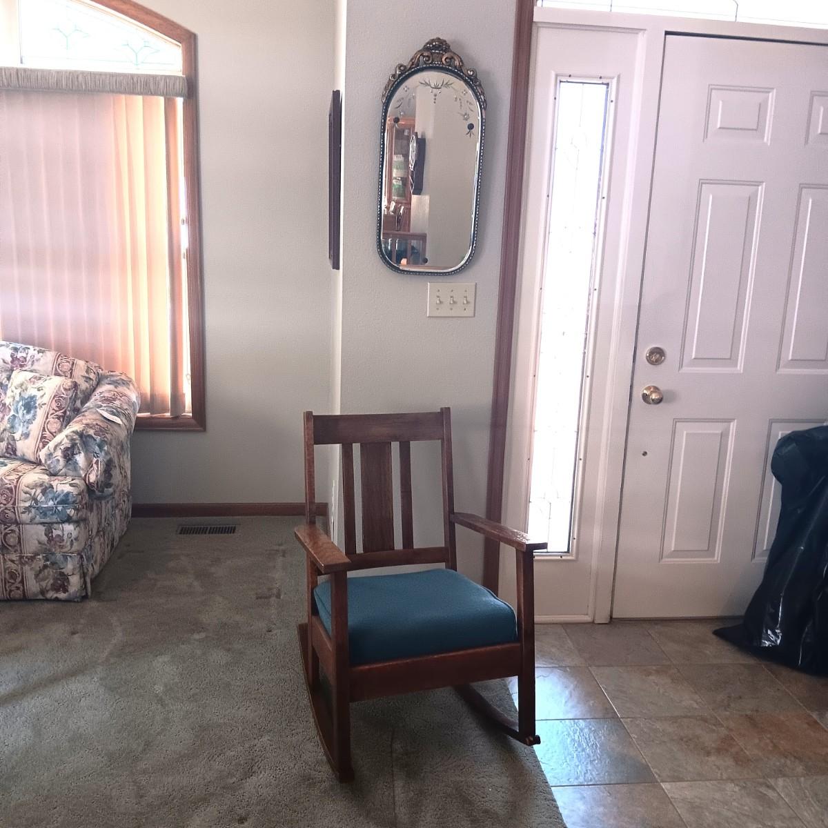 BEAUTIFUL ANTIQUE WALL MIRROR AND AN ANTIQUE ROCKING CHAIR