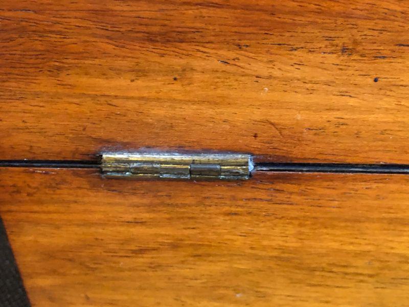 Gorgeous antique keepsake box! Beautiful natural wood with metal inlay details, forming a star pattern in the center. Inside is hand stitched fabric. In excellent condition.