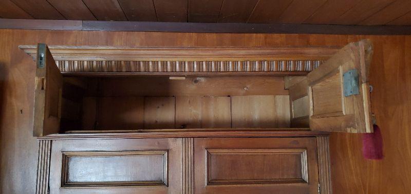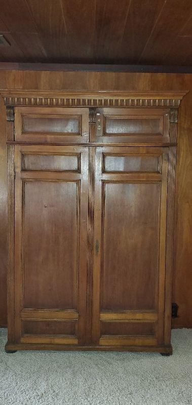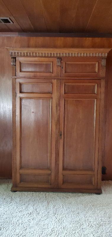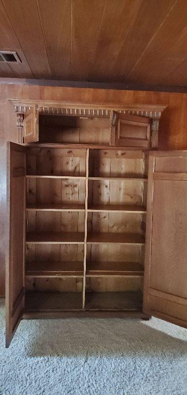 Beautiful well made armoire, it currently has built in shelving for storing clothing or treasrures. The upper compartment is open with no shelving. Overall measurement, 49" across, 19" deep, and 78" tall.