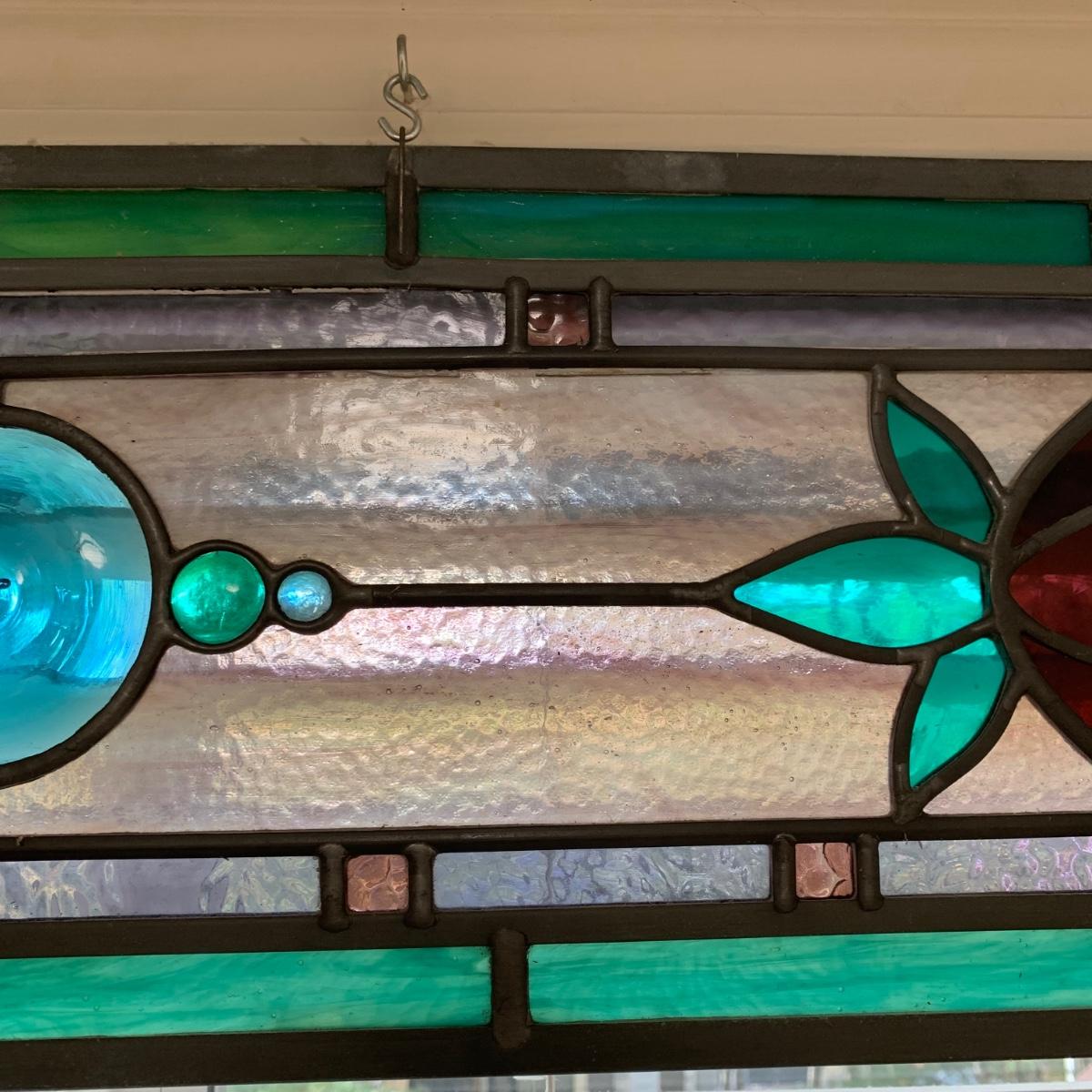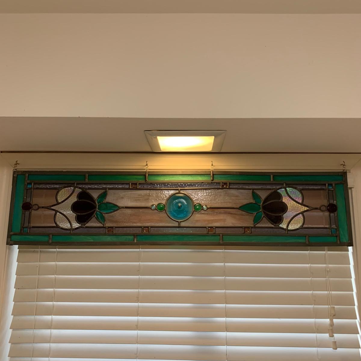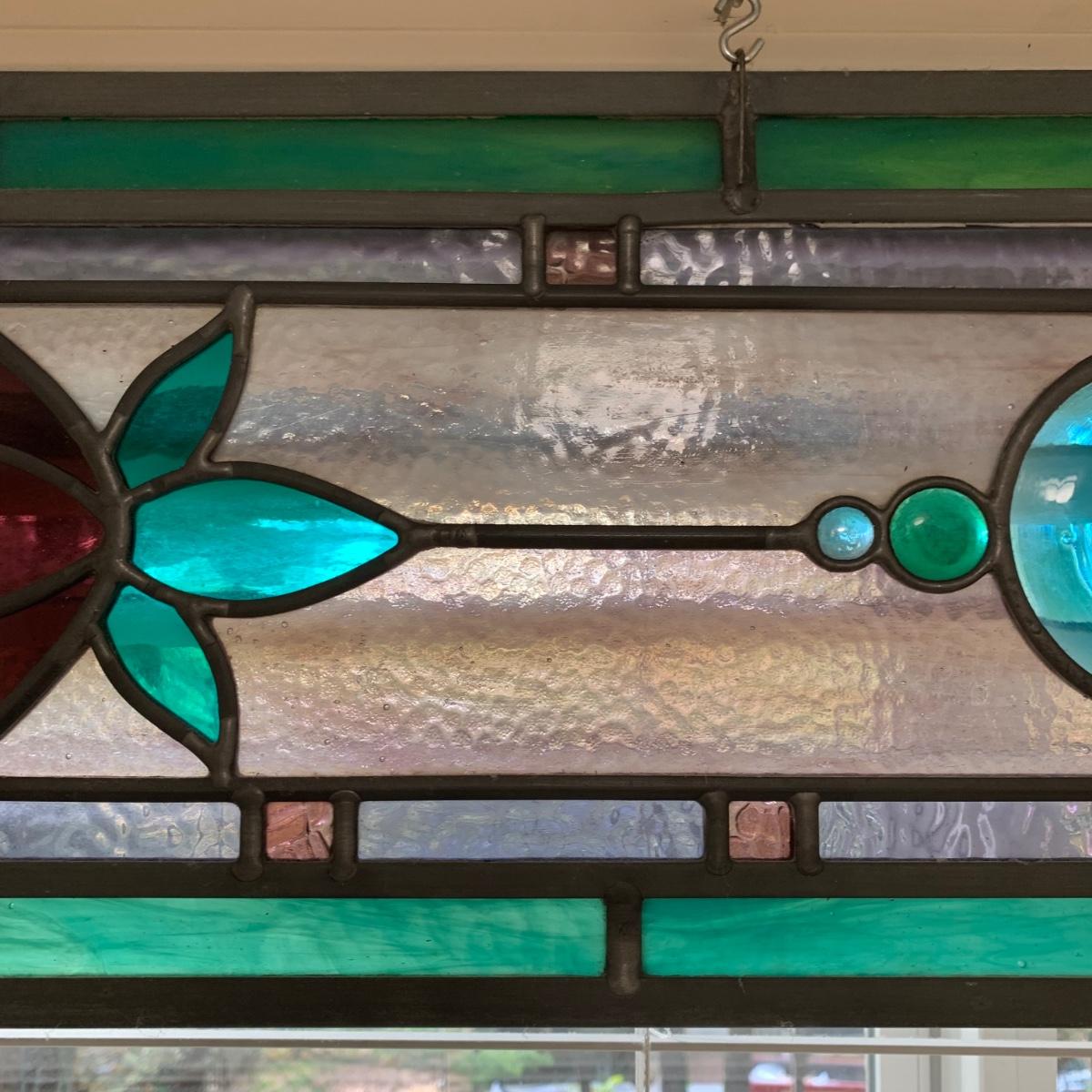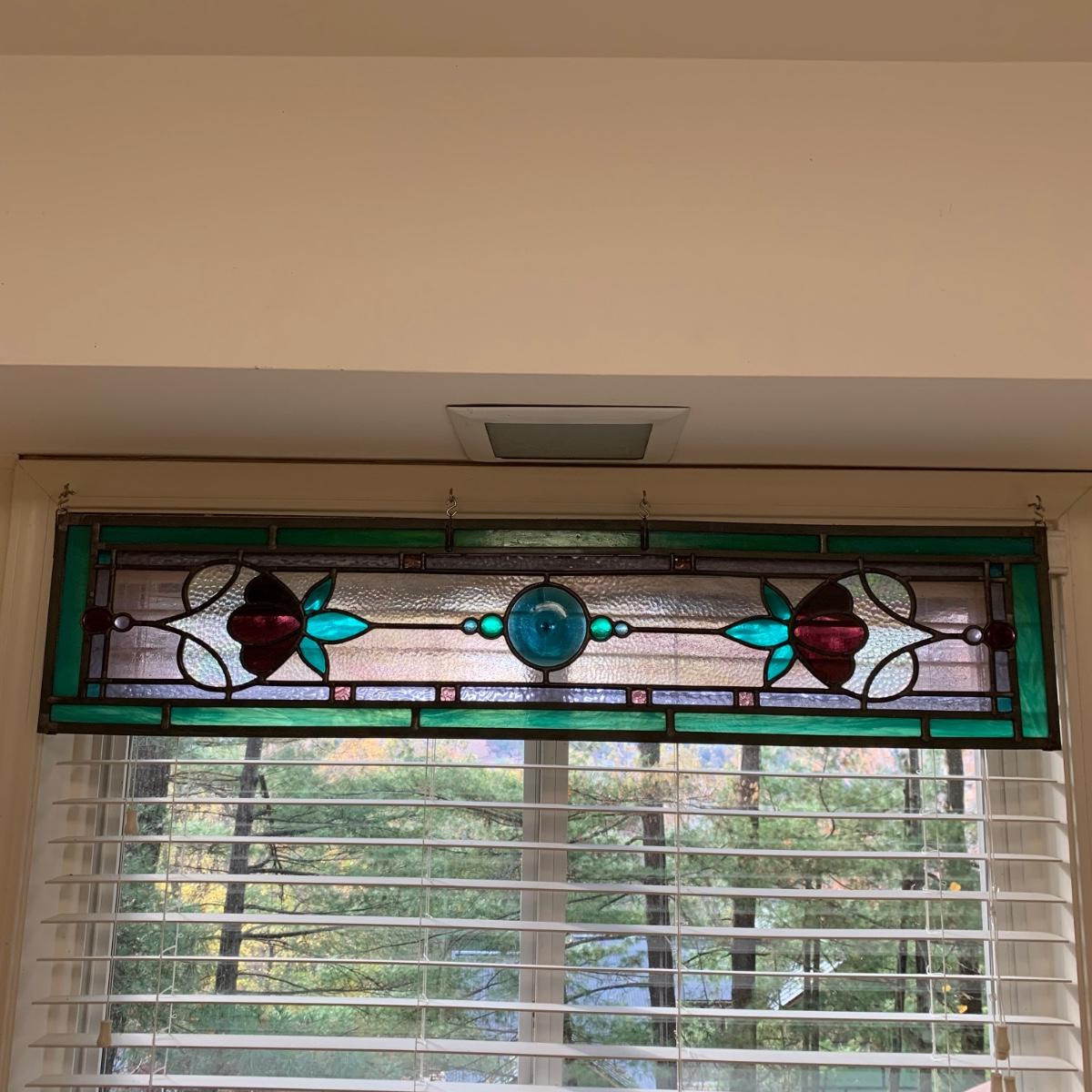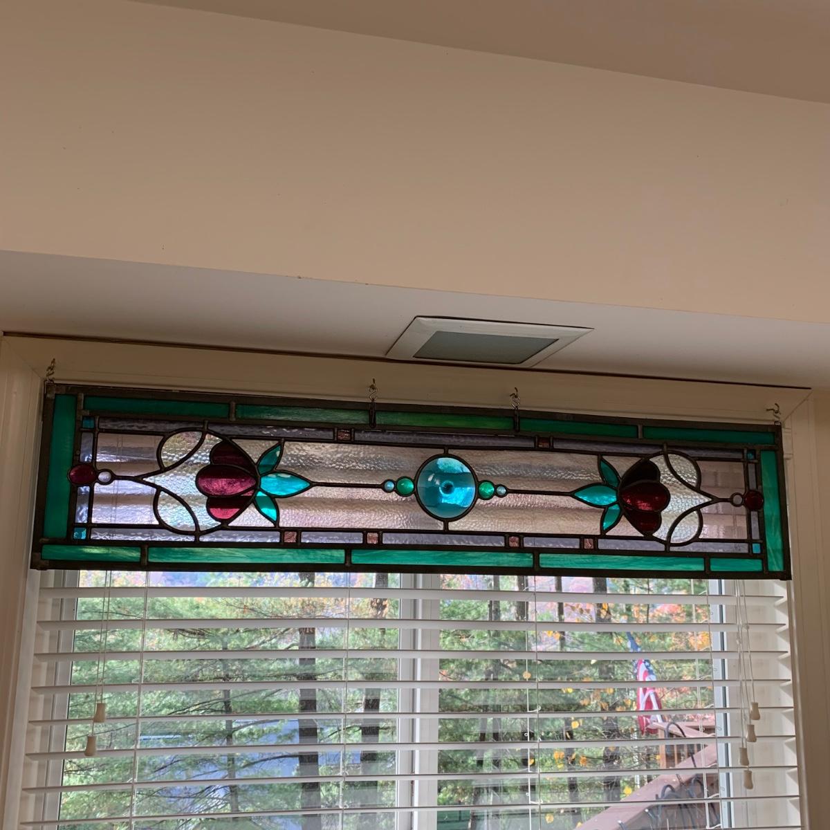 A gorgeous and sturdy piece of stained glass art. With calming cool colors and a floral motif. This stained glass is in very good condition. It measures 45.25” x 10”. There are four loops for hanging it horizontally with S hooks.