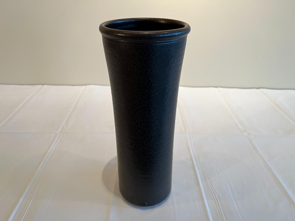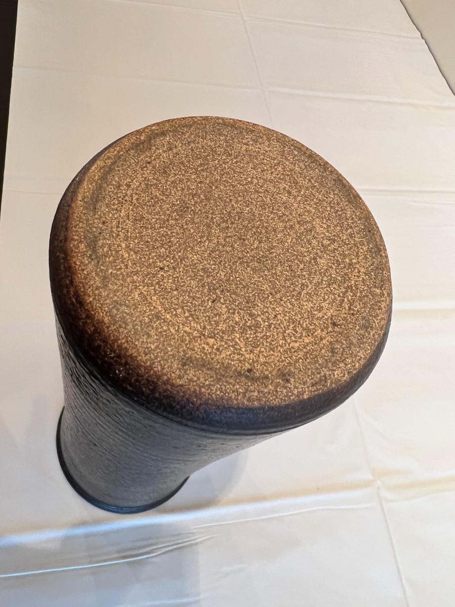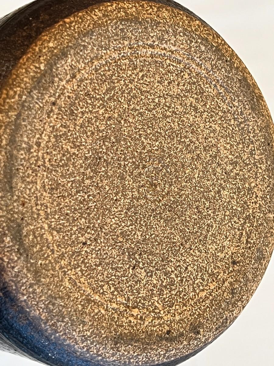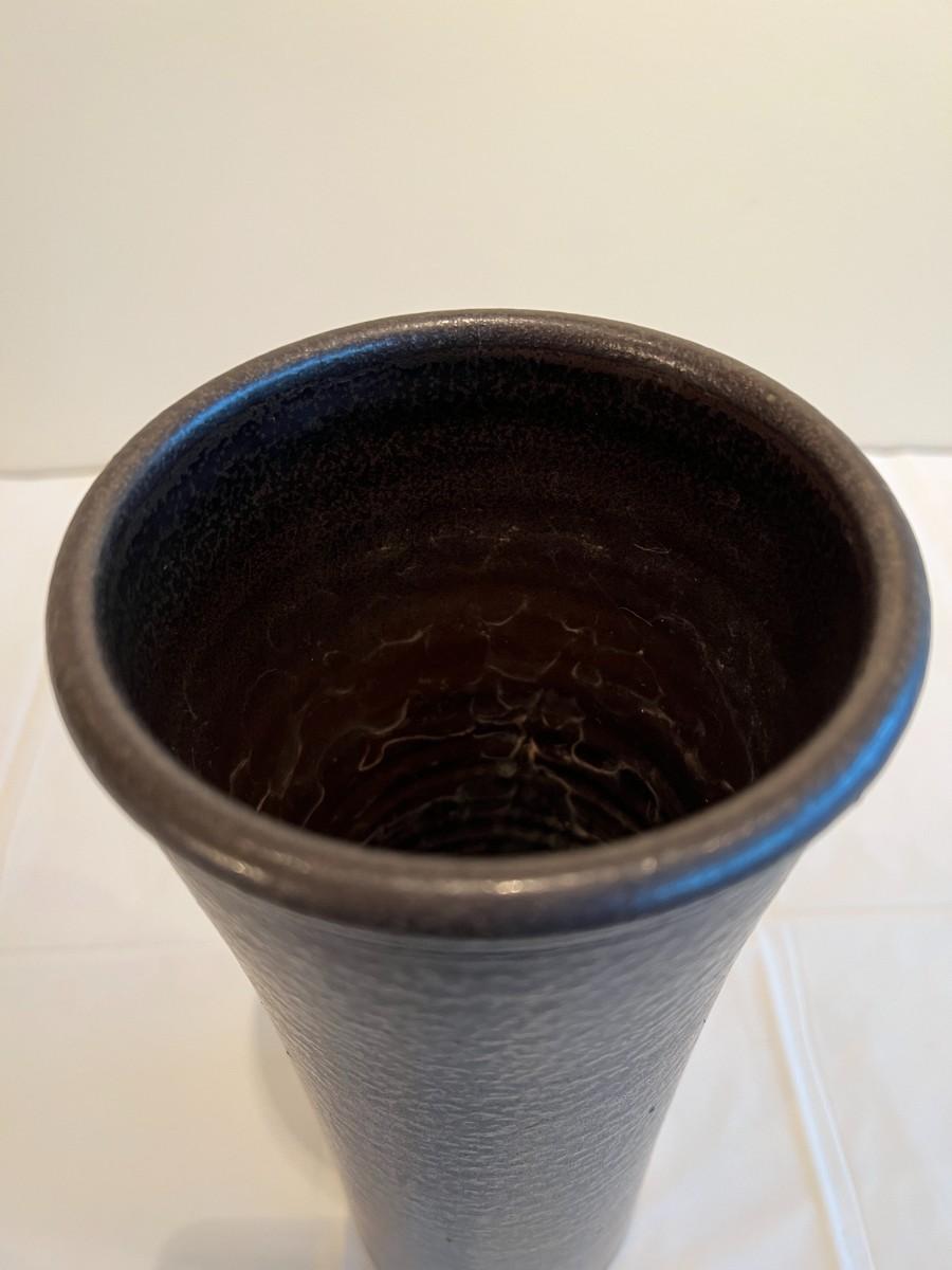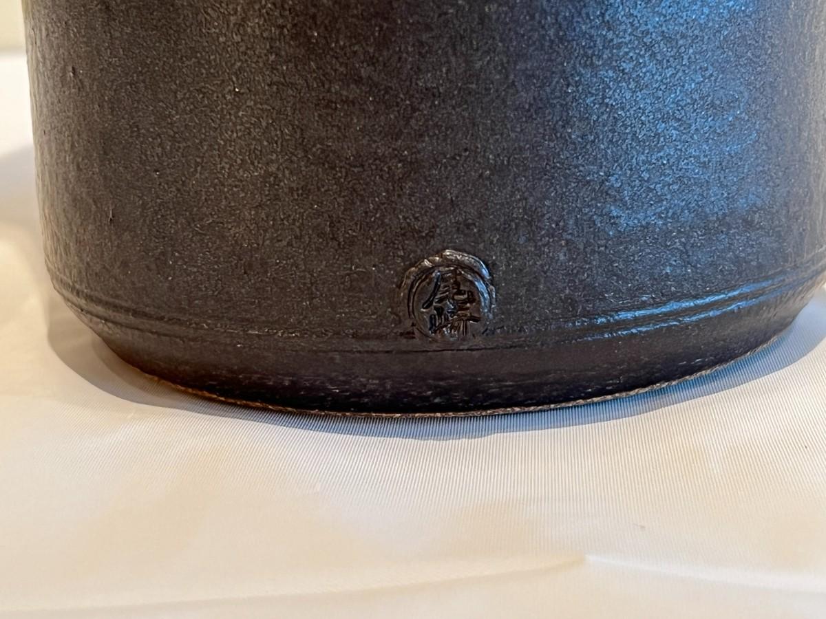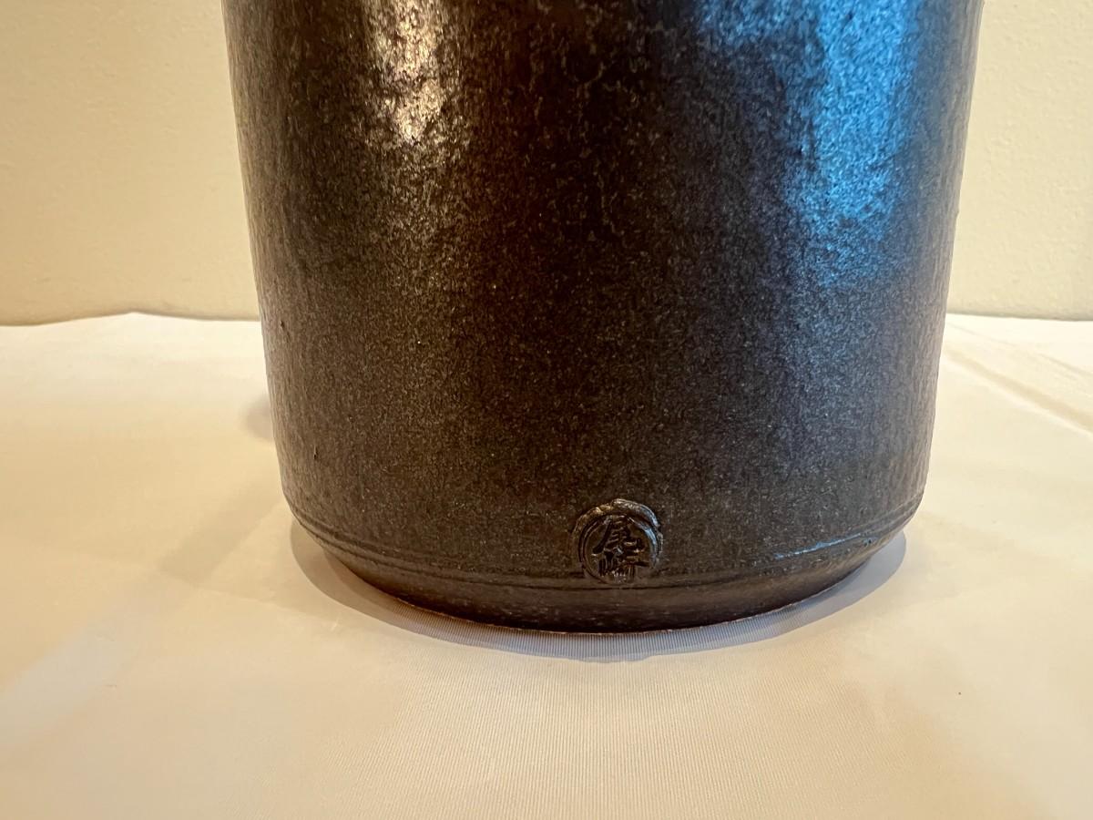 Beautiful Asian (appears to be a more antiquated form of Chinese characters) dark brown or black glazed ceramic vase. Glaze has a unique texture and color. Stamp is impressed into the vase (as shown in photos). Very good condition,