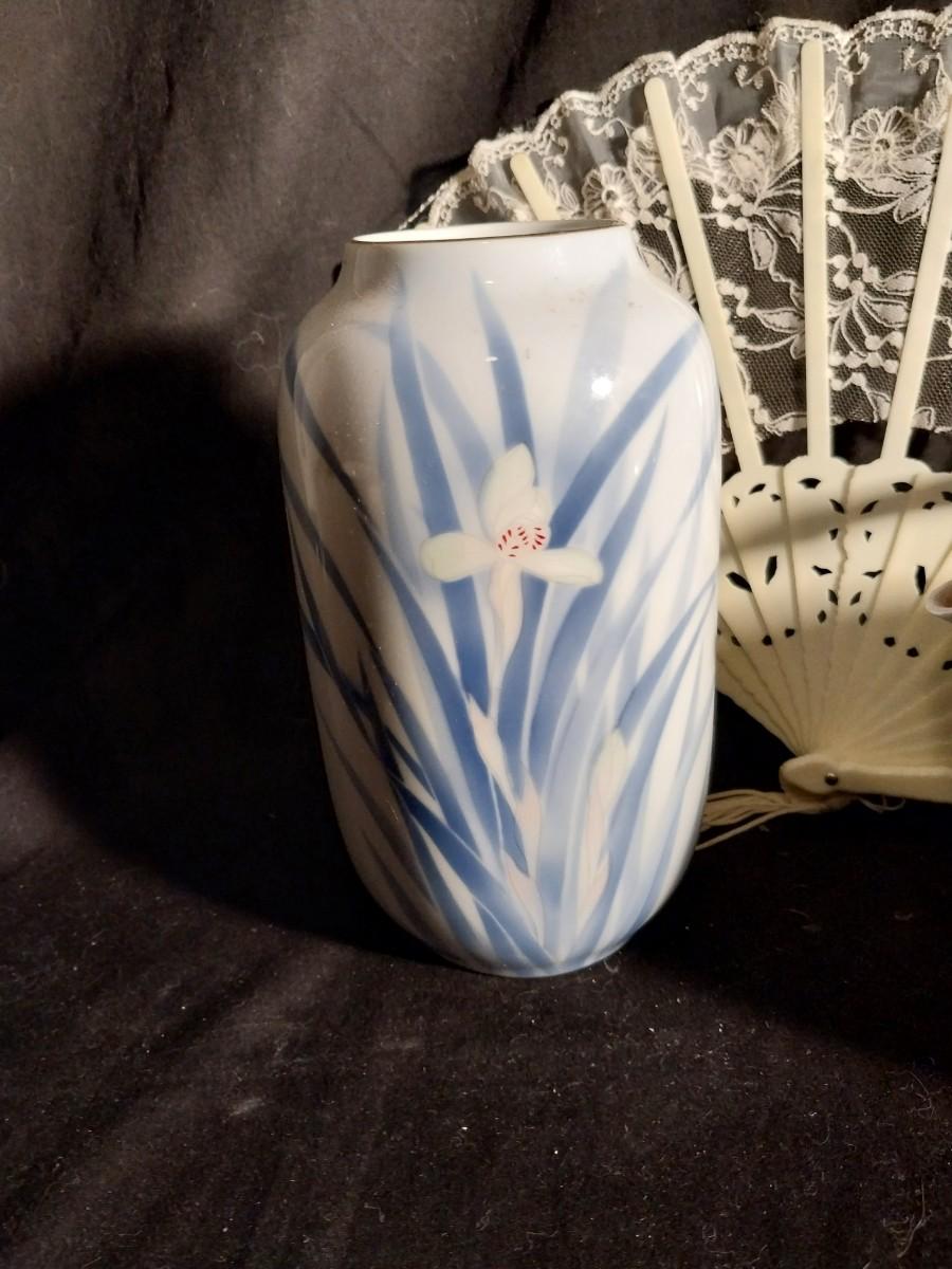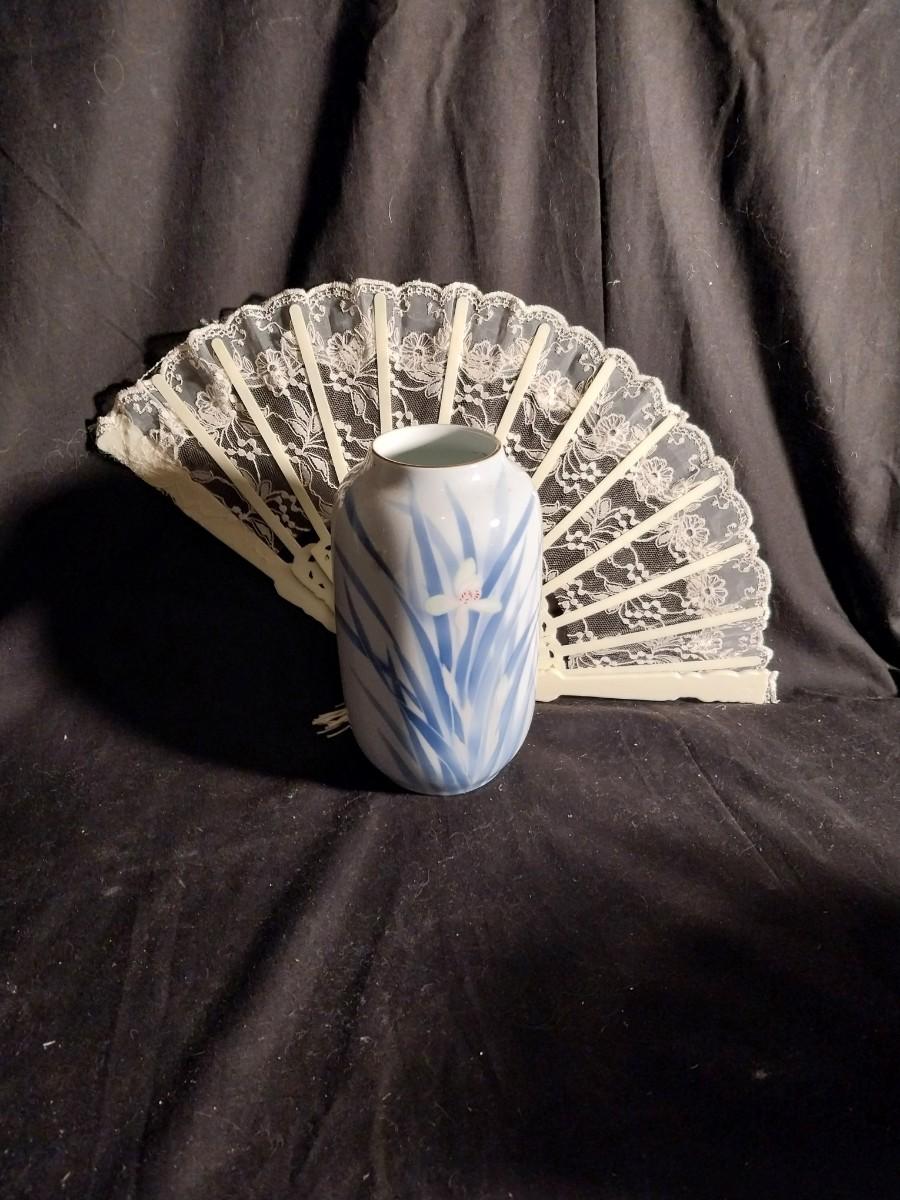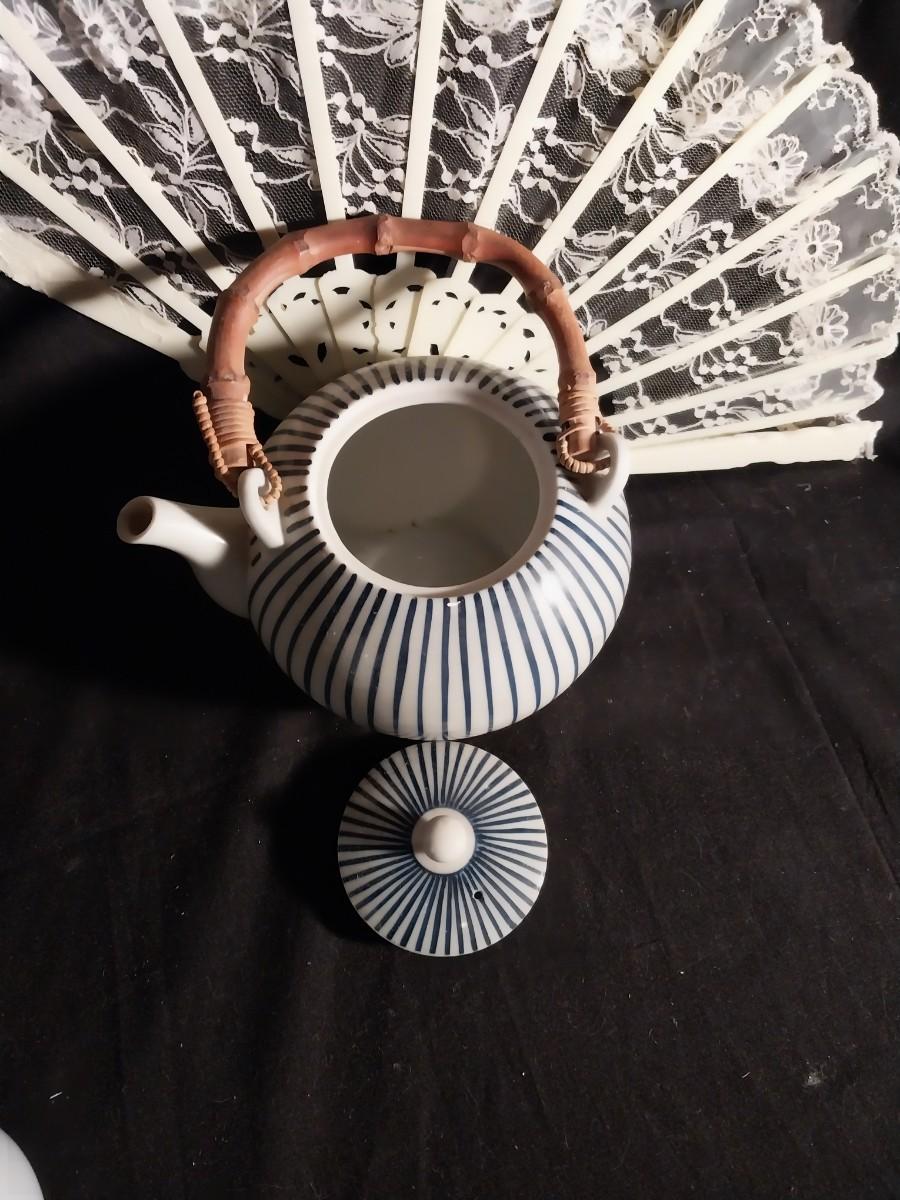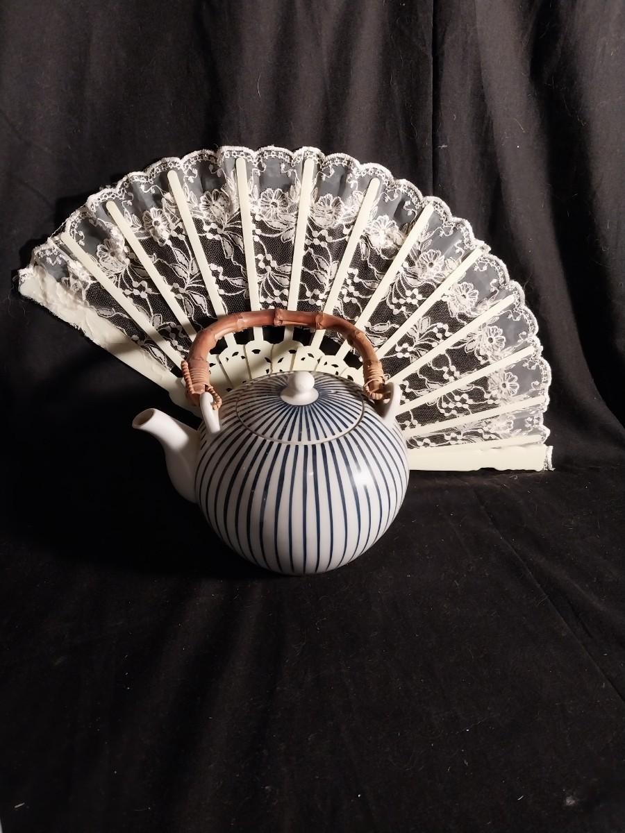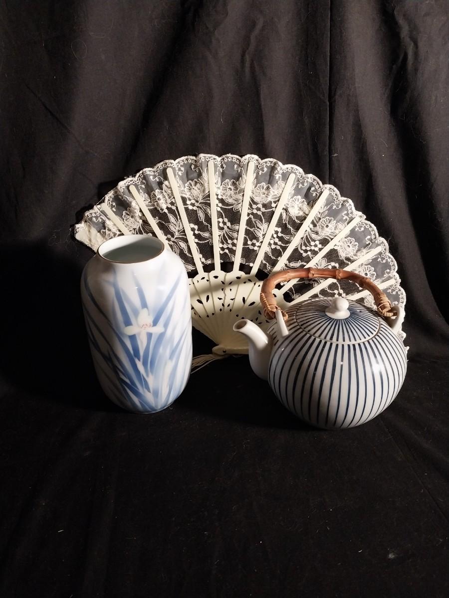 BEAUTIFUL ASIAN STYLE TEAPOT WITH BAMBOO HANDLE-VASE AND HANDFAN