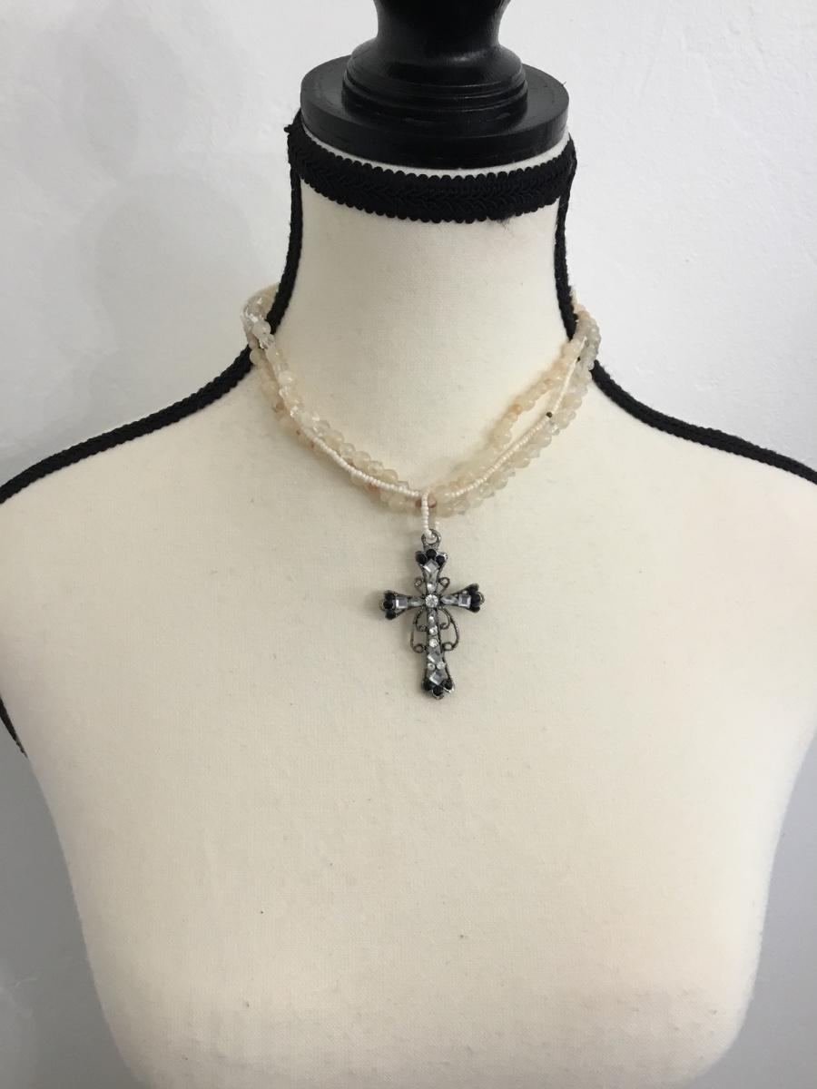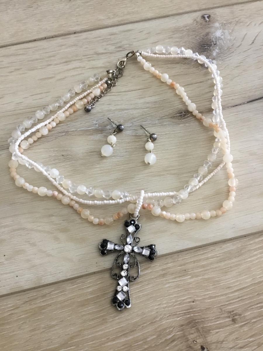 Beautiful beaded choker necklace with silver tone, cross pendant, and matching earrings