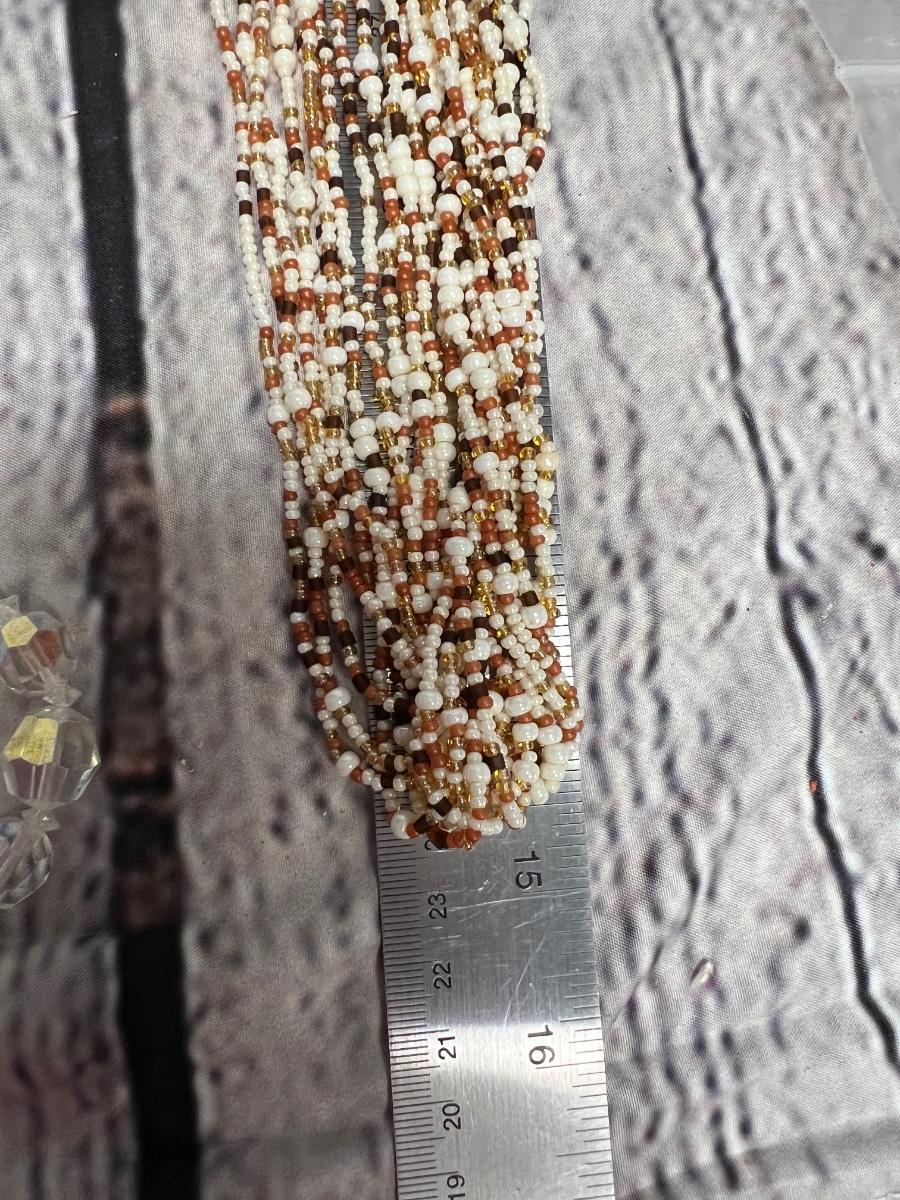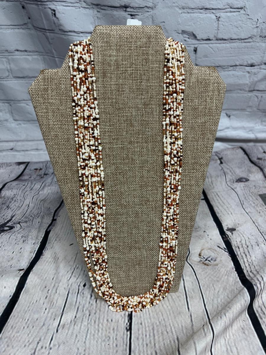I just love this multicolored beaded necklace. It’s done and browns and white. The measurement is on the pictures. It is gorgeous.