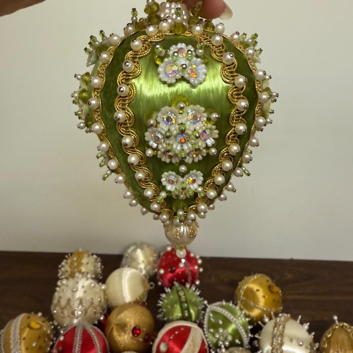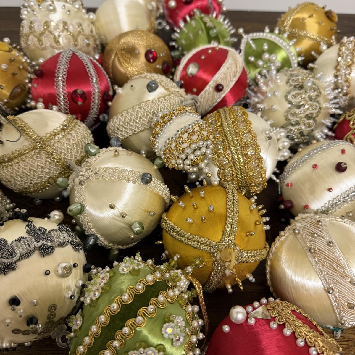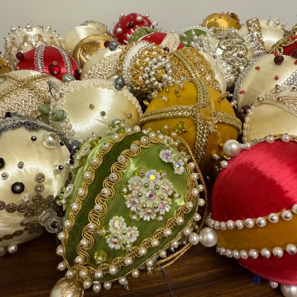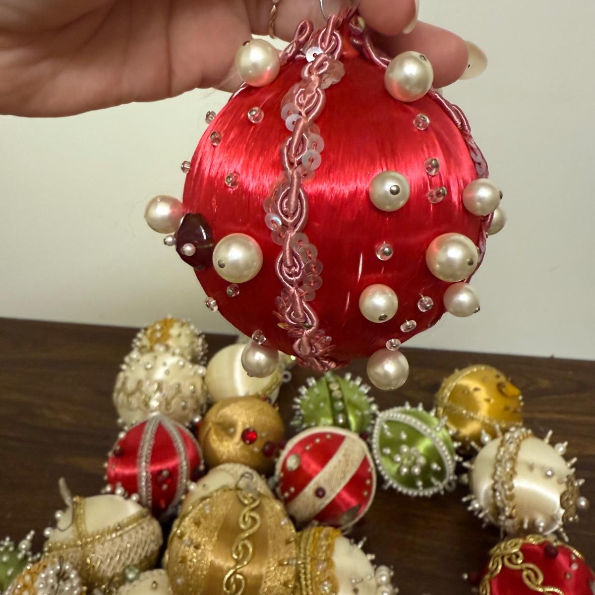 This lot contains 30+ stunning beaded sateen ornaments. Each one has a unique design and is brimming with celebratory decoration. Most have hardware to be hung but some are missing their fisheye, see pictures for details. Most are approximately 3”, some are smaller. See pictures for details. Shipping available.