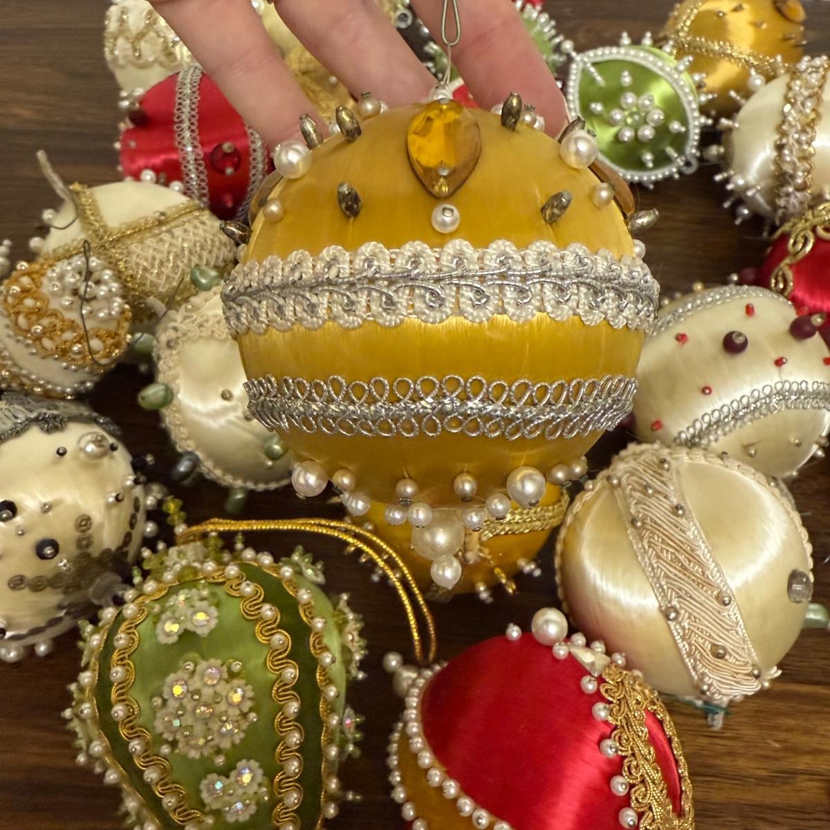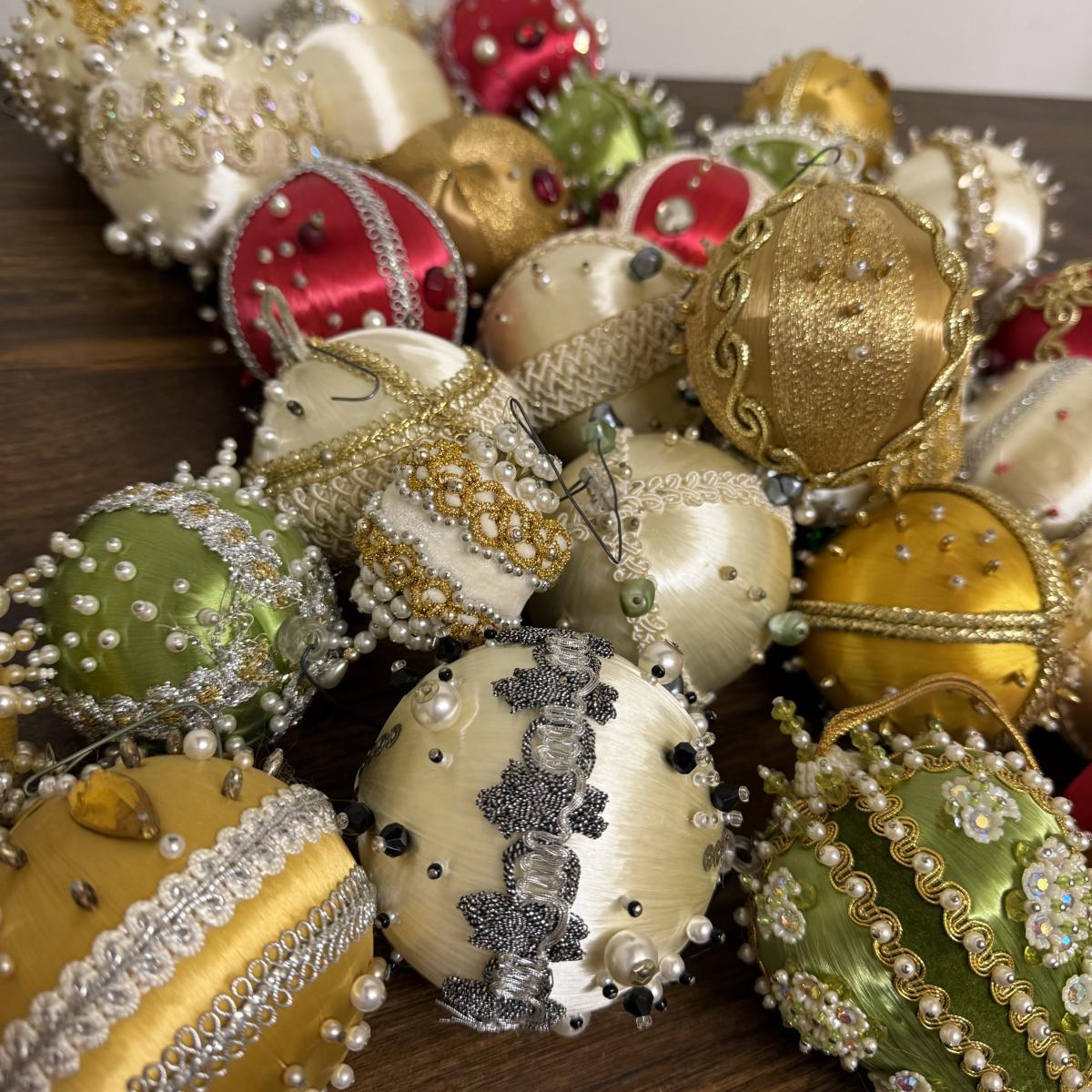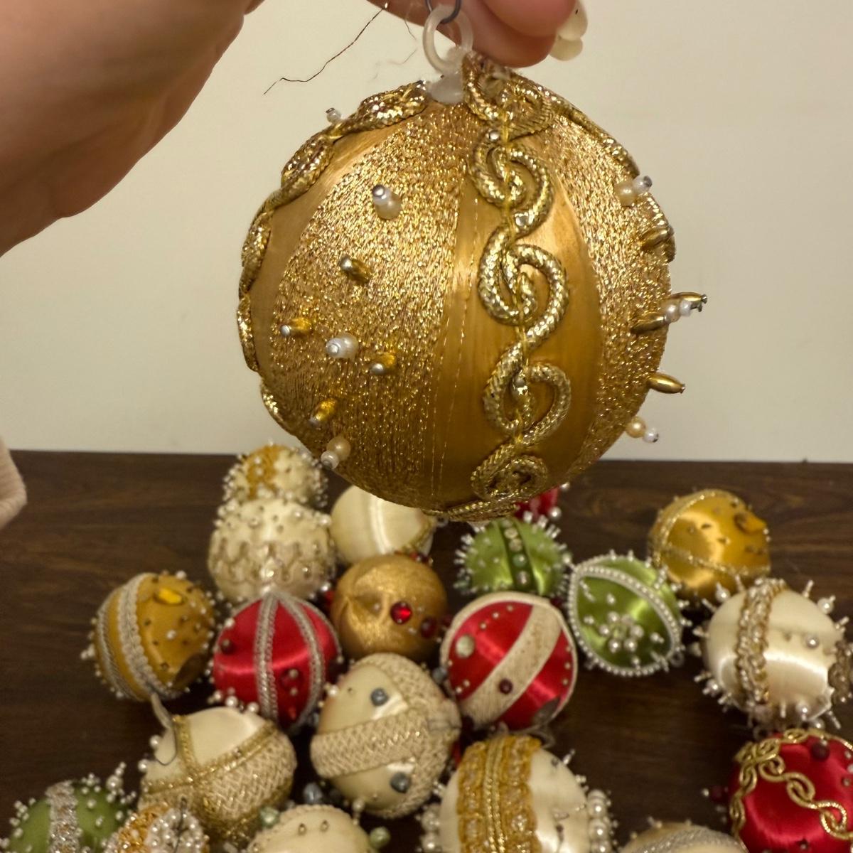 This lot contains 30+ stunning beaded sateen ornaments. Each one has a unique design and is brimming with celebratory decoration. Most have hardware to be hung but some are missing their fisheye, see pictures for details. Most are approximately 3”, some are smaller. See pictures for details. Shipping available.