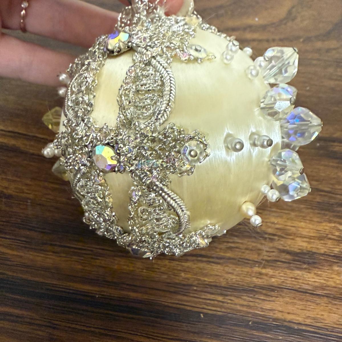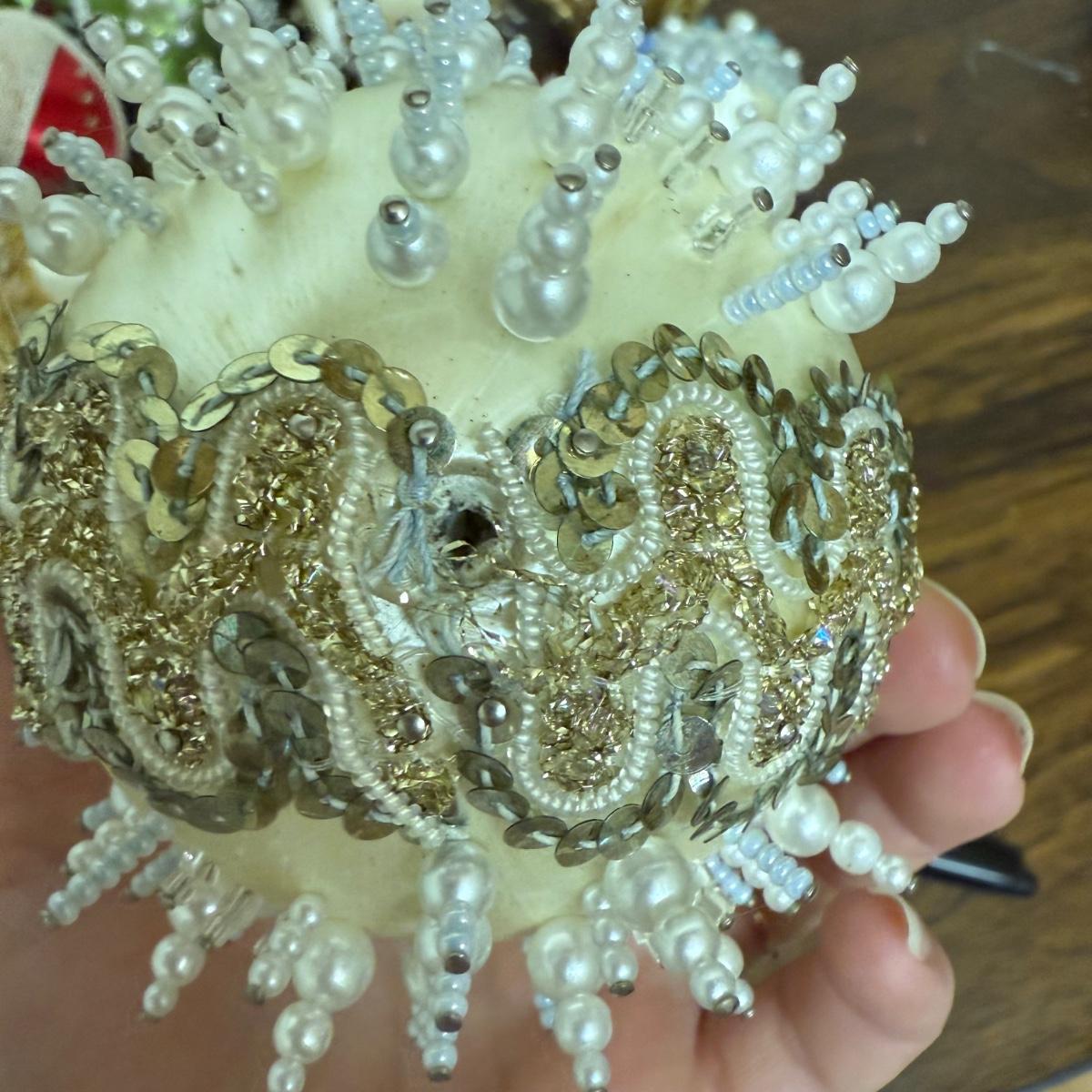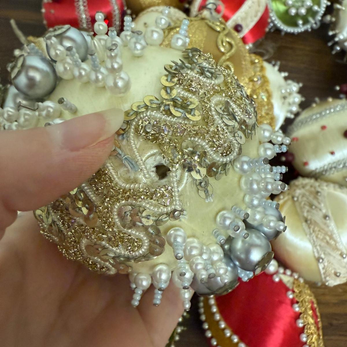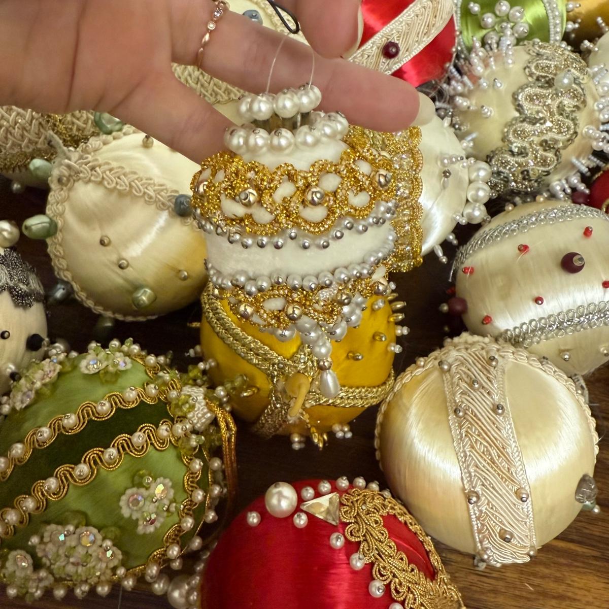 This lot contains 30+ stunning beaded sateen ornaments. Each one has a unique design and is brimming with celebratory decoration. Most have hardware to be hung but some are missing their fisheye, see pictures for details. Most are approximately 3”, some are smaller. See pictures for details. Shipping available.