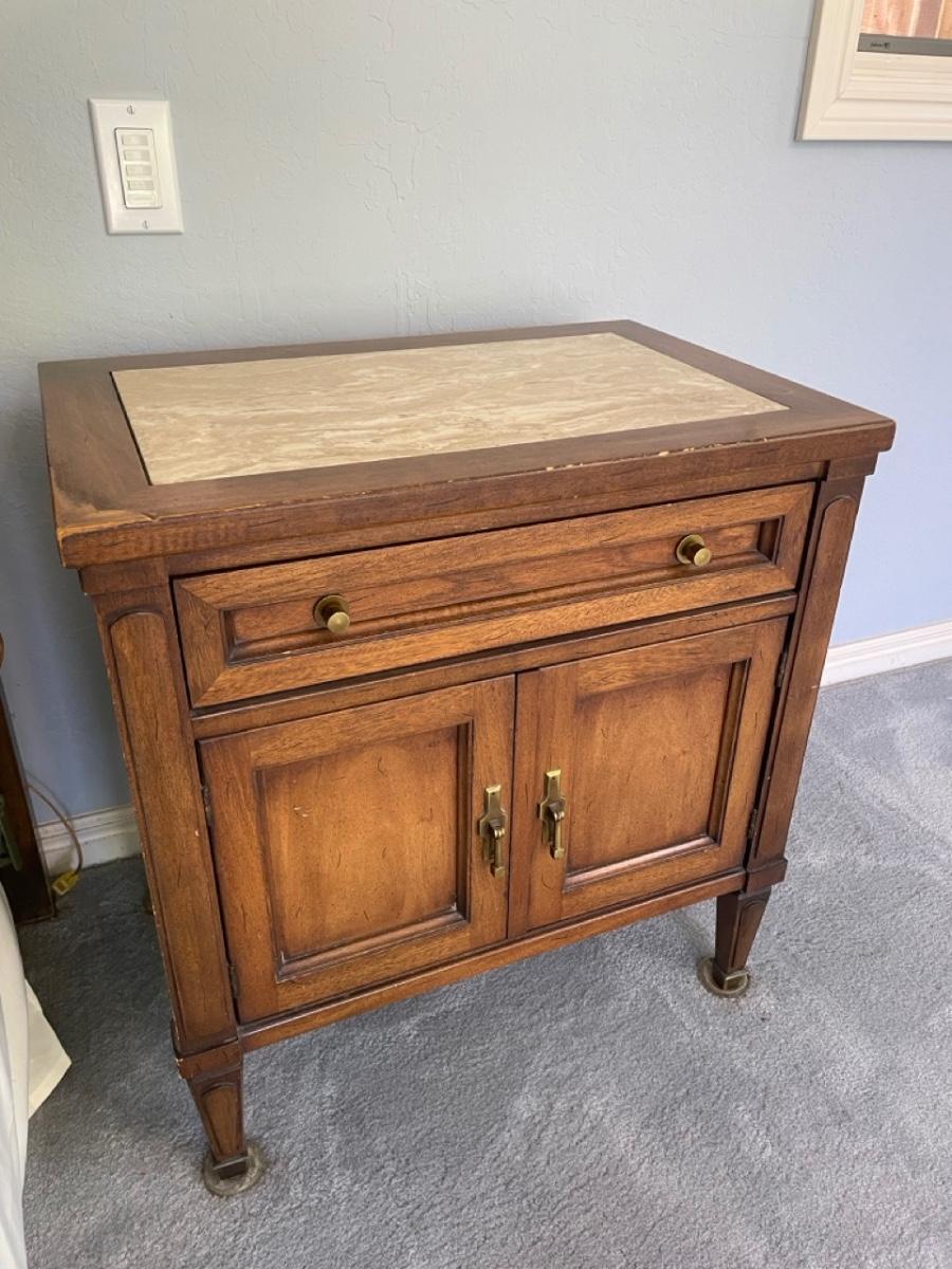Solid wood. Stone top. Some light wear on the front of one. Generally in very good shape. 24” x 16”