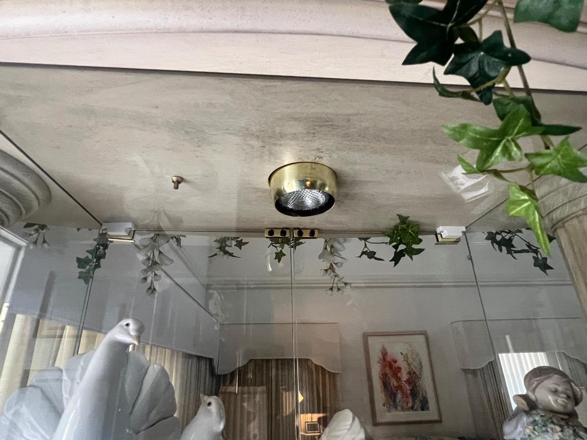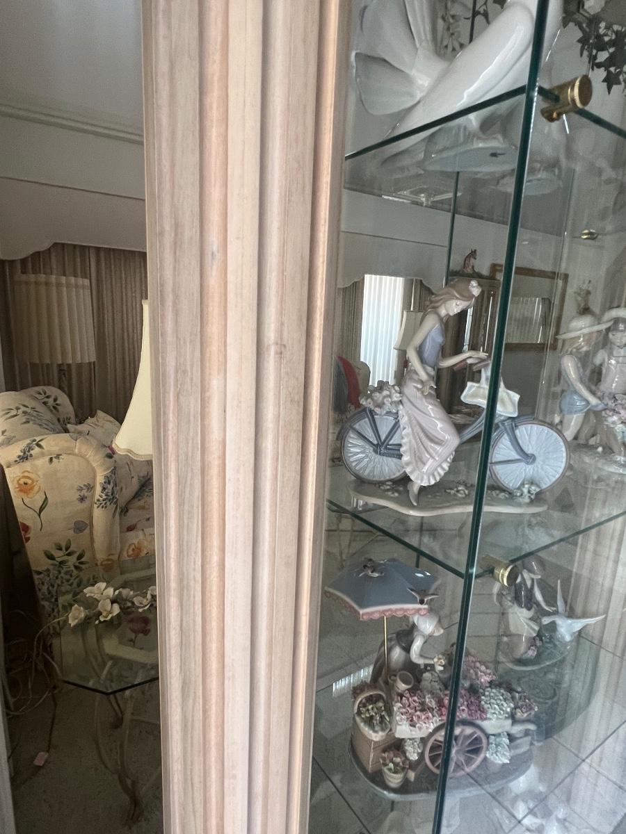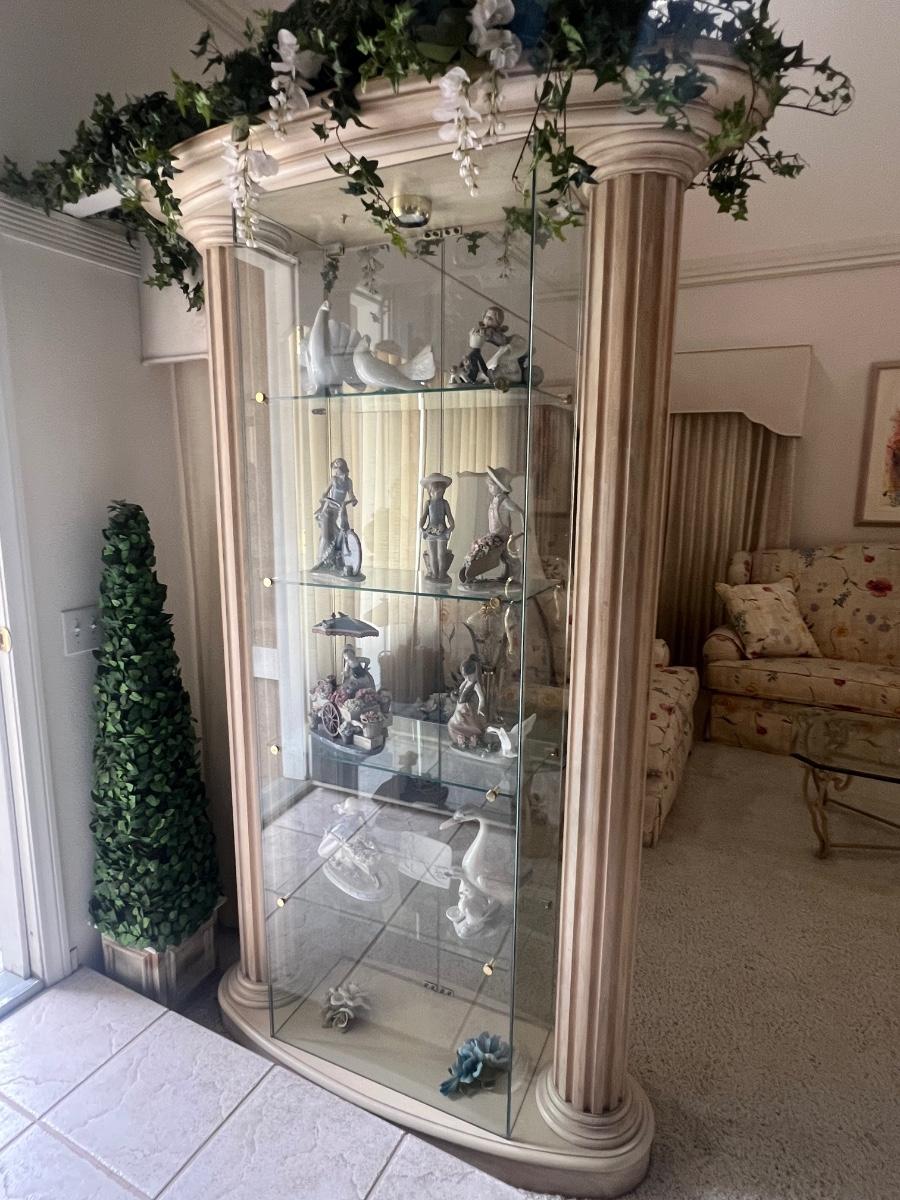 Center Glass display area is rectangular, viewable from front and back. Glass shelves, tap contains lights. Great condition, measures approx. 80" tall, 40" wide and 16" deep. Pickup will be arranged from very local home in Brea. Pictured Figurines not included.