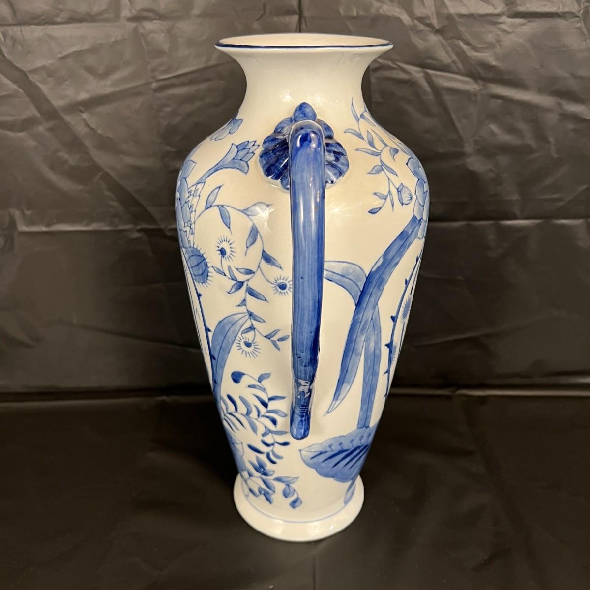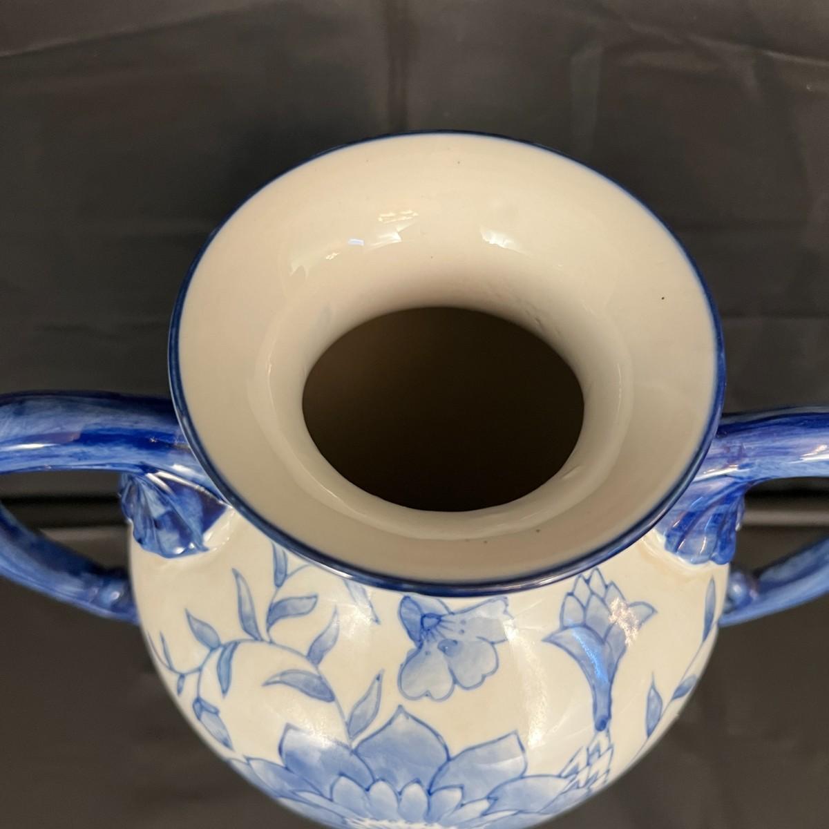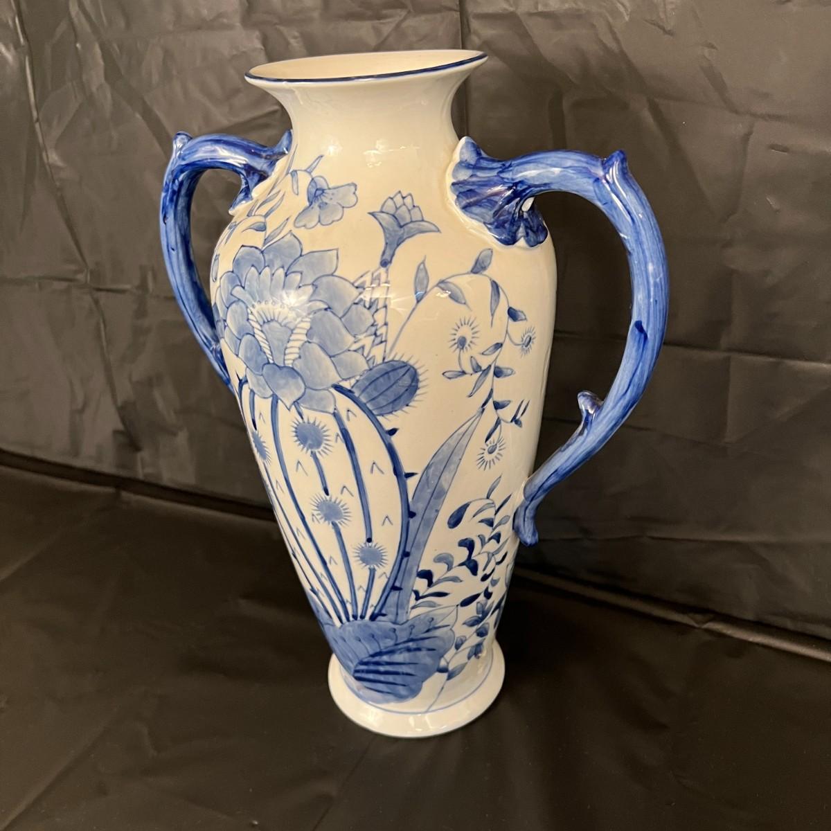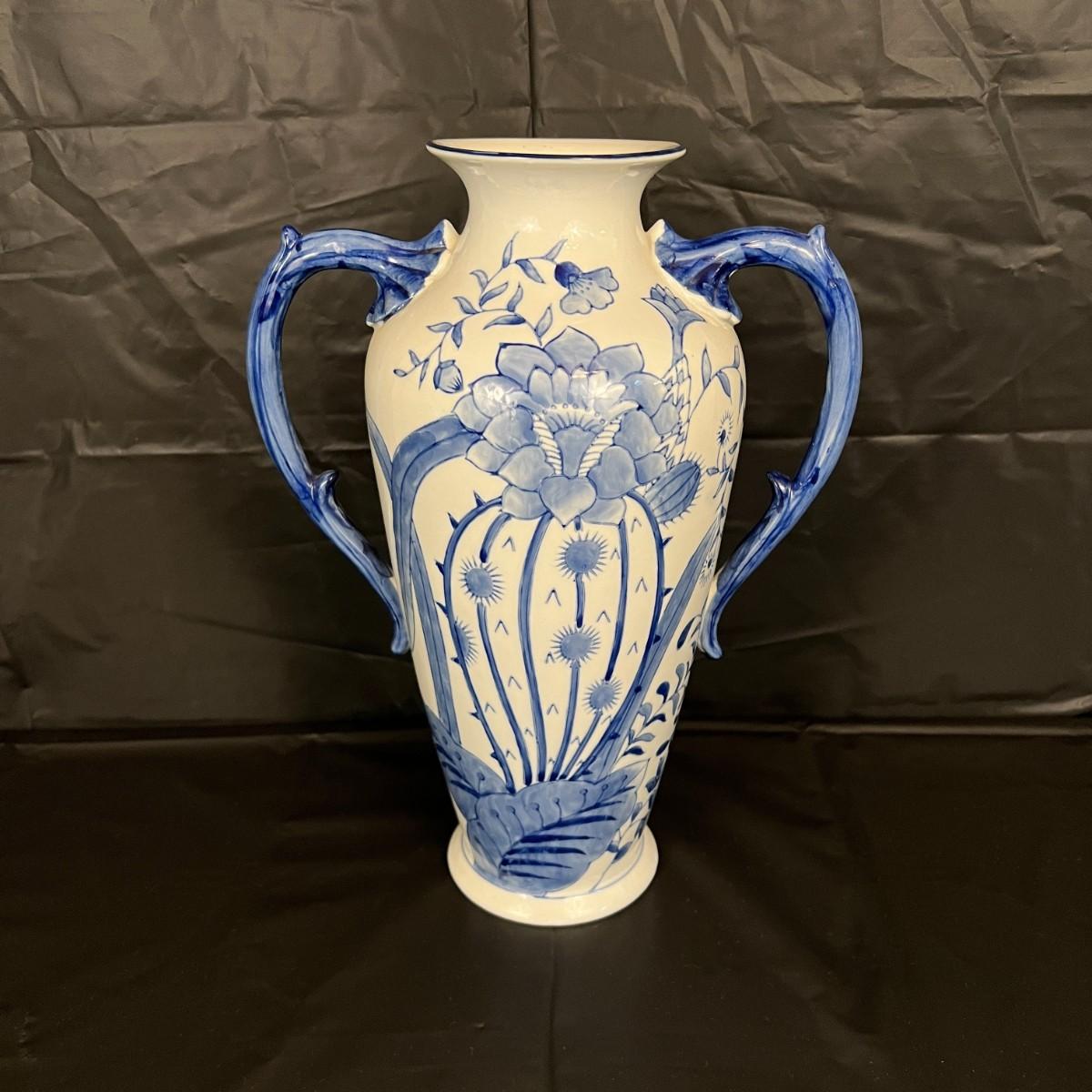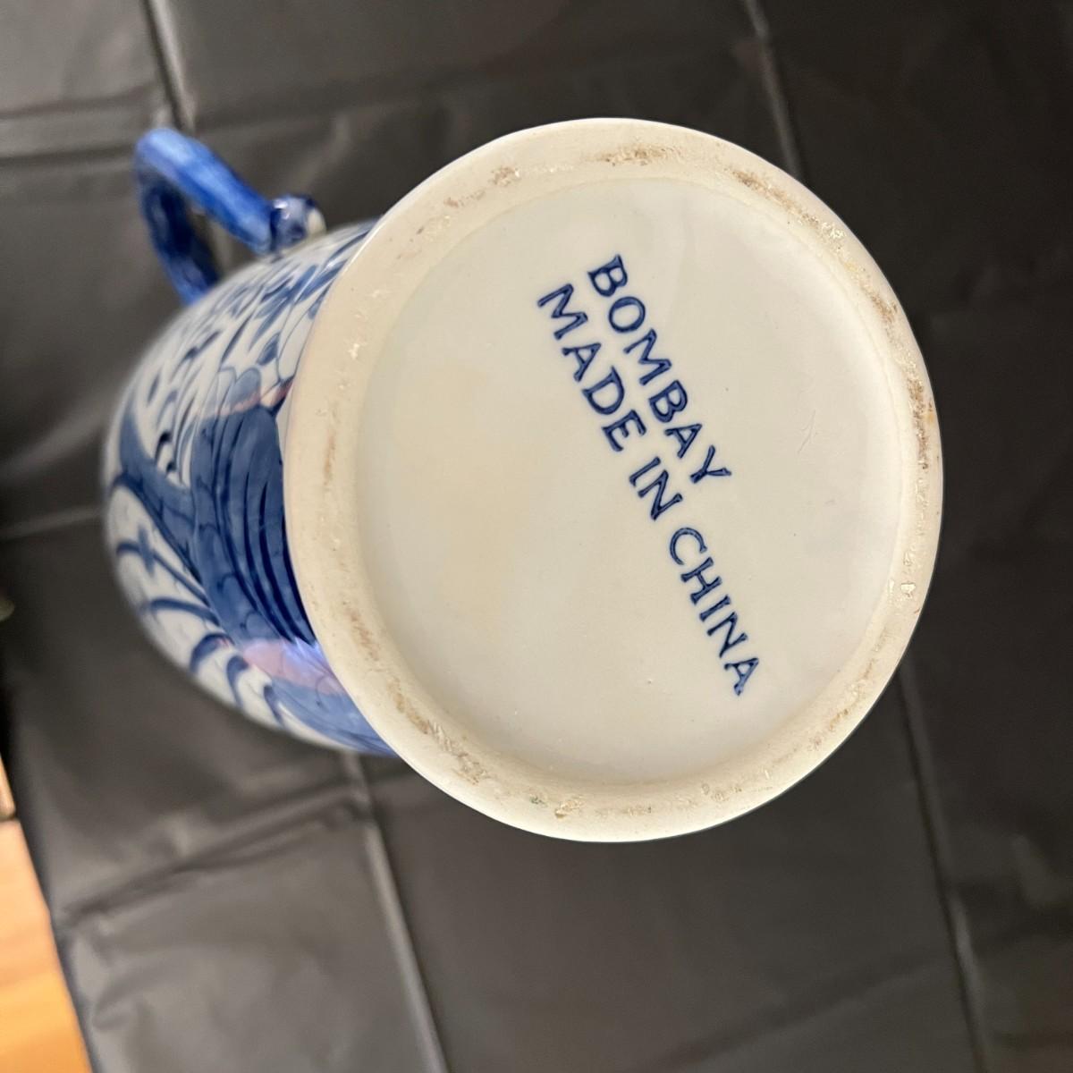 Beautiful Vintage Bombay Chinese Blue and White Glazed Amphorae Vase with Handles, featuring a lotus flower design.