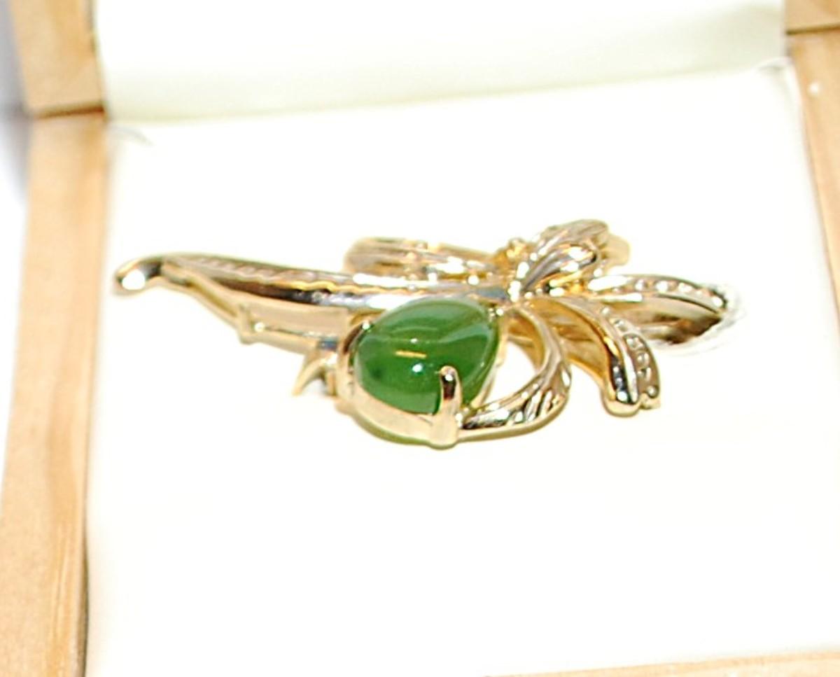 Beautiful "Canadian Jade" BROOCH (1¼" x ¾") with Oval Green Stone and Gold Colored Accent Bowtie on a Gold Tone Setting & BOX
