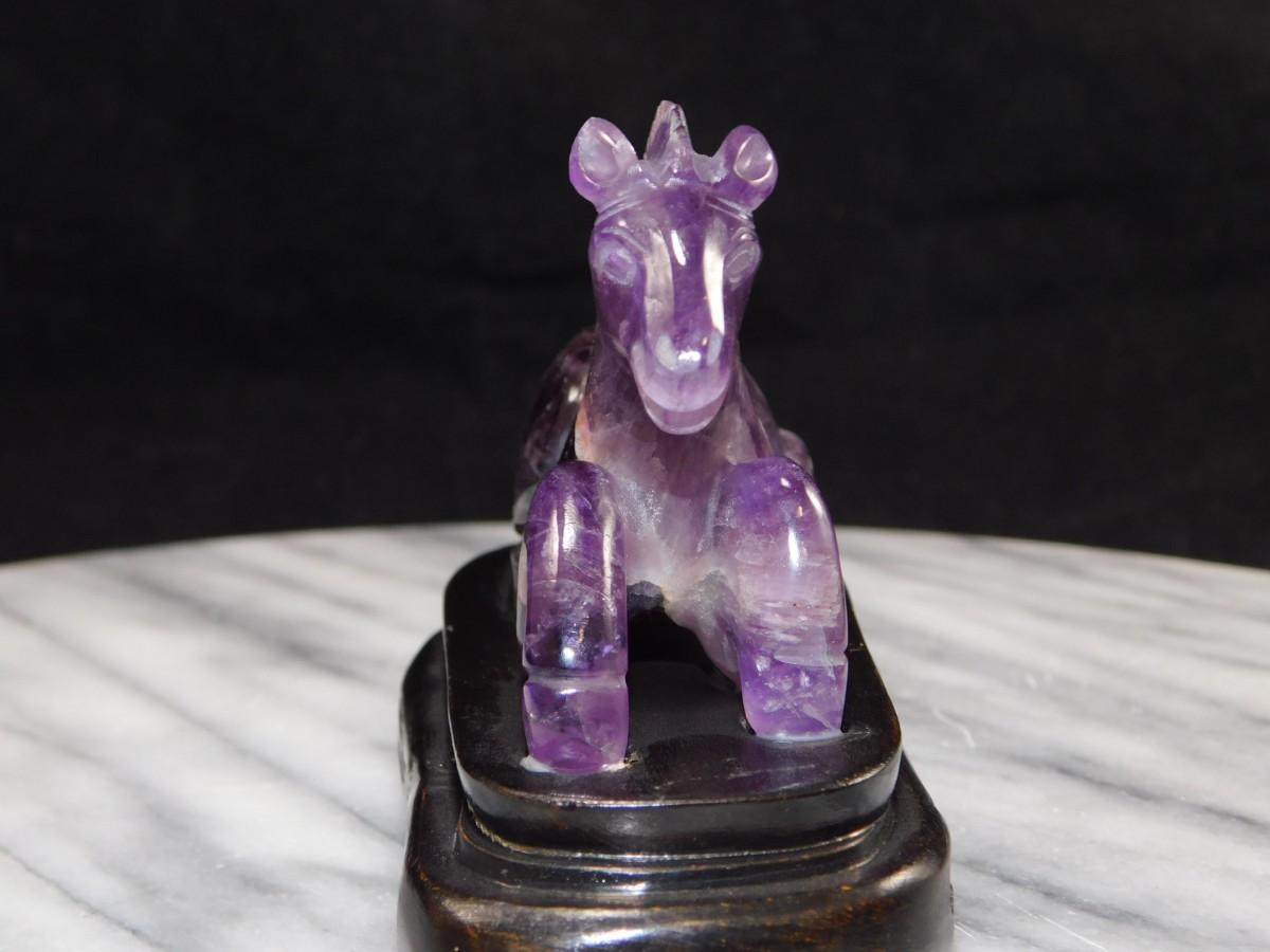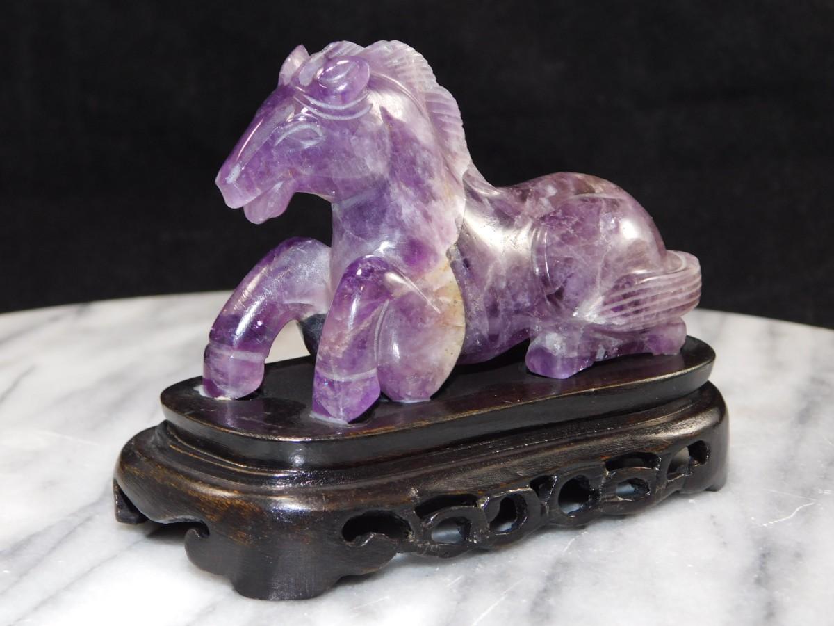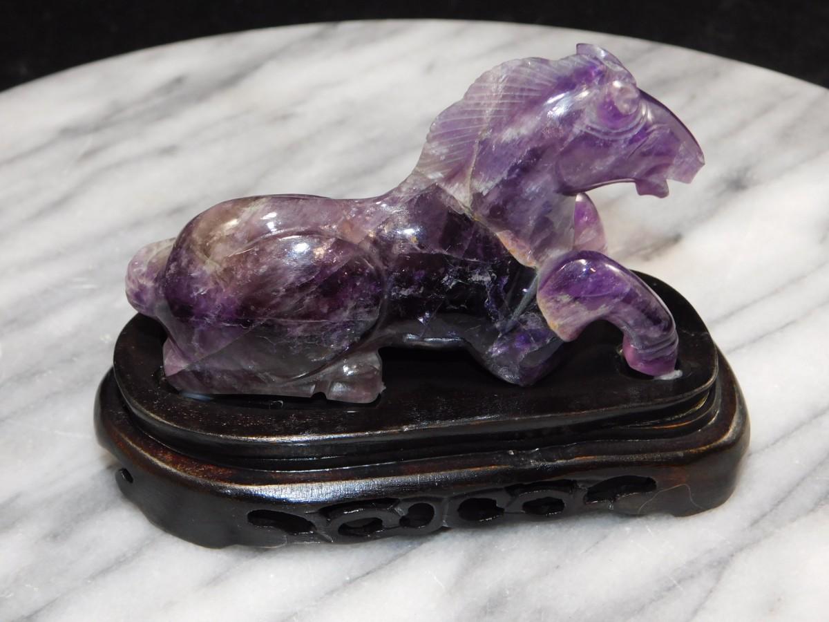 Beautiful Carved Amethyst Horse on Wooden Base 3” Tall