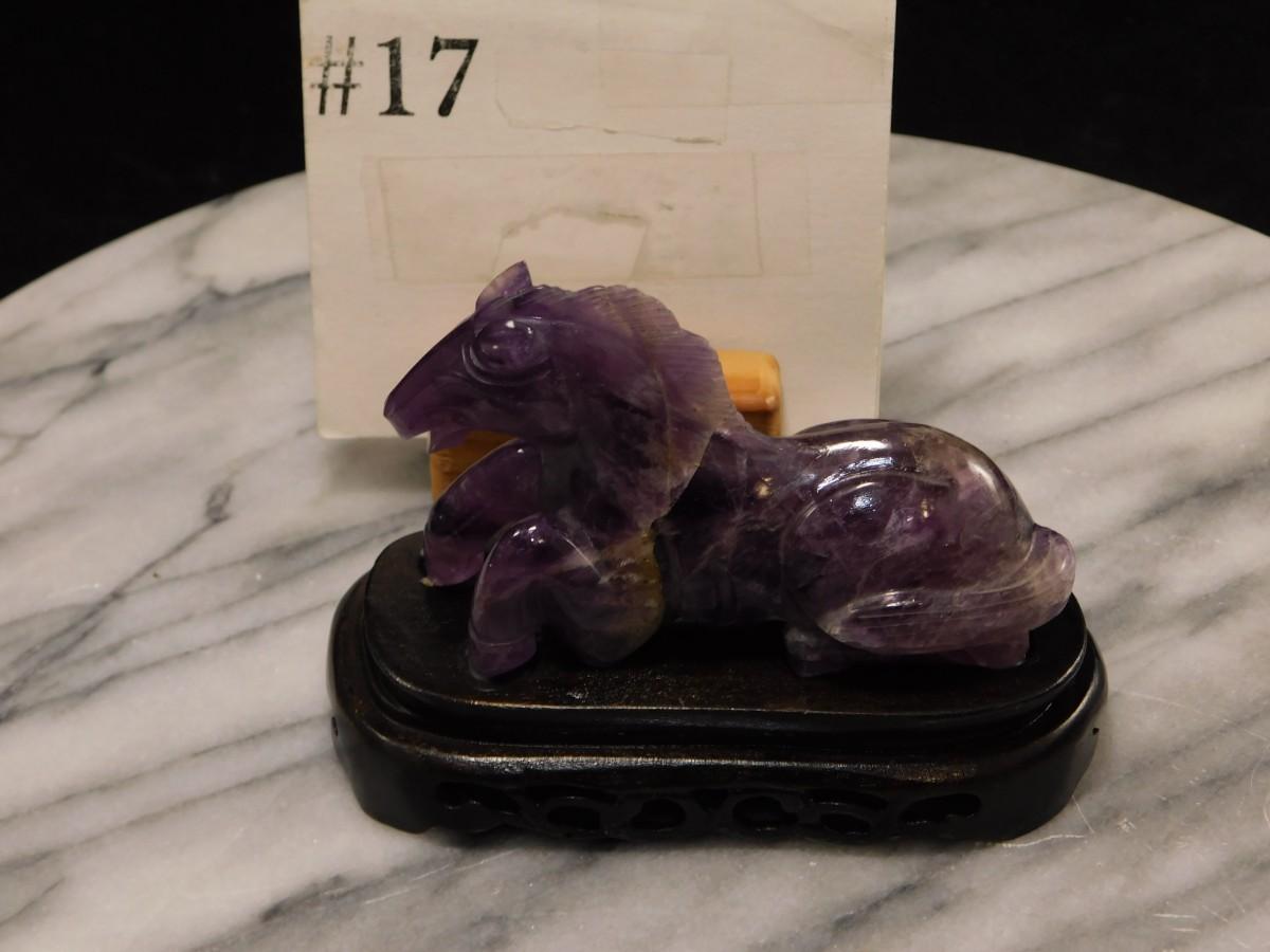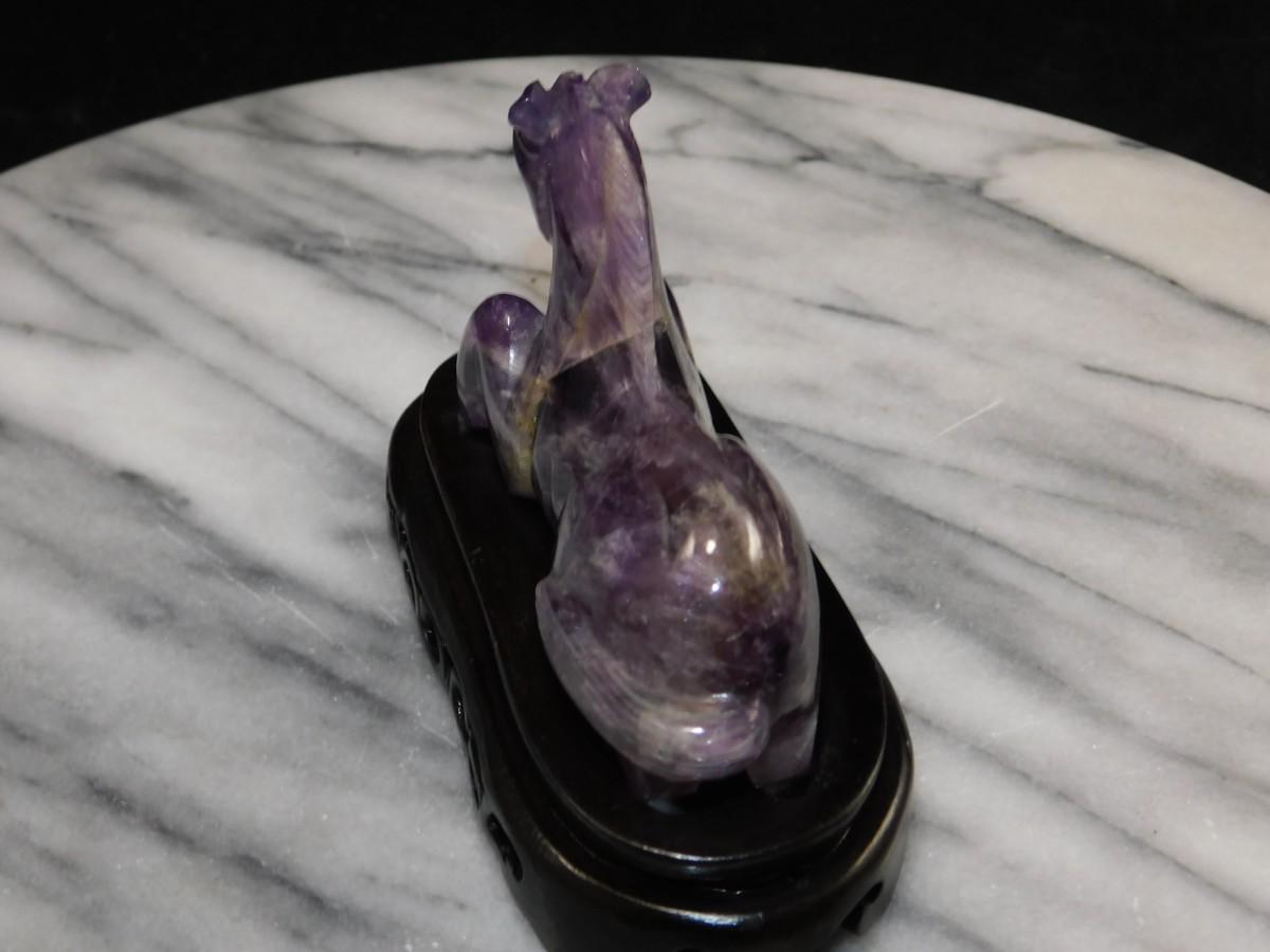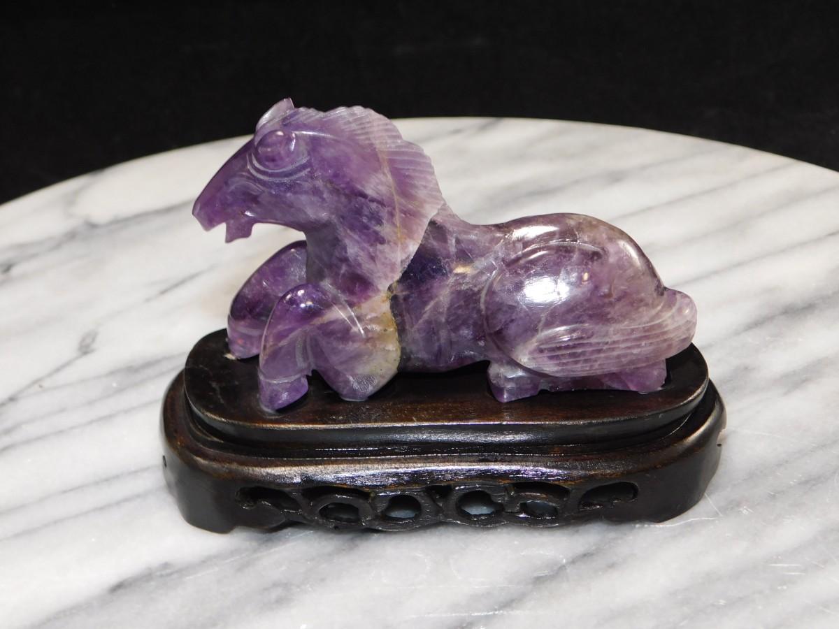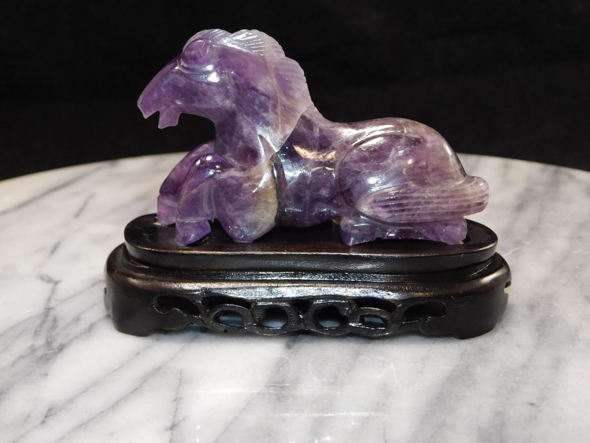 Beautiful Carved Amethyst Horse on Wooden Base 3” Tall