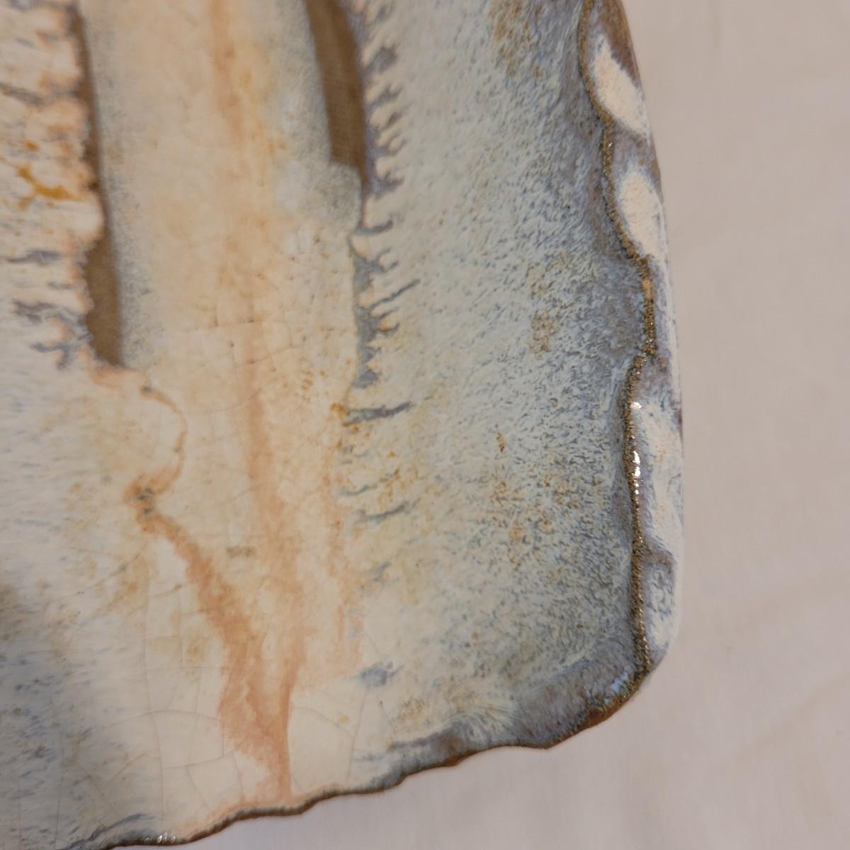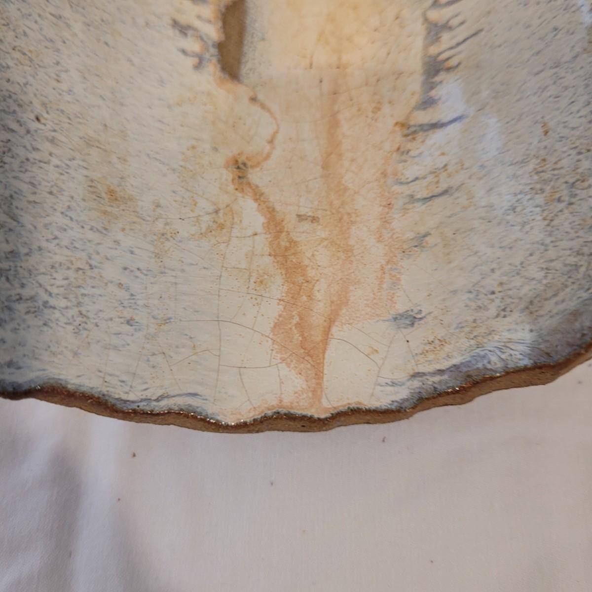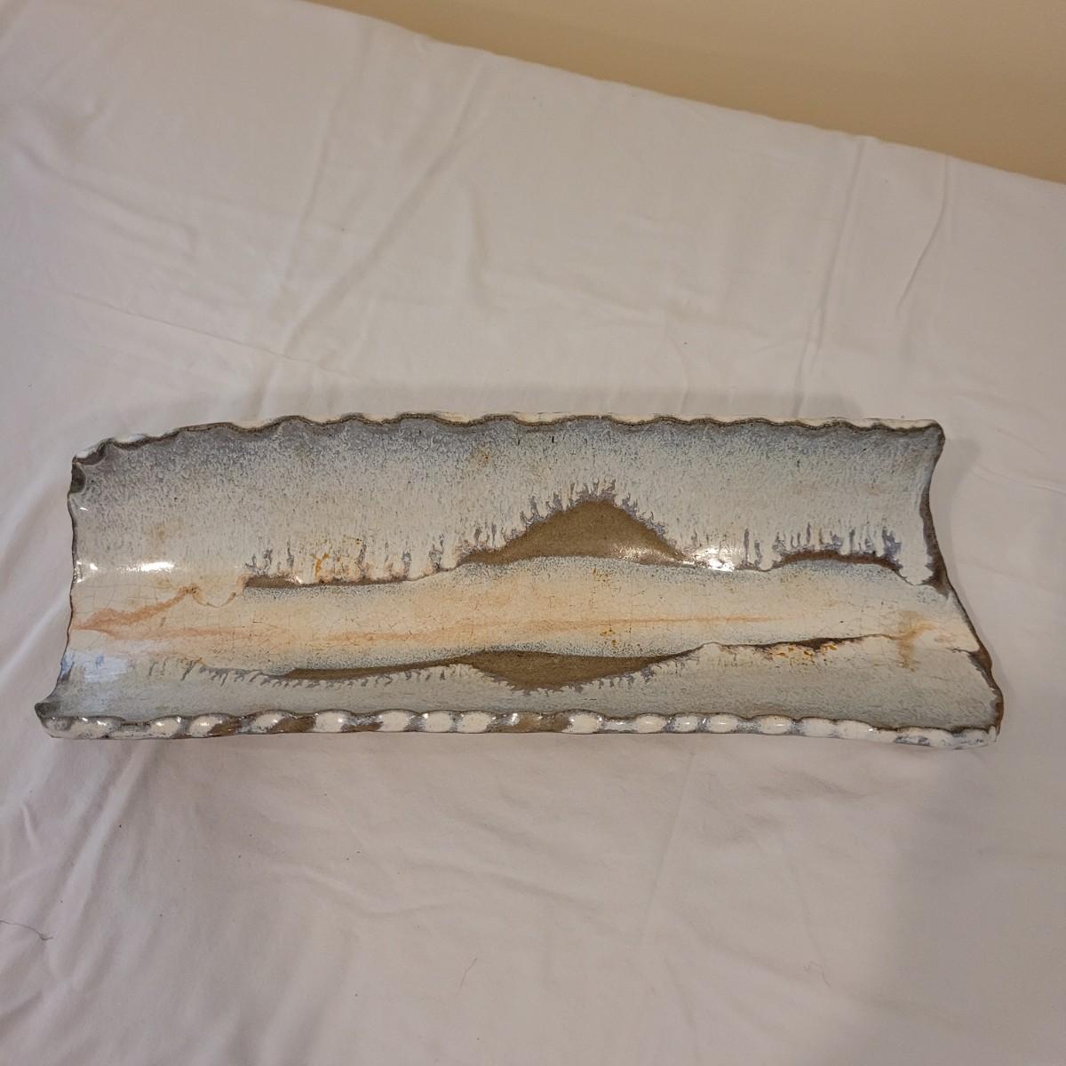 This beautiful, unique piece is a conversation starter! Glazed thick slab with an organic shape and textured edge creates an attractive piece that can stand on its own or be used as a fruit tray or for other small items. Measures approximately 15" x 5" x 3"H. Shipping available. Shipping can be costly. We suggest contacting our preferred local shipping provider, Postage Express, with dimensions and getting an estimate before bidding: (828) 670-5501or postageexpress@yahoo.com.