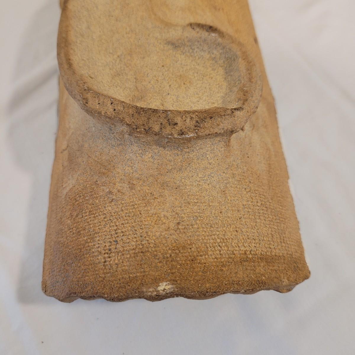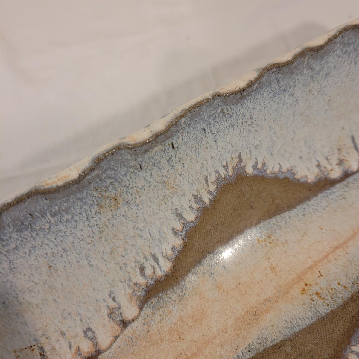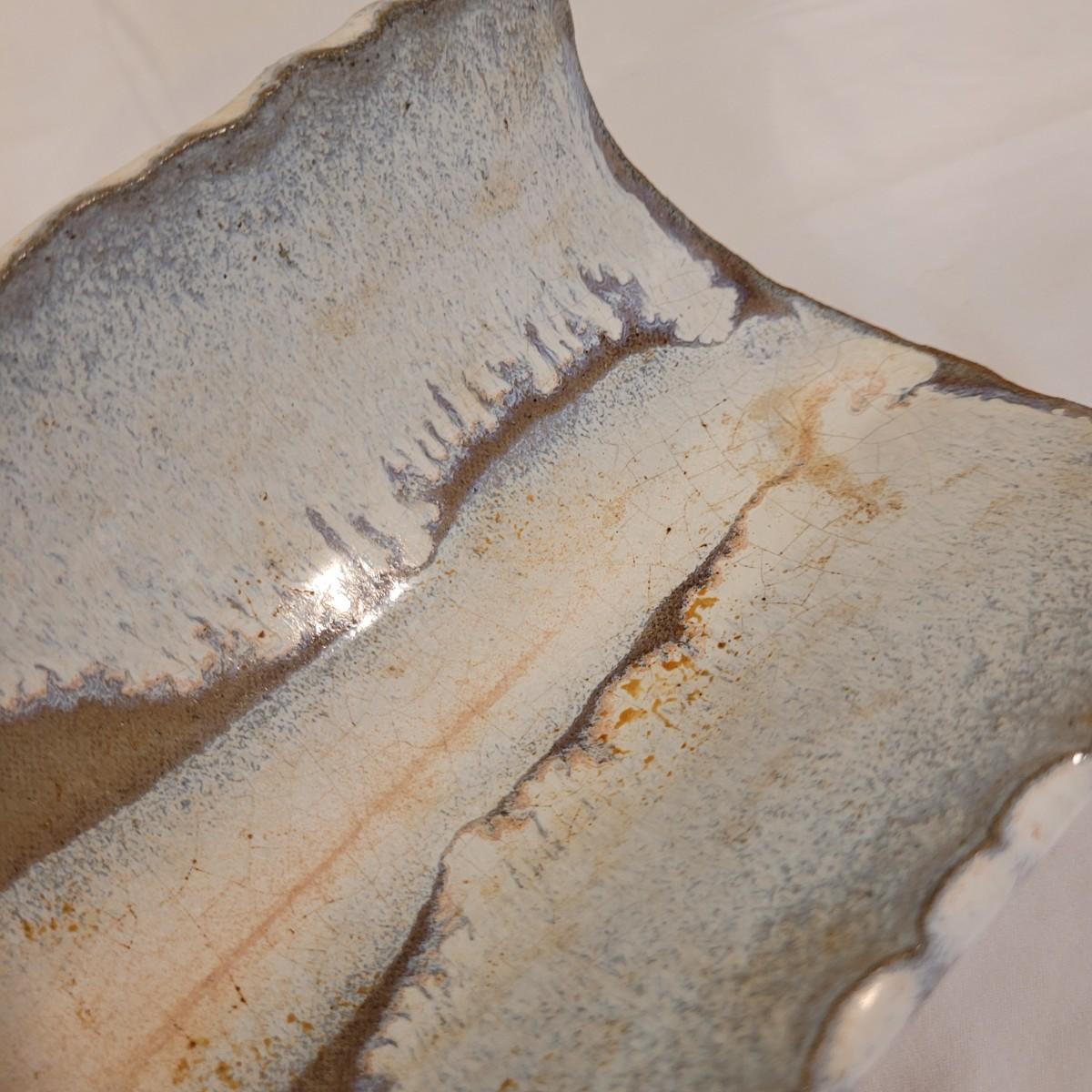 This beautiful, unique piece is a conversation starter! Glazed thick slab with an organic shape and textured edge creates an attractive piece that can stand on its own or be used as a fruit tray or for other small items. Measures approximately 15" x 5" x 3"H. Shipping available. Shipping can be costly. We suggest contacting our preferred local shipping provider, Postage Express, with dimensions and getting an estimate before bidding: (828) 670-5501or postageexpress@yahoo.com.
