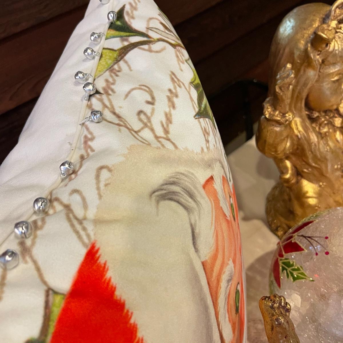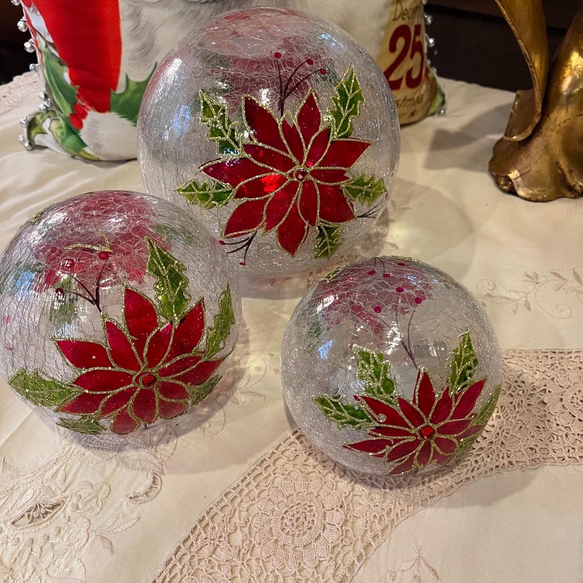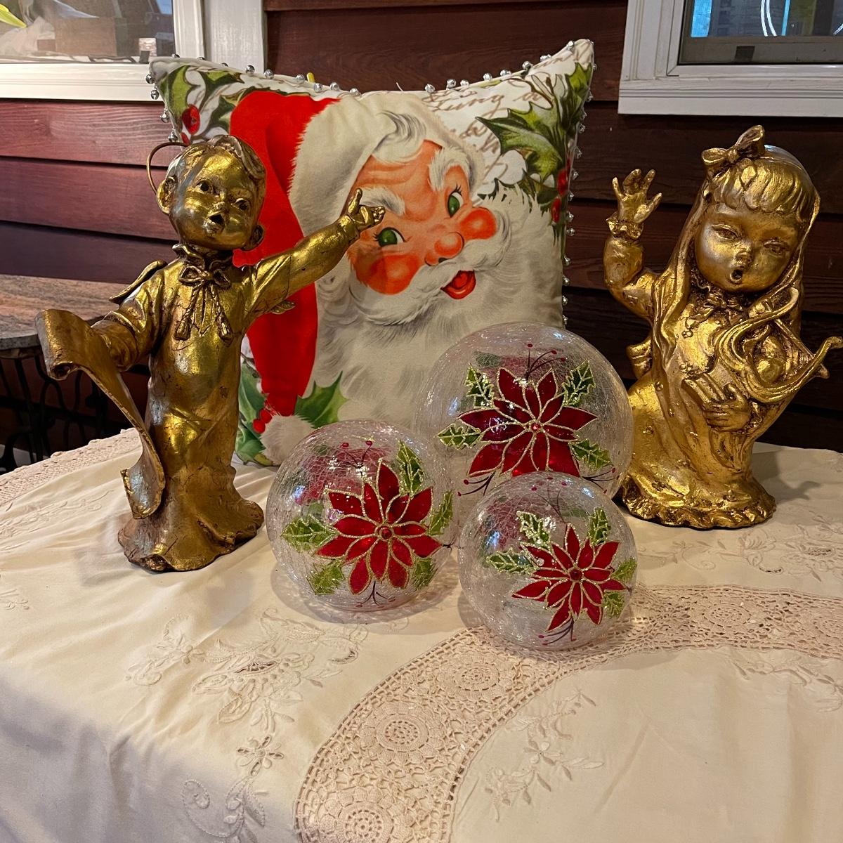 3-Crackle glass Poinsettia orbs that illuminate with AAA batteries. Large: 8” round, Medium: 6-1/2” round and Small: 4-1/2” round. Pair of gold resin carolers are approx 15” H x 12” wide each. Traditional 18”x18” Santa Pillow is missing 1 jingle but can easily be replaced. (see photo)