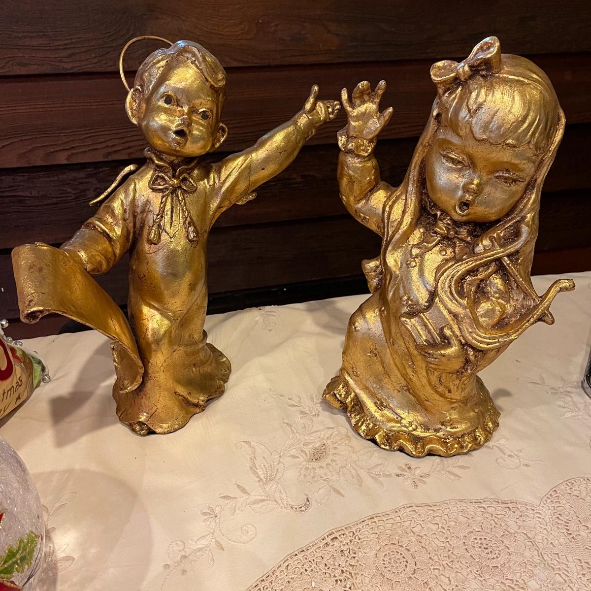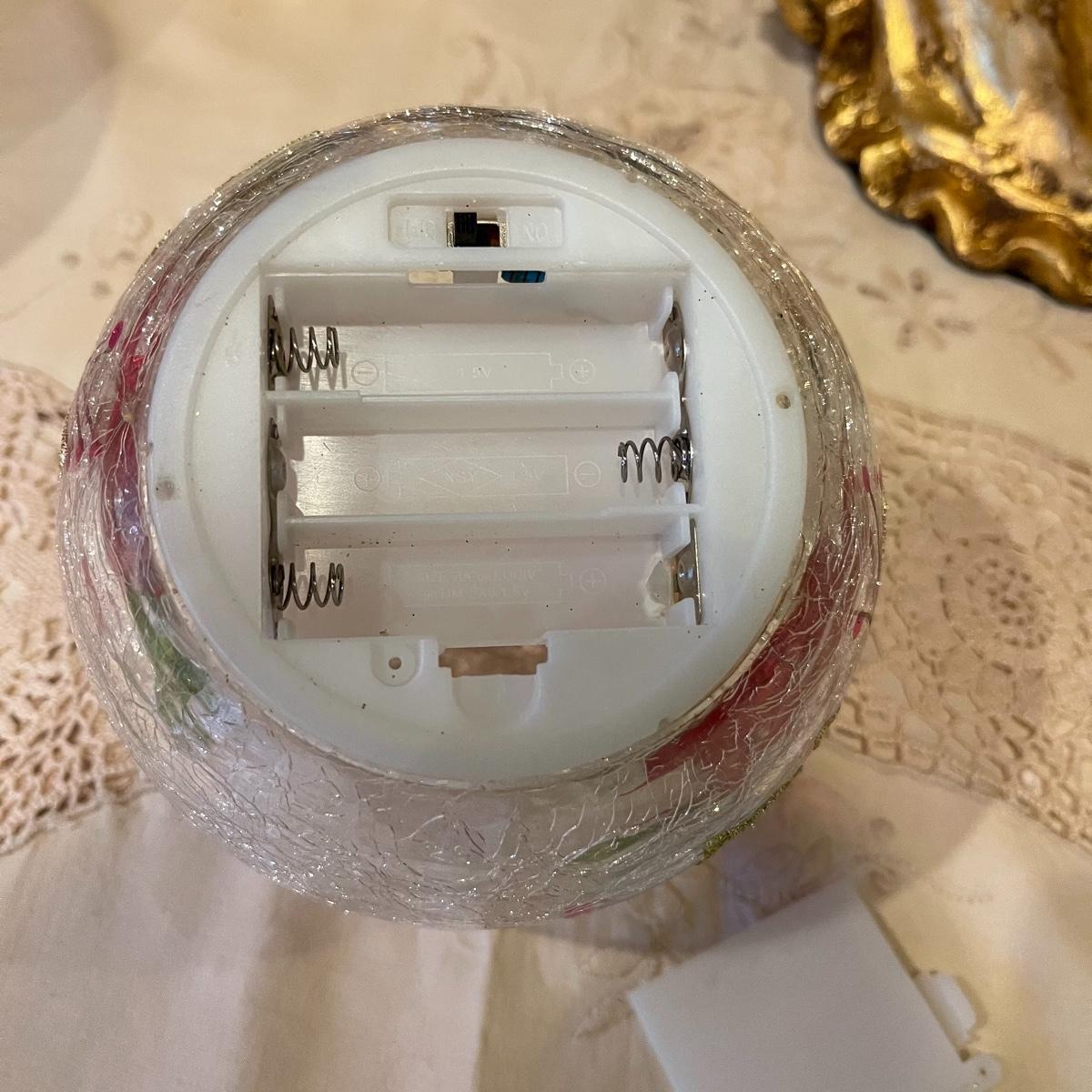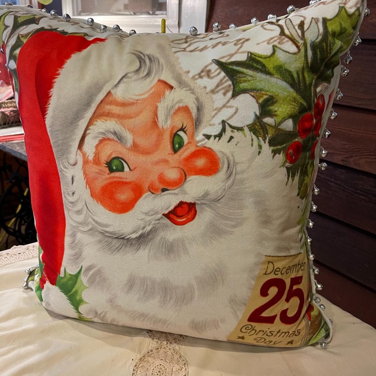 3-Crackle glass Poinsettia orbs that illuminate with AAA batteries. Large: 8” round, Medium: 6-1/2” round and Small: 4-1/2” round. Pair of gold resin carolers are approx 15” H x 12” wide each. Traditional 18”x18” Santa Pillow is missing 1 jingle but can easily be replaced. (see photo)