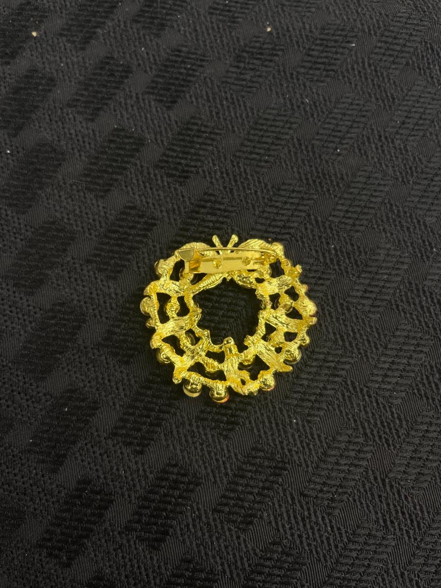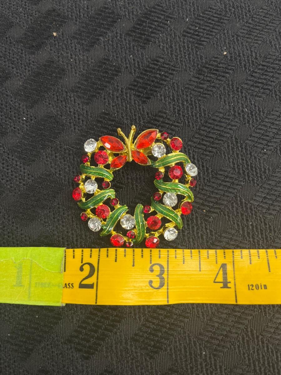 Christmas wreath red green enamel clear crystals vintage gold brooch pin