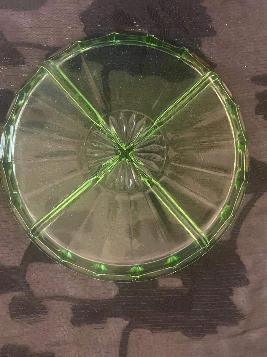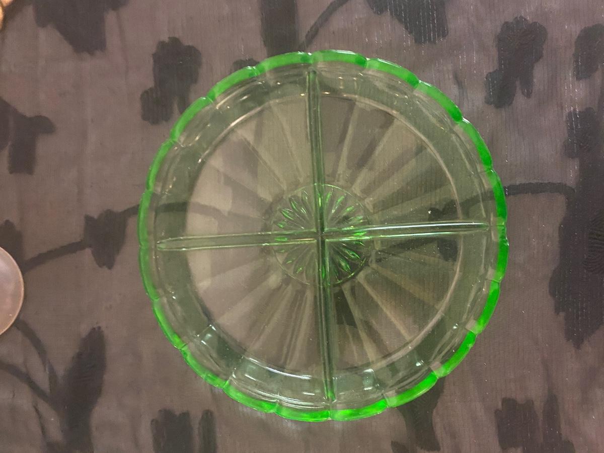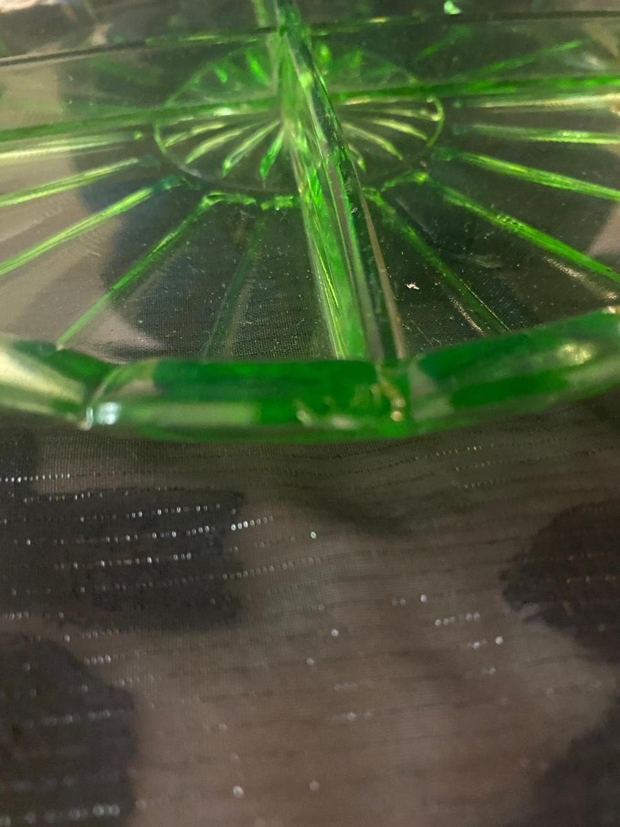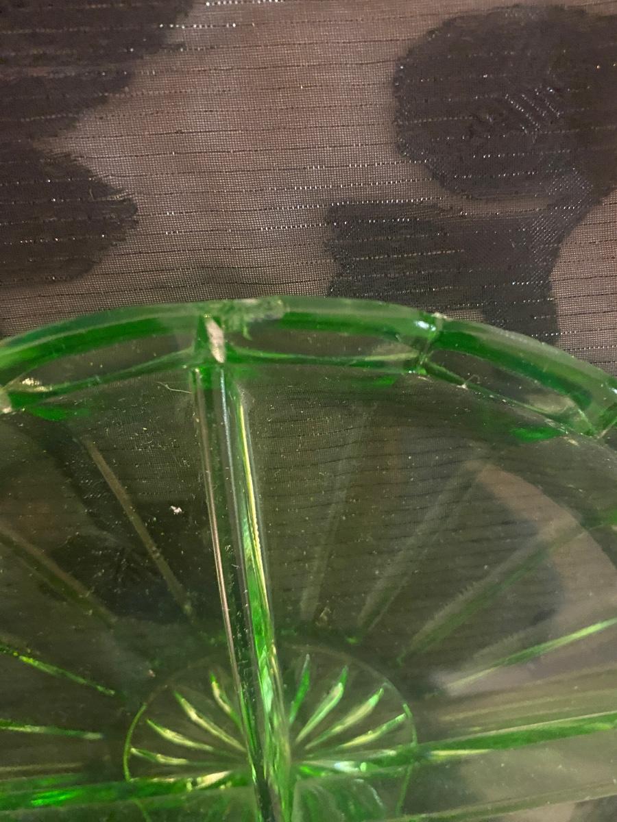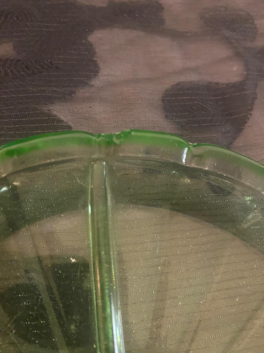 The uranium Green separated dish has a small chip that can be easily repaired if purchased. It is pictured
