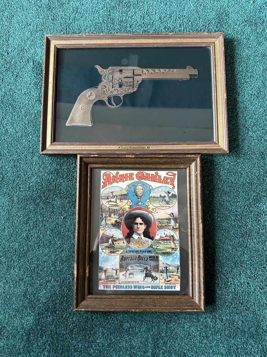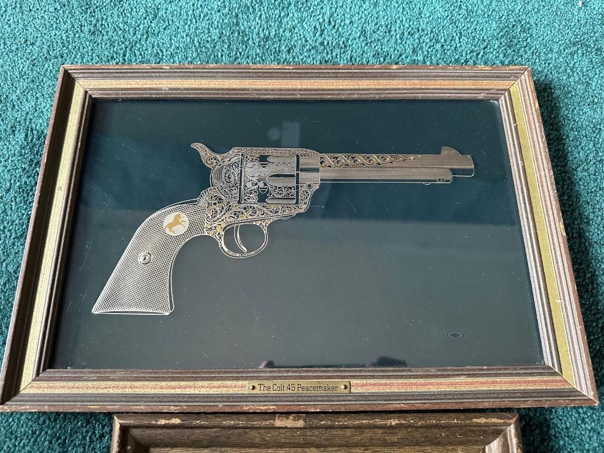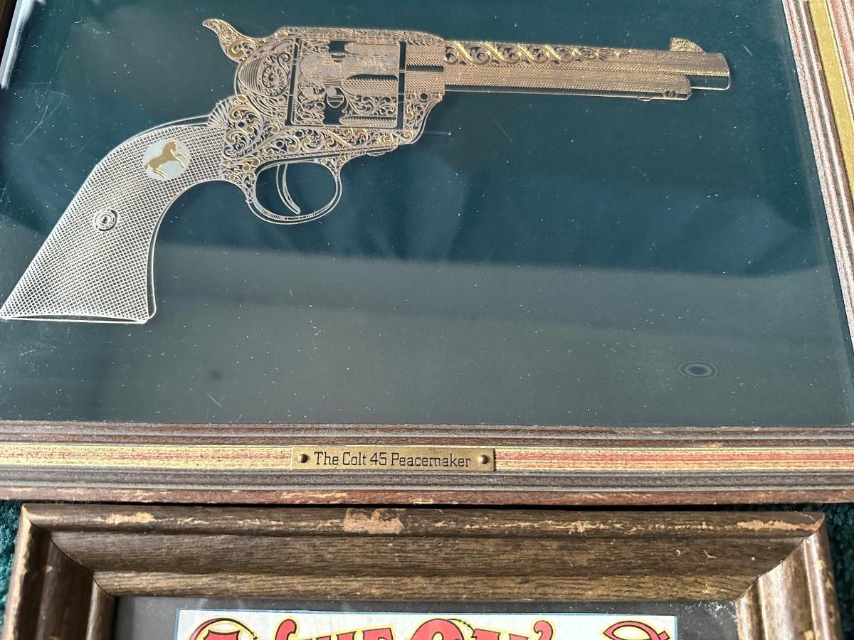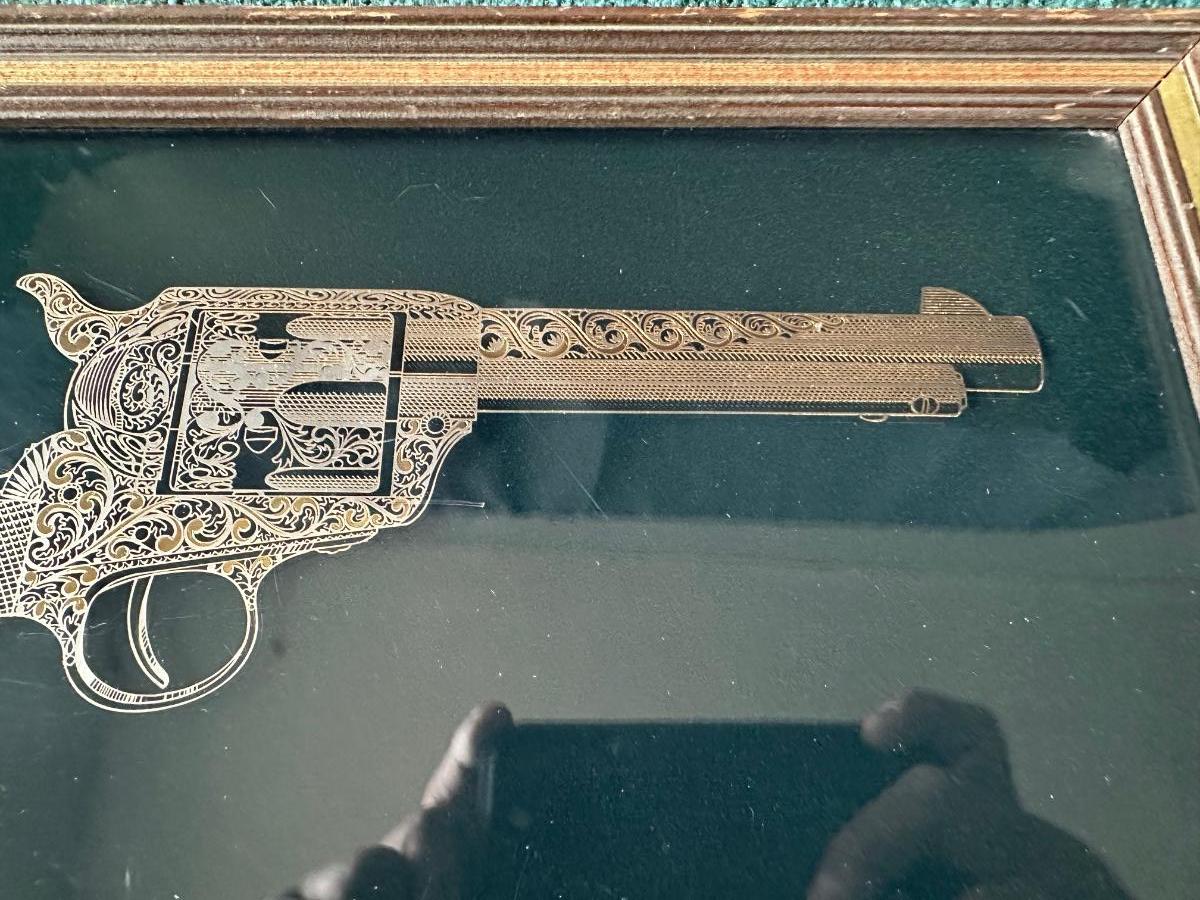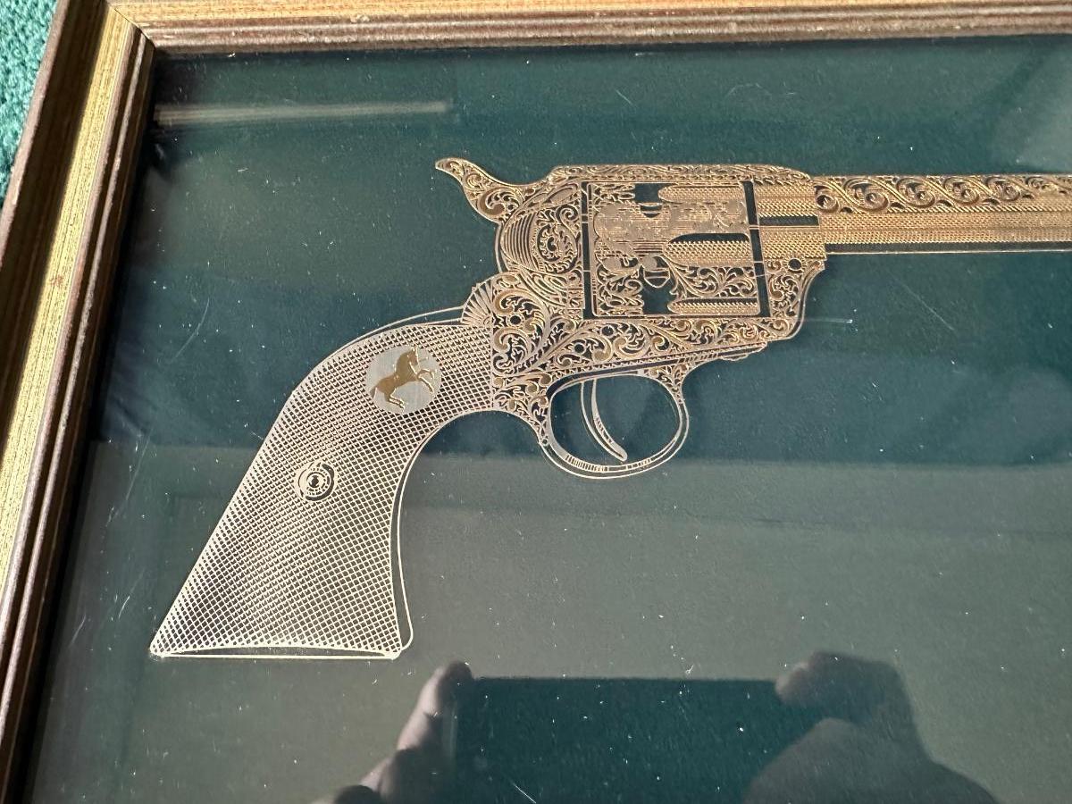 Beautiful picture of the Colt 45 Peacemaker, looks metallic gold and silver. Frame measures 10”H x 14-3/4”L