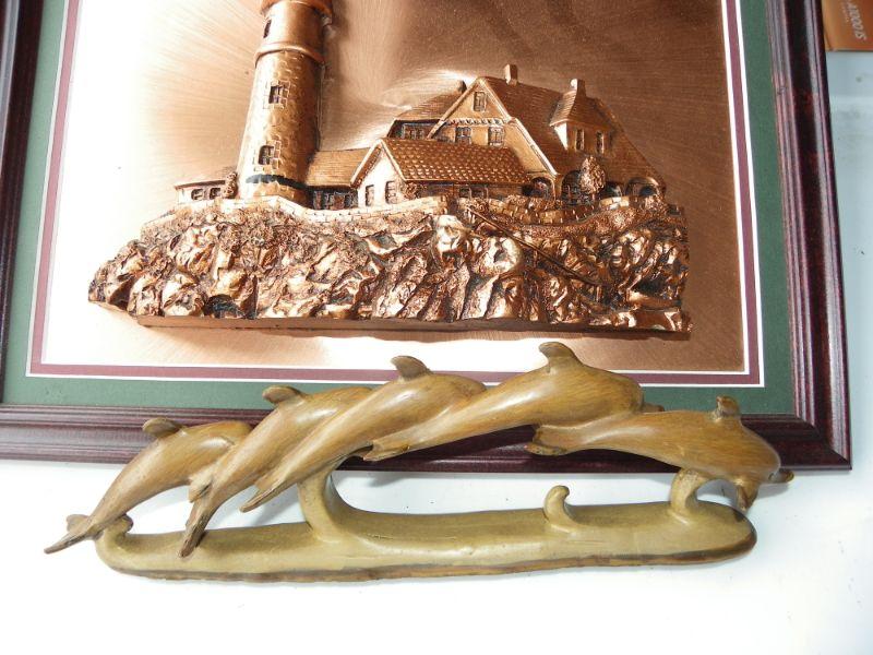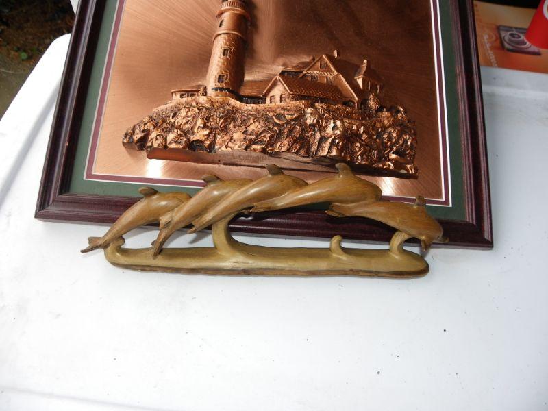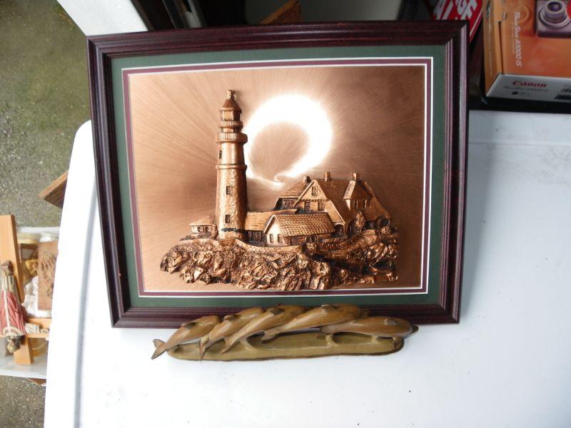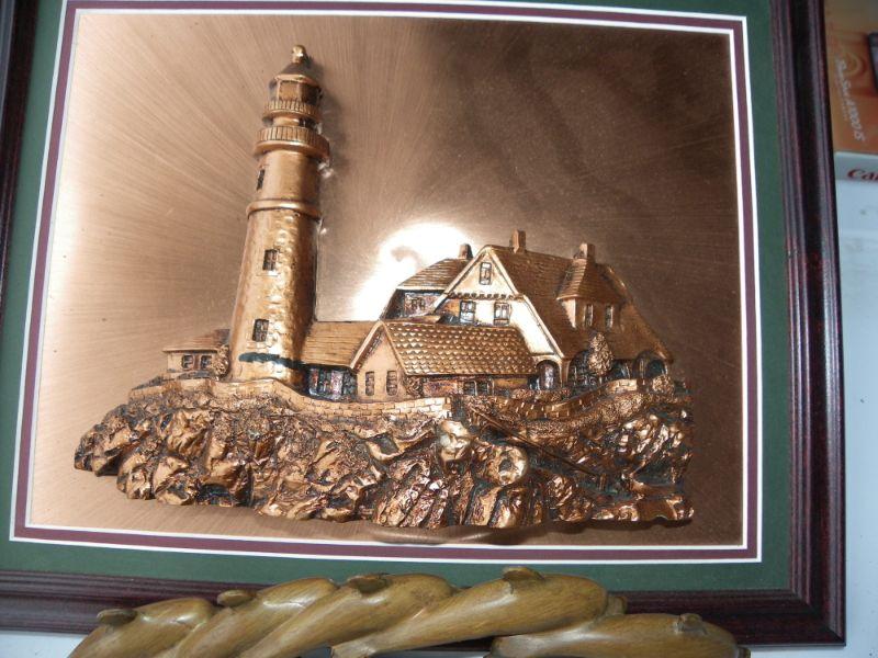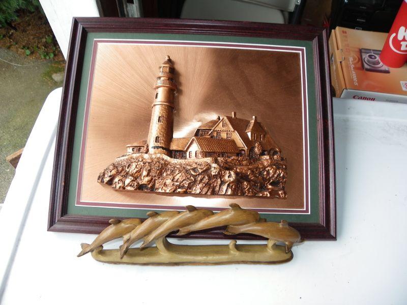 Beautiful Copper Light House portrait and wood dolphins.