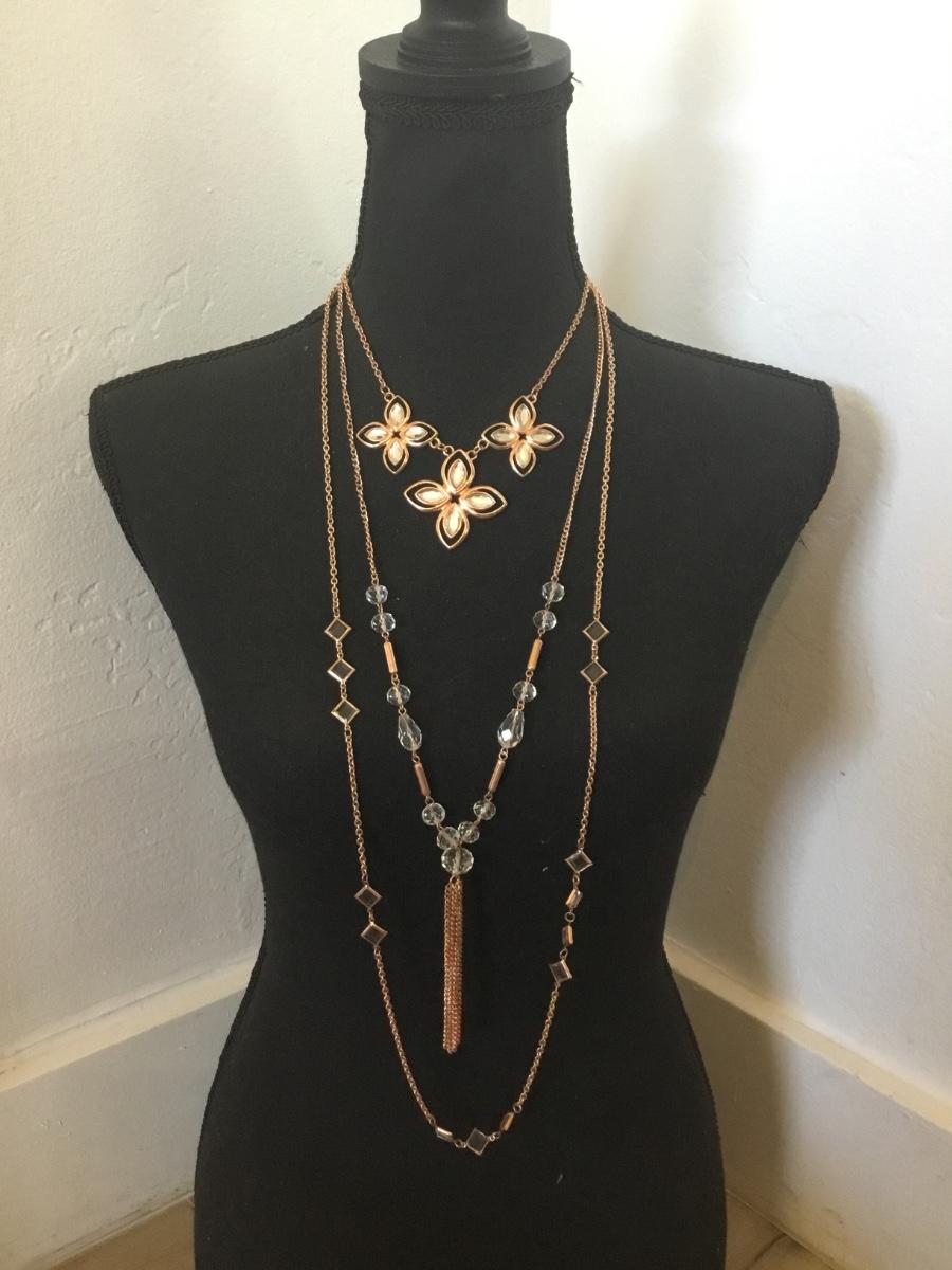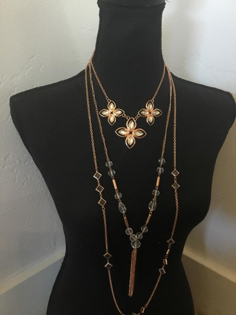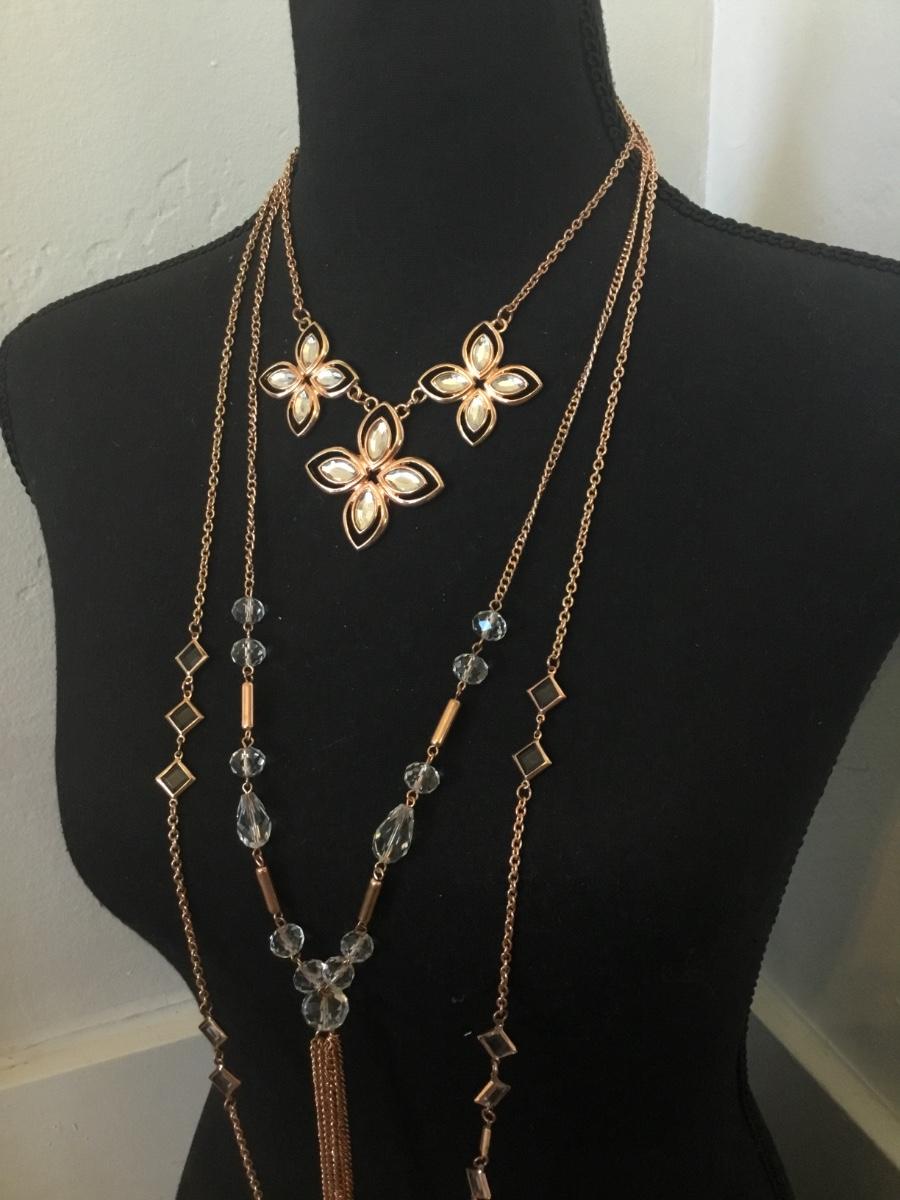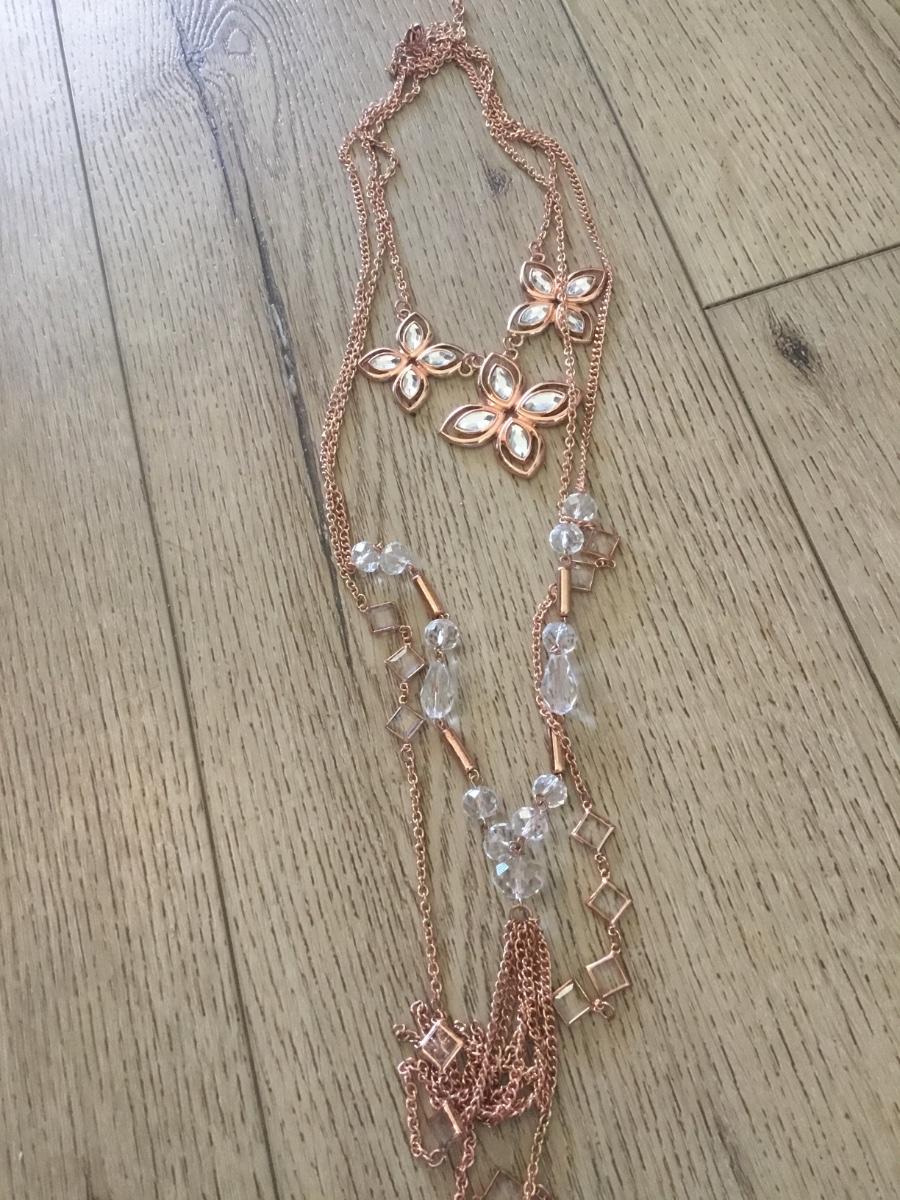 Beautiful, copper, toned or rose, gold, toned, crystal flower, statement, tassel necklace