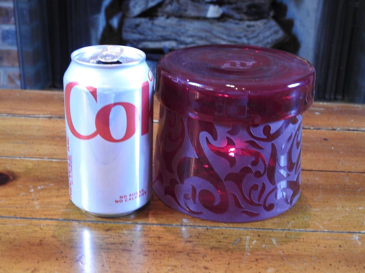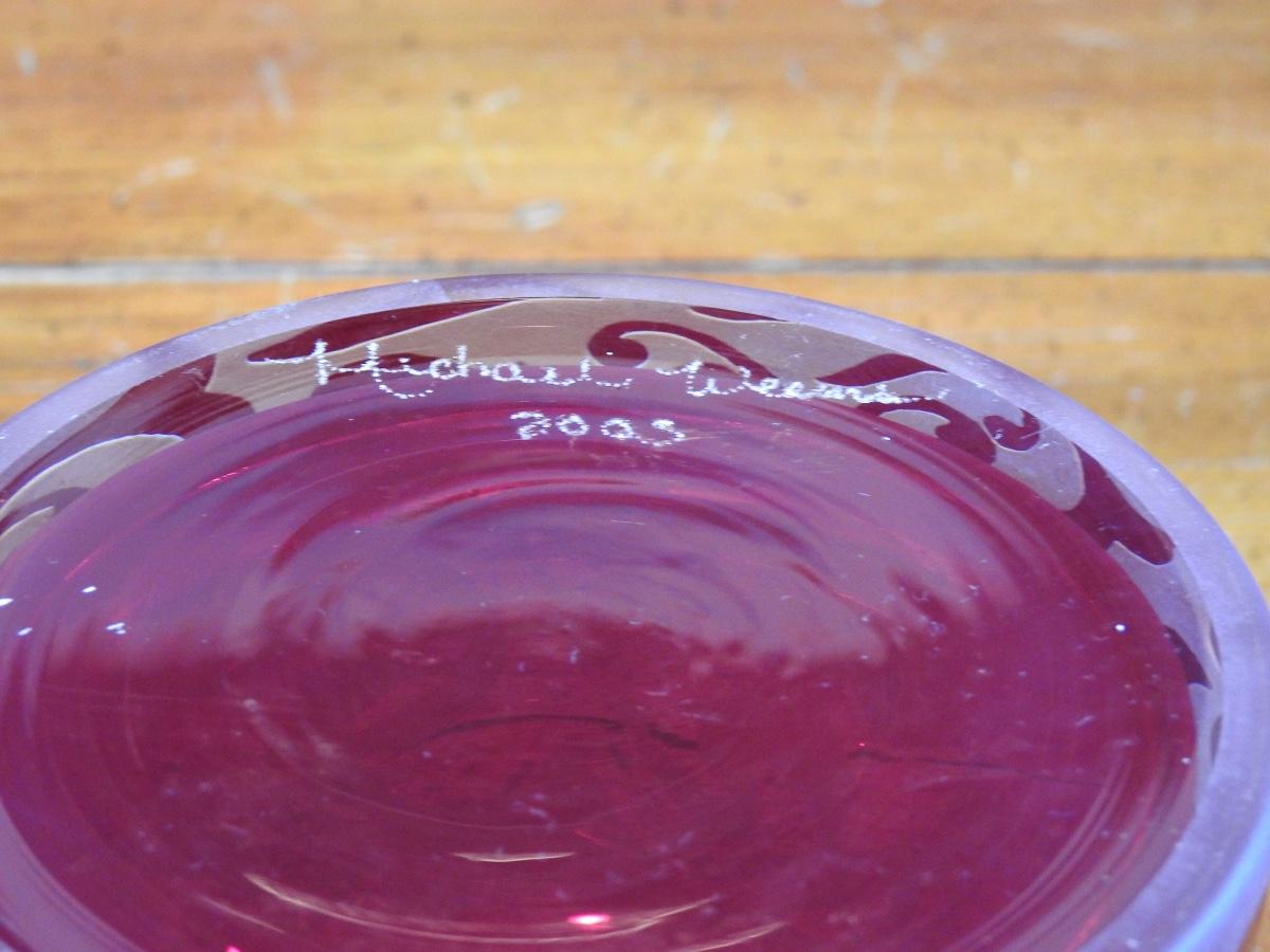 Beautiful unique handcrafted cranberry glass lidded jar signed by 2 artist and dated in great used condition