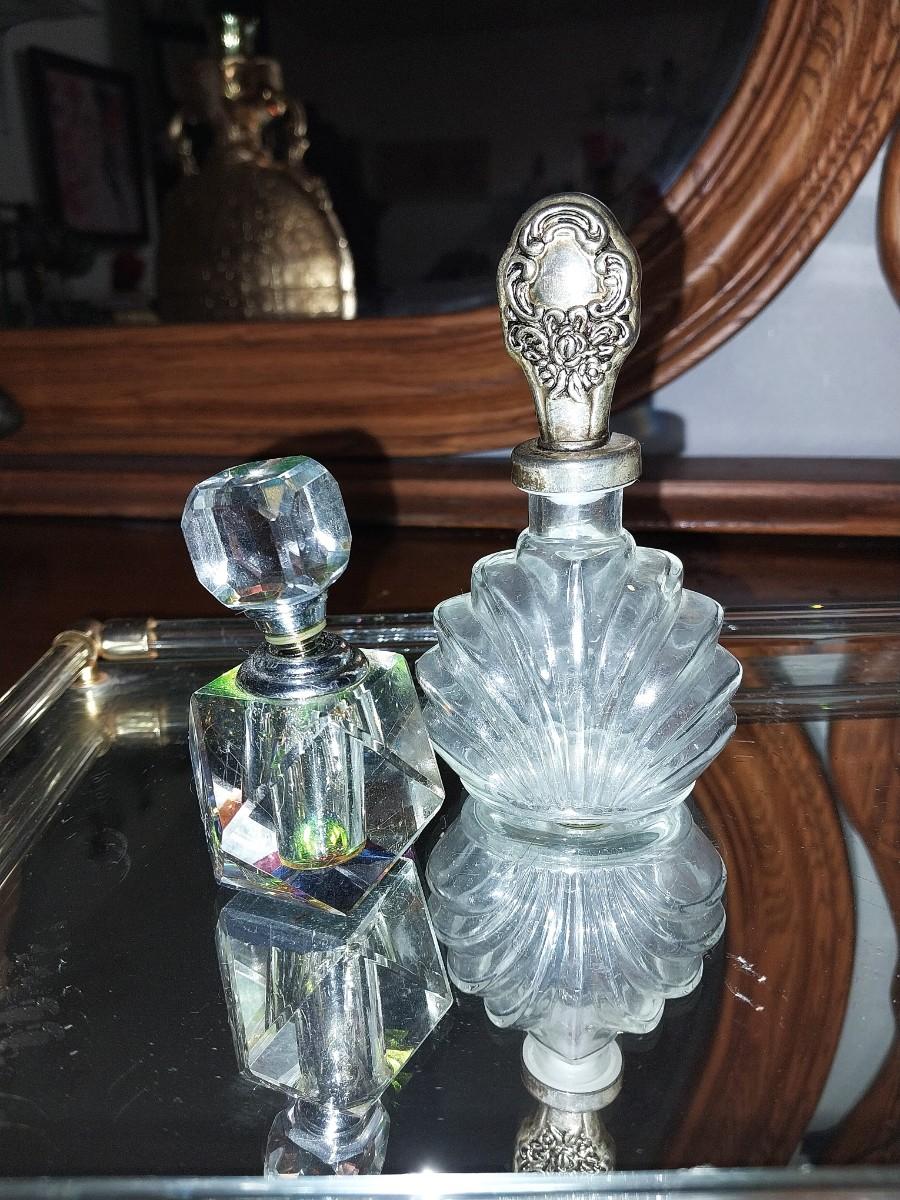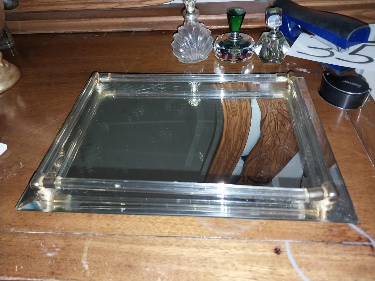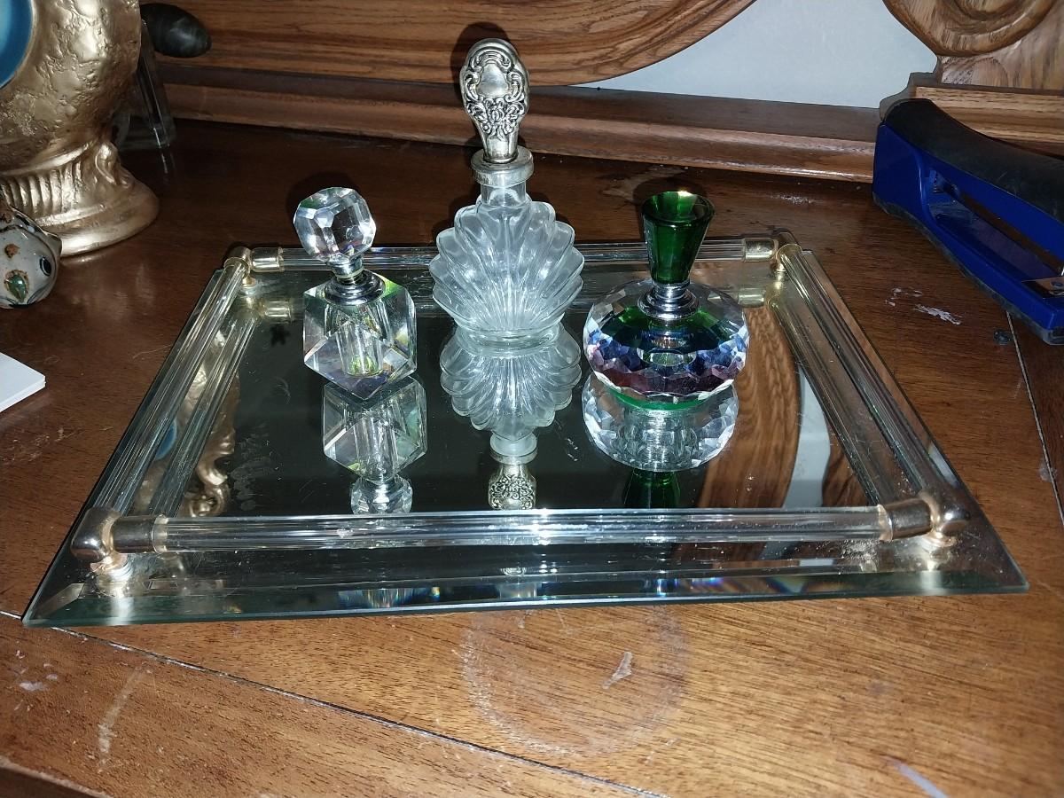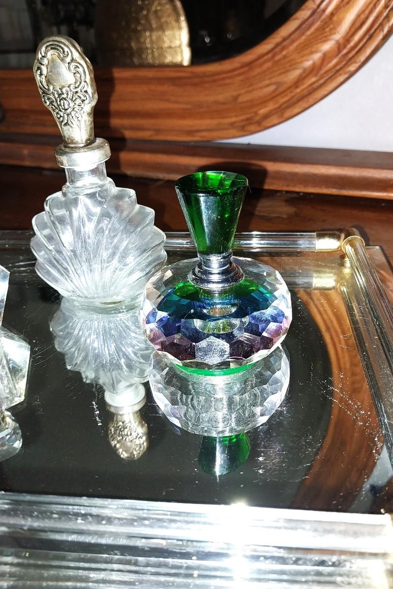 BEAUTIFUL CRYSTAL PURFUME BOTTLES AND MIRRORED VANITY TRAY