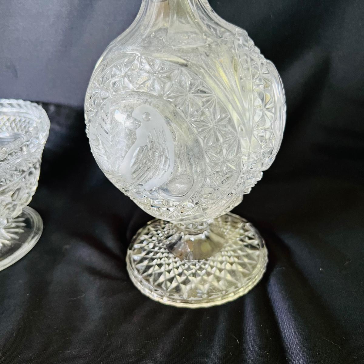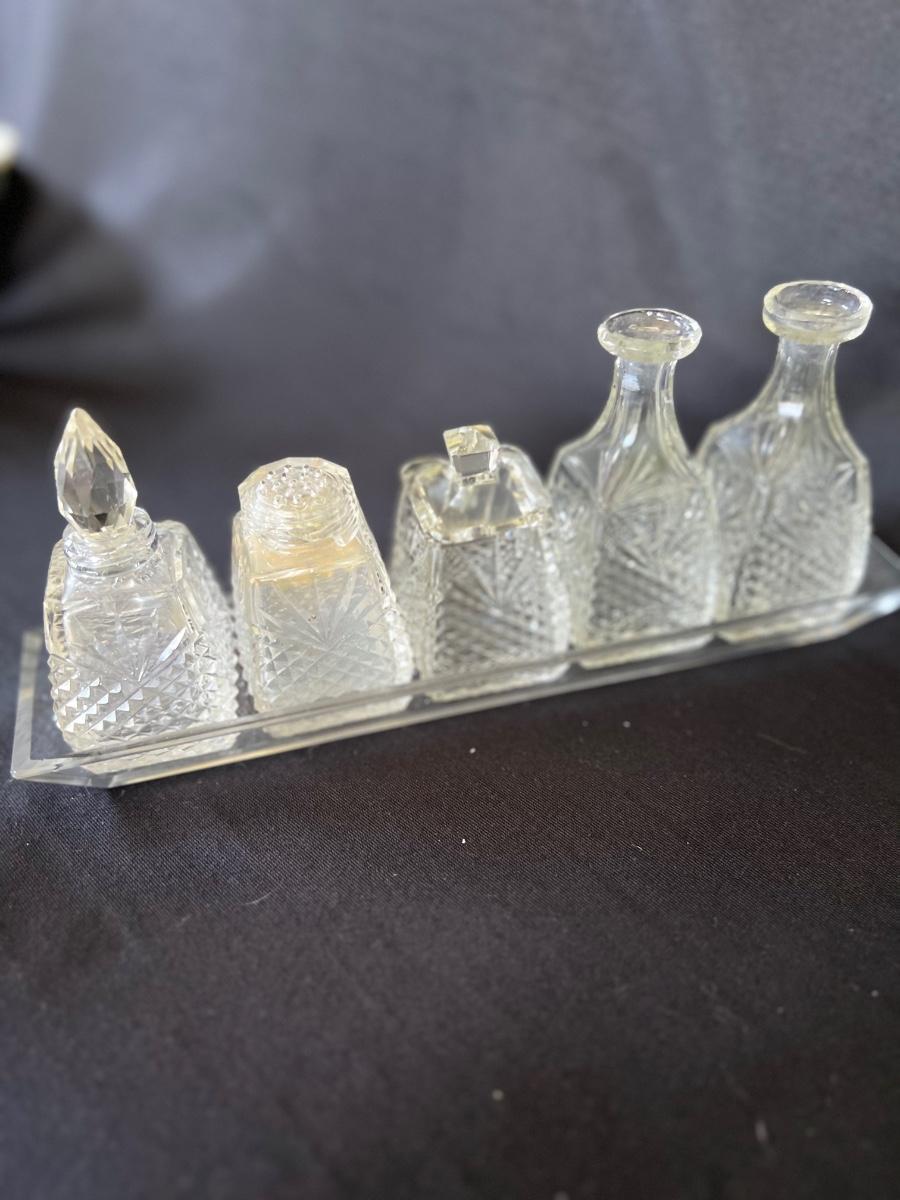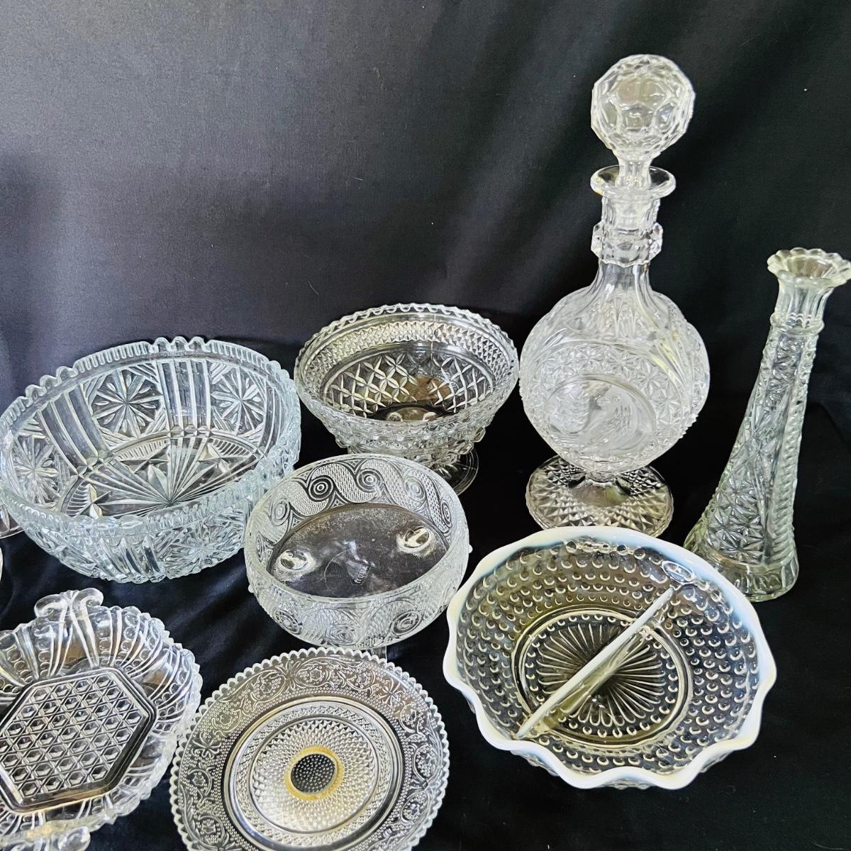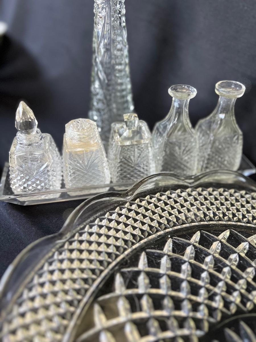 Any table will sparkle with this collection of beautiful glass/crystal pieces. Included in lot is a five piece miniature salt/pepper and oil/vinegar set measuring 10”long as displayed. Also included is a 13”platter, a decanter that measures 13”H, two vases, and a variety of eight glass candy dishes.
